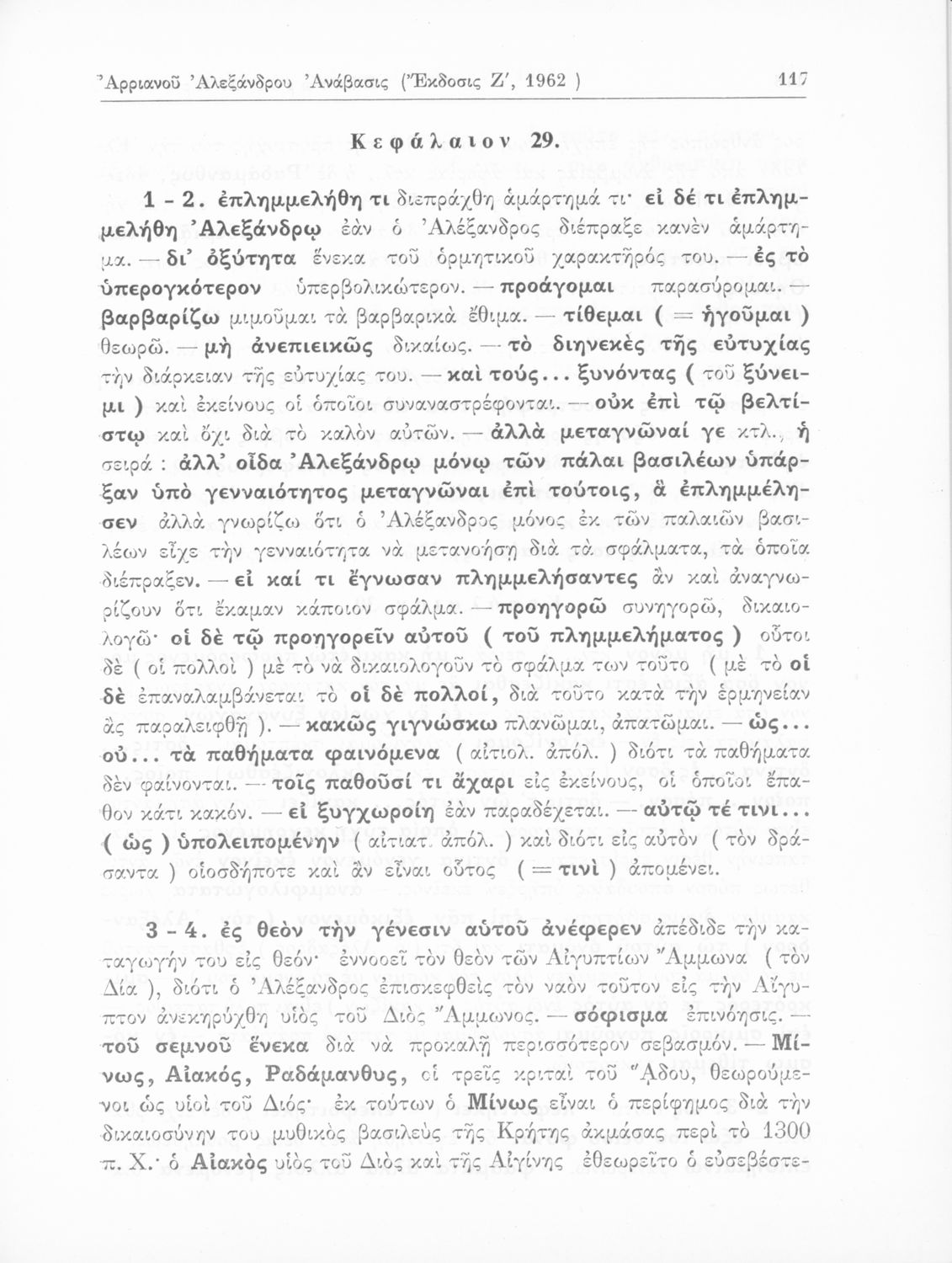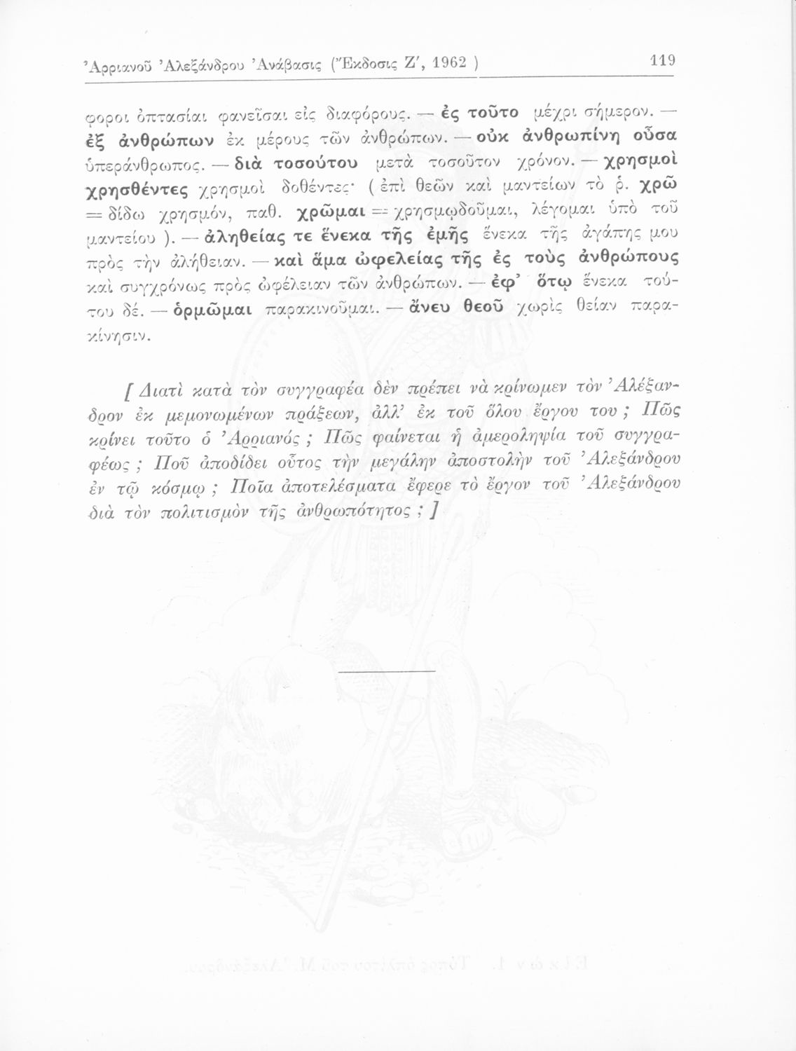 Σχολικό εγχειρίδιο Αρχαίων Ελληνικών που περιλαμβάνει αποσπάσματα από το έργο του Αρριανού Αλέξανδρου Ανάβασις και του Ηρόδοτου Ιστορίαι, ερμηνευτικές και λεξιλογικές παρατηρήσεις καθώς και τοπογραφικούς ...