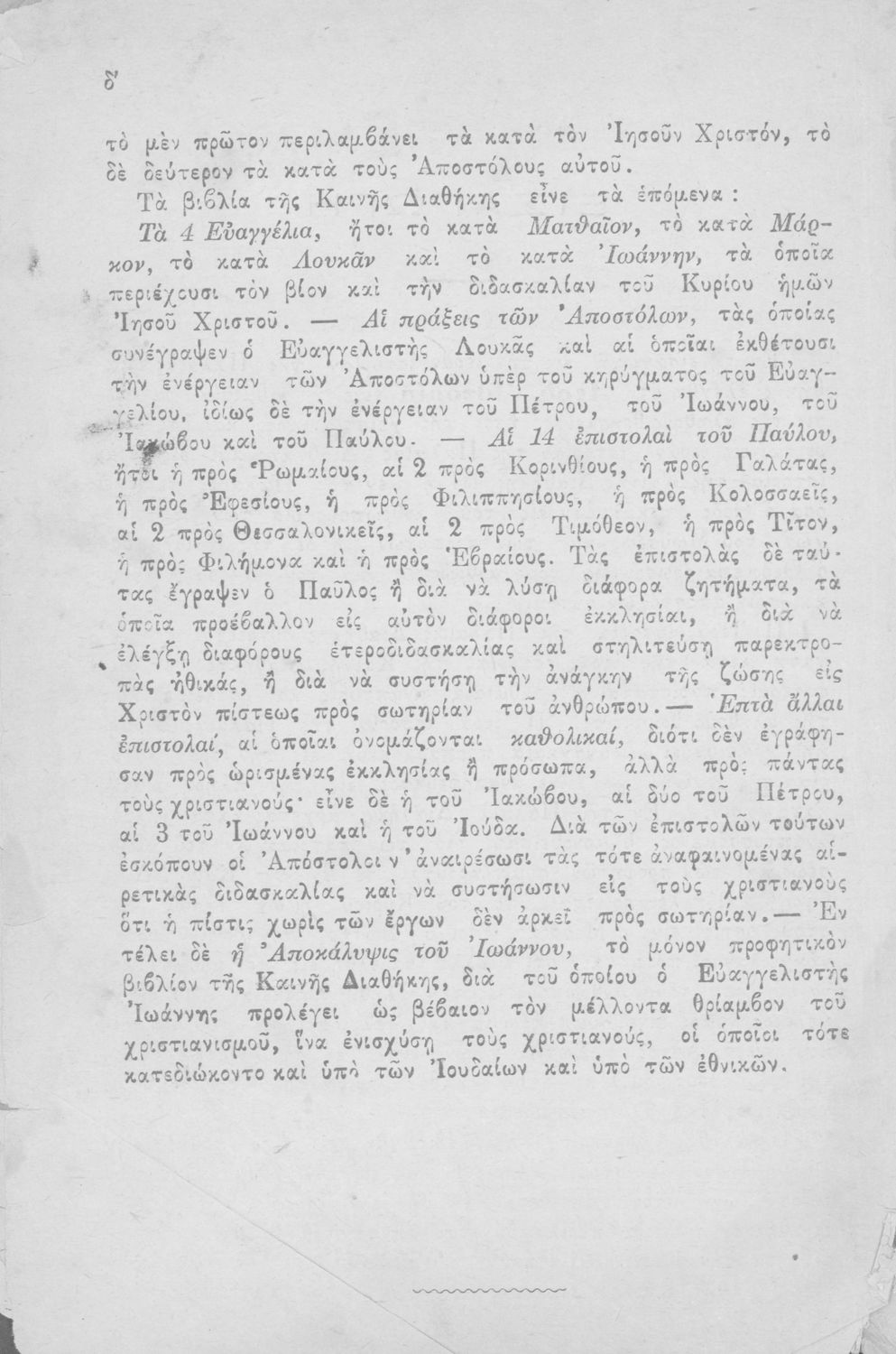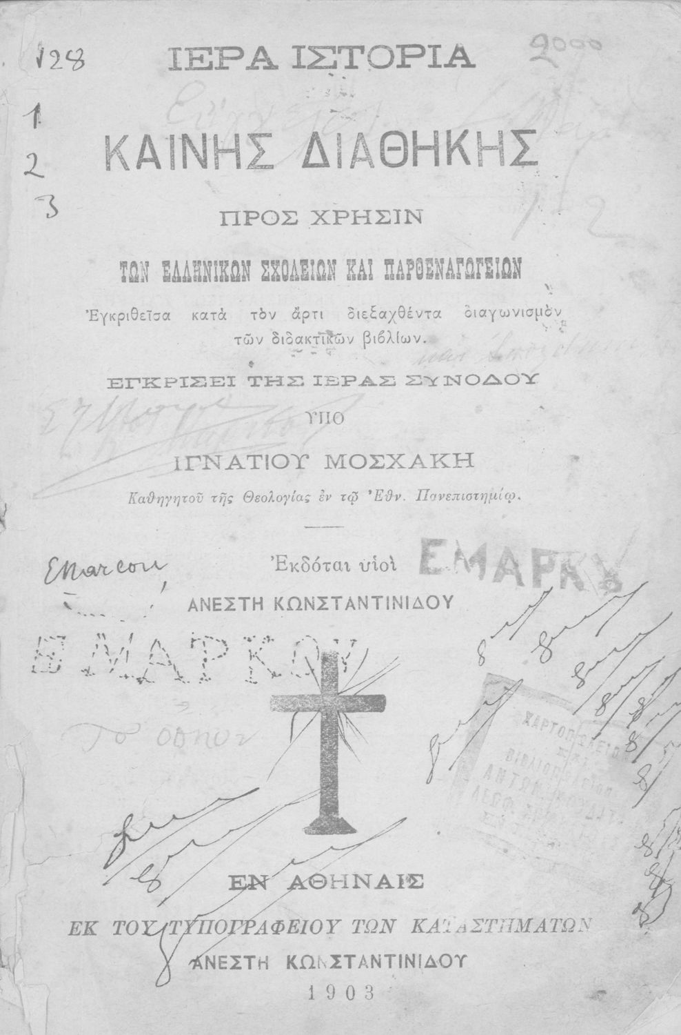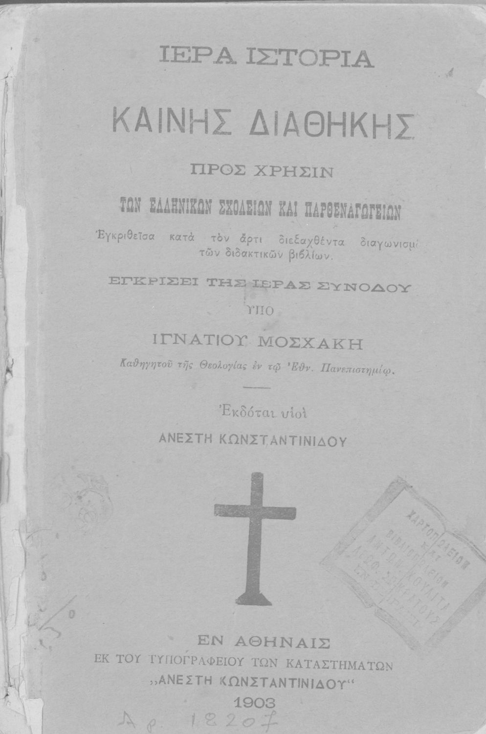 Σχολικό εγχειρίδιο Θρησκευτικών για τα Ελληνικά Σχολεία και τα Παρθεναγωγεία που αποτελεί μια εξιστόρηση της Καινής Διαθήκης από την γέννηση του Ιησού Χριστού ως το έργο των Αποστόλων