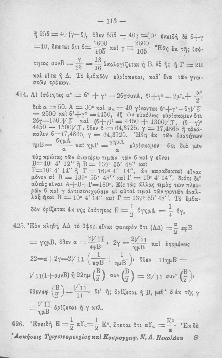 Ασκήσεις Τριγωνομετρίας και Κοσμογραφίας, ήτοι Λύσεις δια των εν τη Τριγωνομετρία και Κοσμογραφία Νικόλαου Δ. Νικολάου