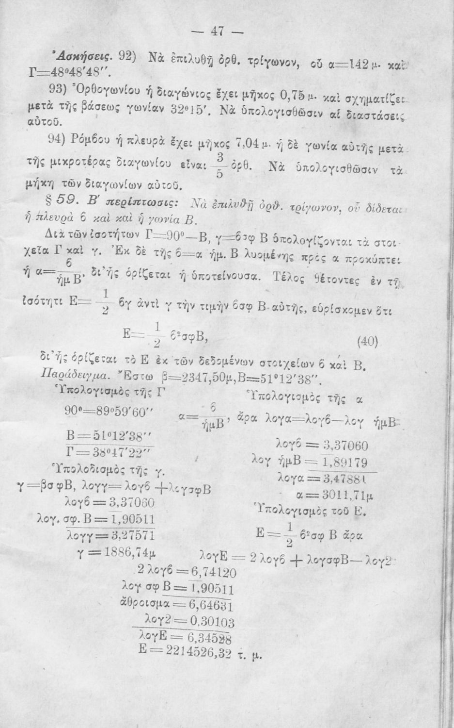 Σχολικό εγχειρίδιο Γεωμετρίας για τα Ελληνικά και Αστικά Σχολεία χωρισμένο σε Επιπεδομετρία και Στερεομετρία. Περιλαμβάνει προβλήματα και στοιχεία χωρομετρίας.