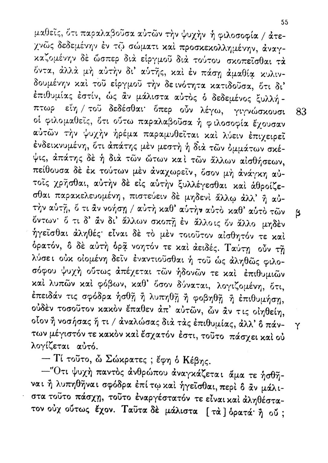 Σχολικό εγχειρίδιο Αρχαίων Ελληνικών της Γ΄ Λυκείου. Το βιβλίο περιέχει δύο έργα του Πλάτωνα, Φαίδων και Πρωταγόρας, όπου ο Σωκράτης συνομιλεί για την έννοια και τις ιδέες της φιλοσοφίας