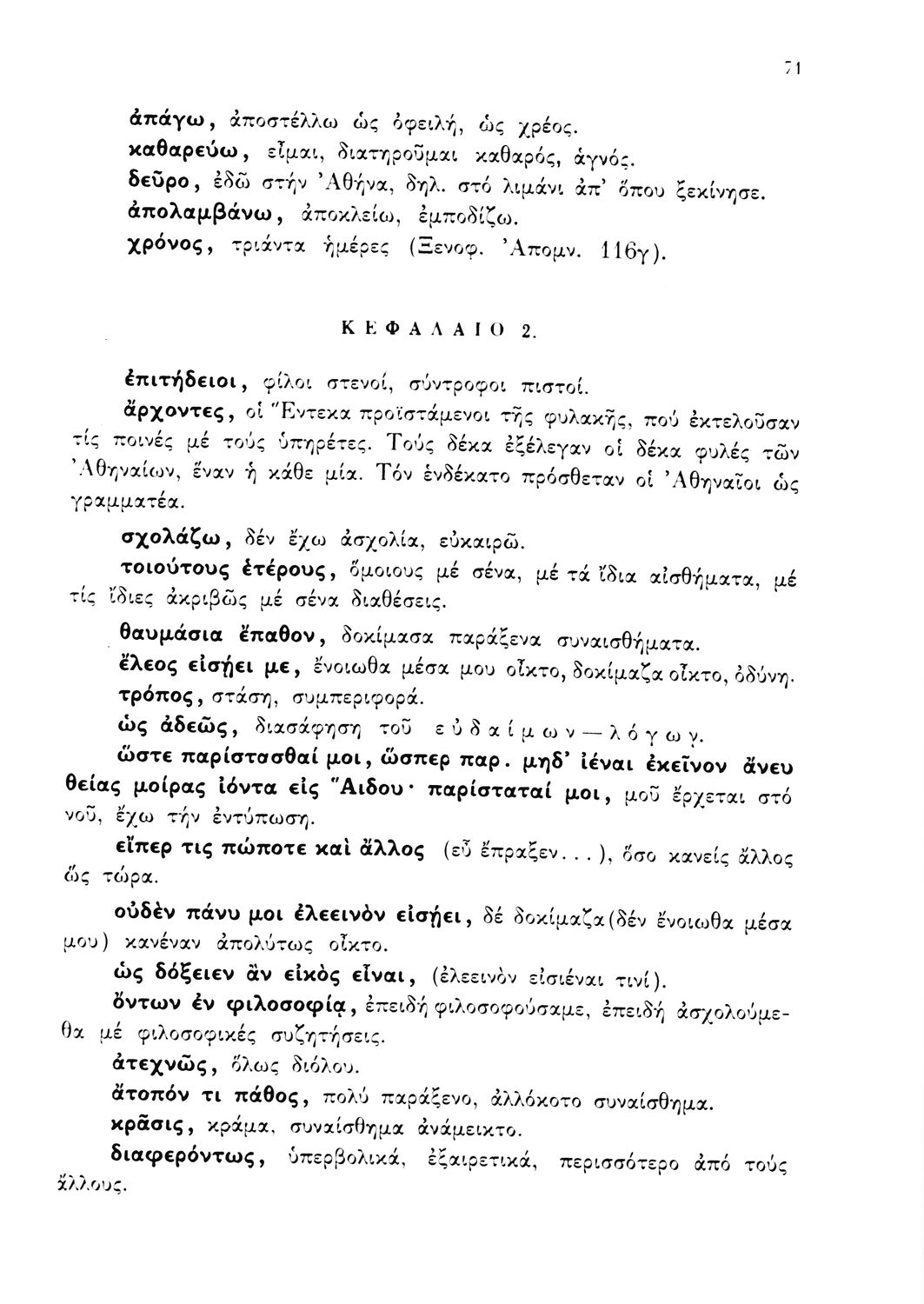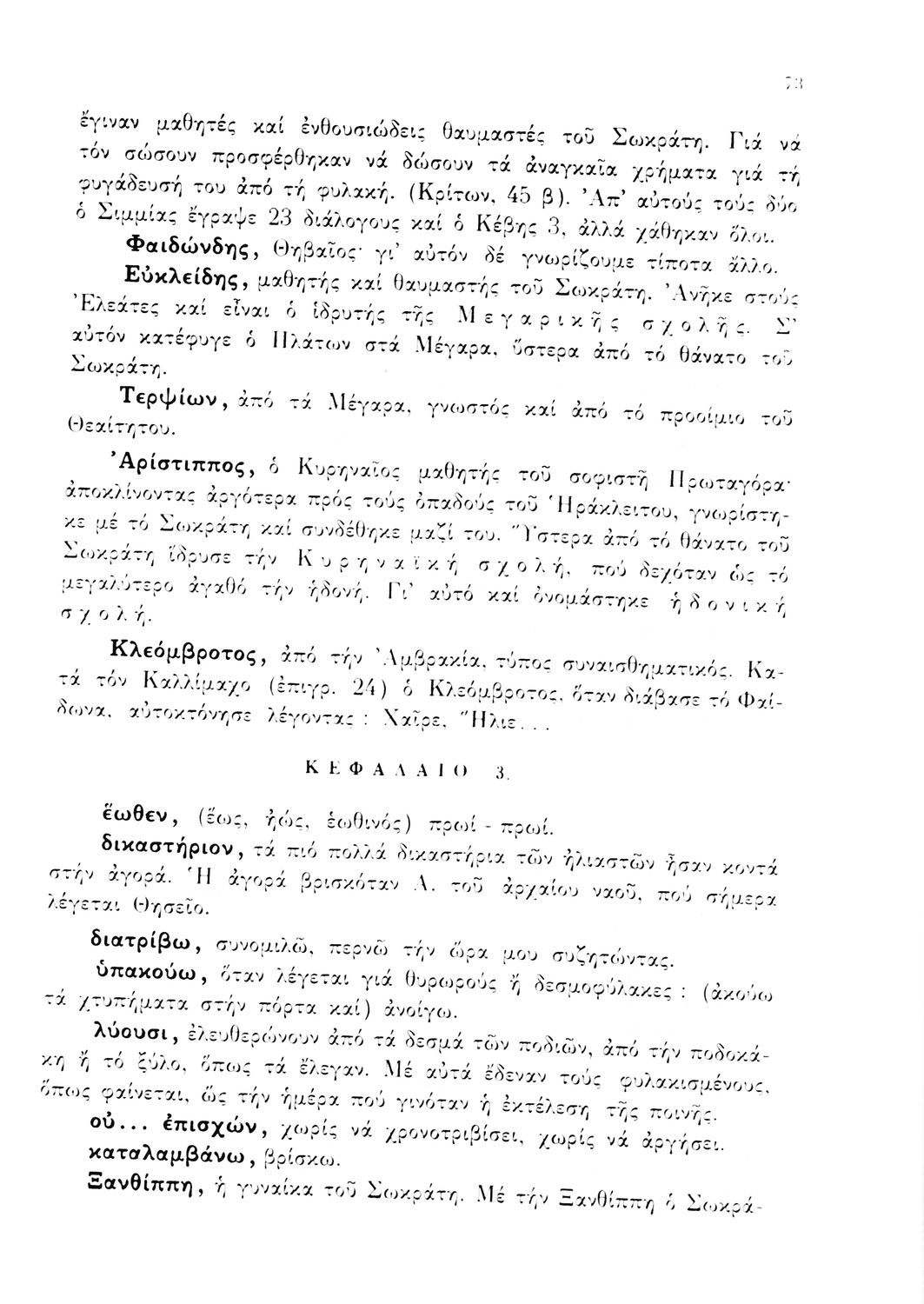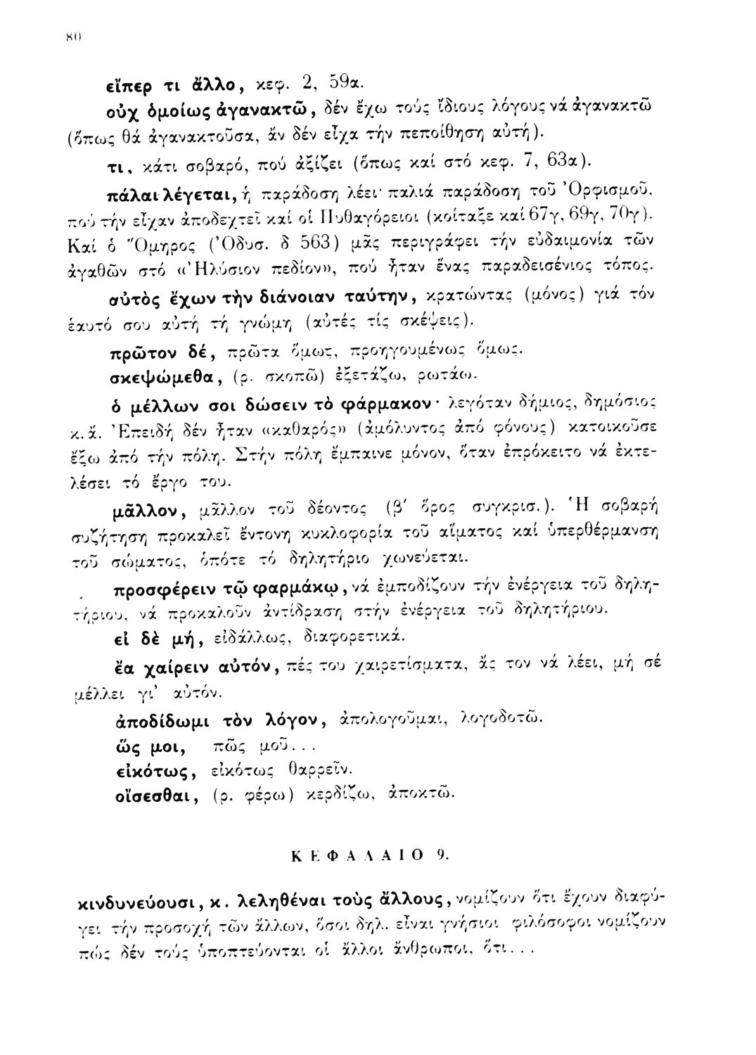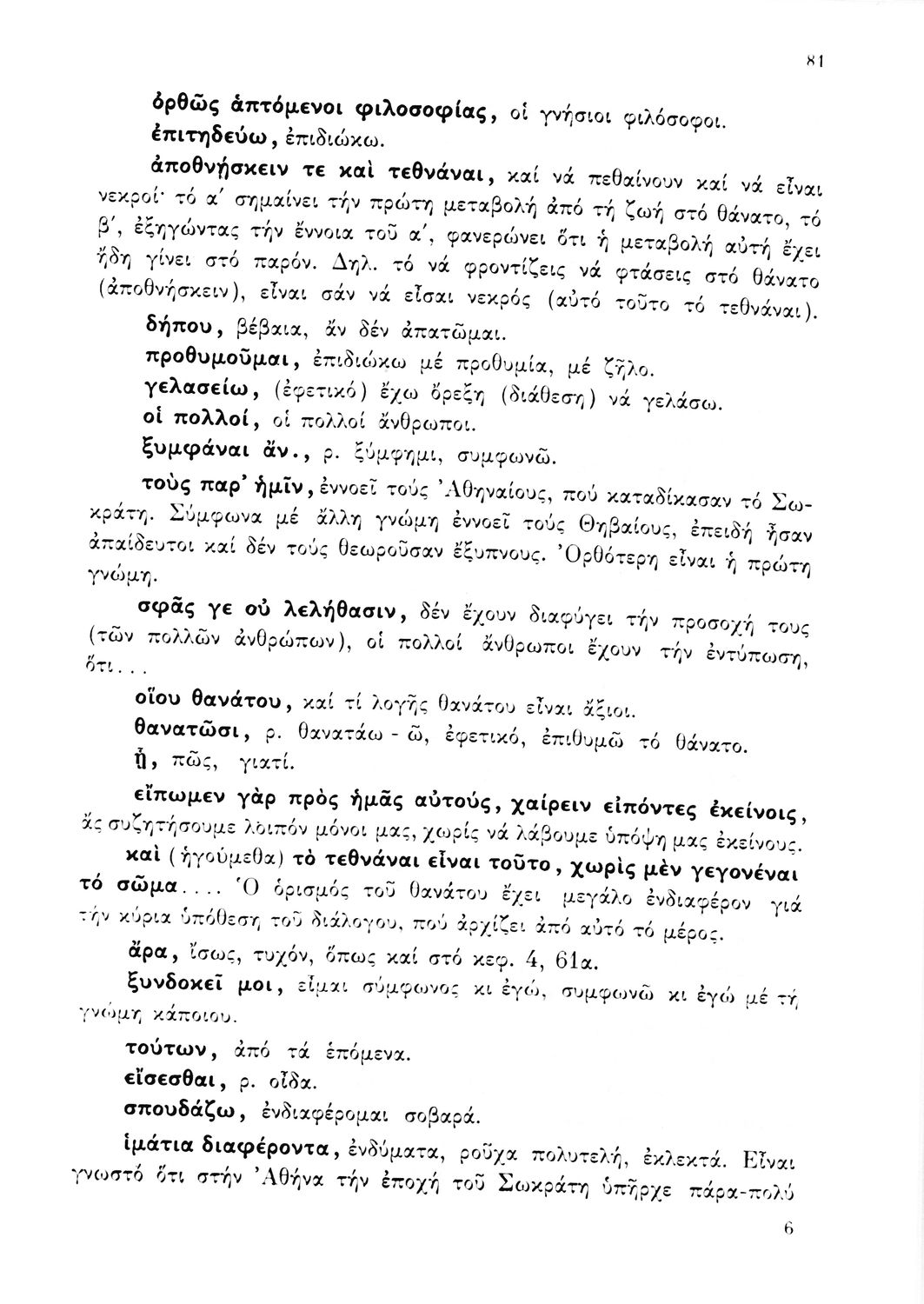 Σχολικό εγχειρίδιο για τις Τάξεις του Γυμνασίου για το μάθημα των Αρχαίων Ελληνικών. Περιλαμβάνει αποσπάσματα του αρχαίου κειμένου από τους διαλόγους του Πλάτωνα. Περιέχει μετάφραση ερμηνευτικά, πραγματολογικά