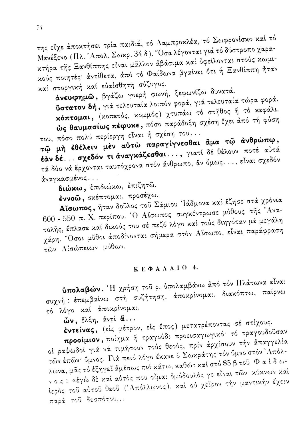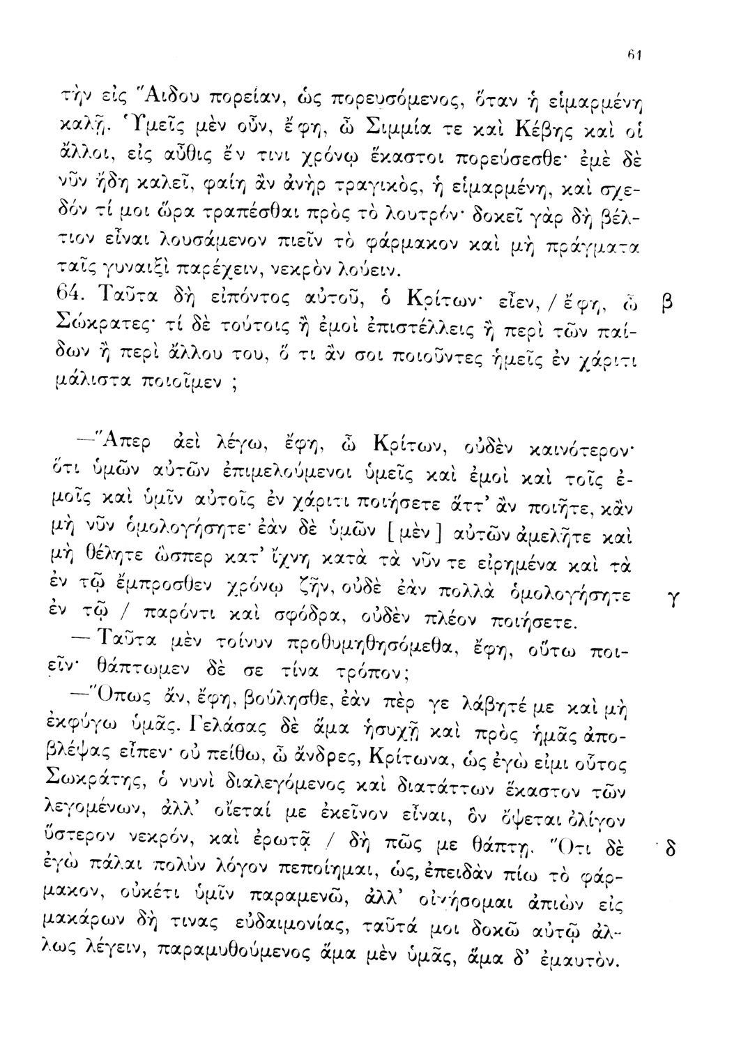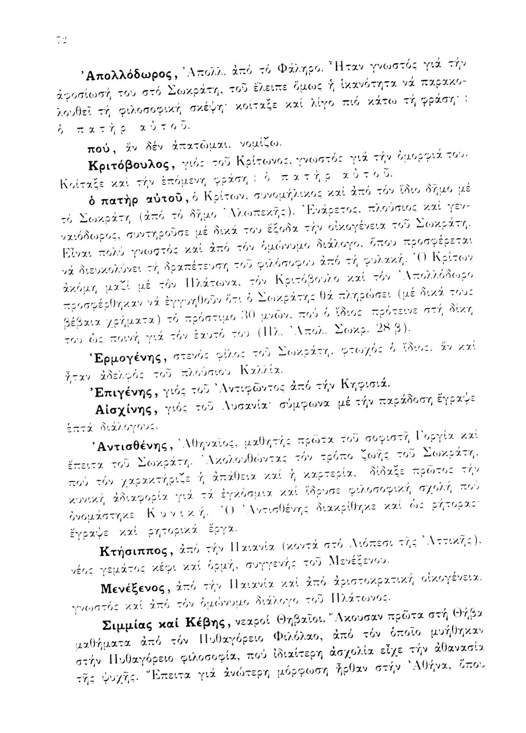 Σχολικό εγχειρίδιο για τις Τάξεις του Γυμνασίου για το μάθημα των Αρχαίων Ελληνικών. Περιλαμβάνει αποσπάσματα του αρχαίου κειμένου από τους διαλόγους του Πλάτωνα. Περιέχει μετάφραση ερμηνευτικά, πραγματολογικά