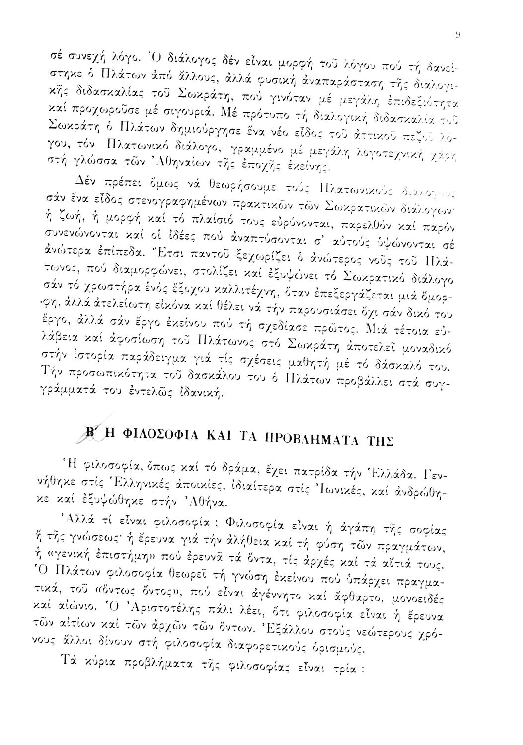 Σχολικό εγχειρίδιο Αρχαίων Ελληνικών Γυμνασίου που περιλαμβάνει αποσπάσματα από τους διαλόγους του Πλάτωνα, ερμηνευτικά και πραγματολογικά σχόλια και λεξιλογικές παρατηρήσεις.