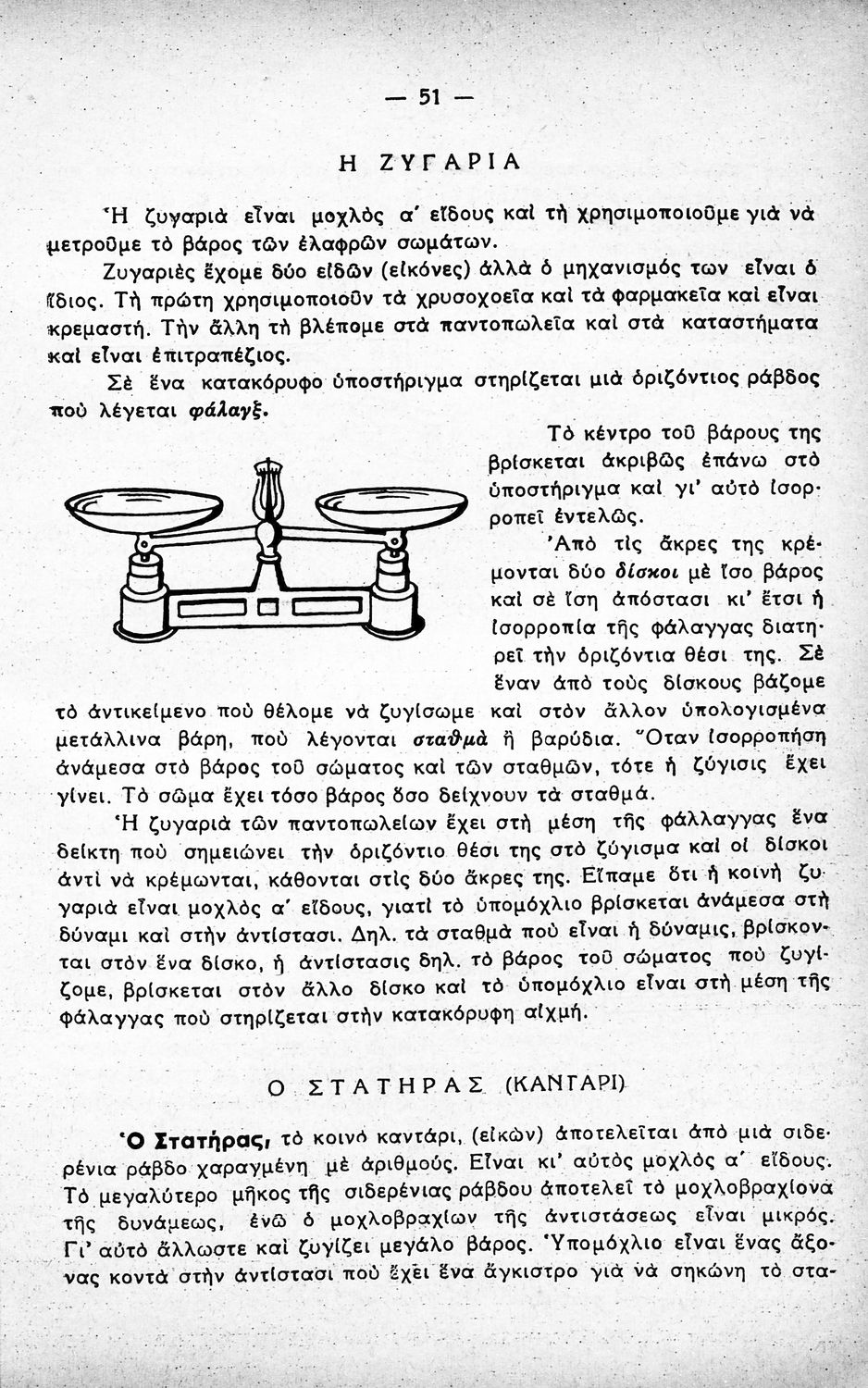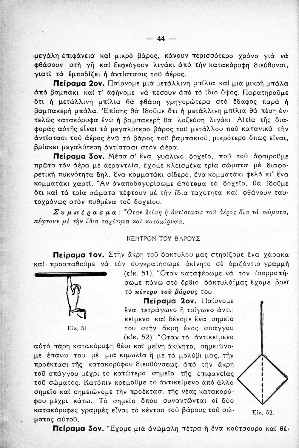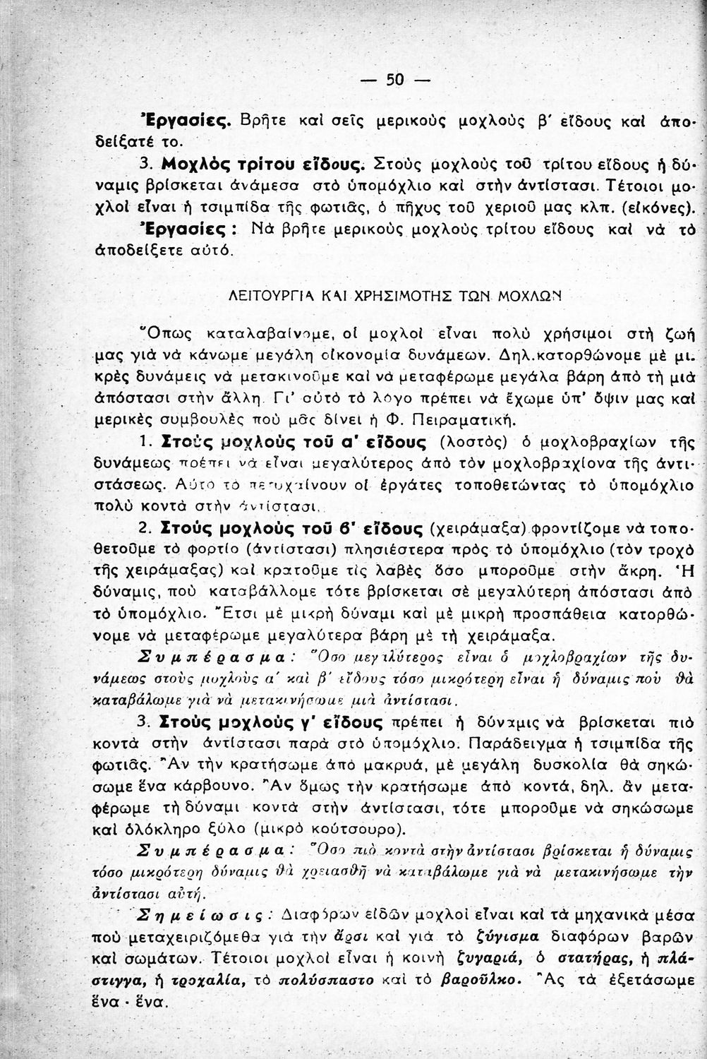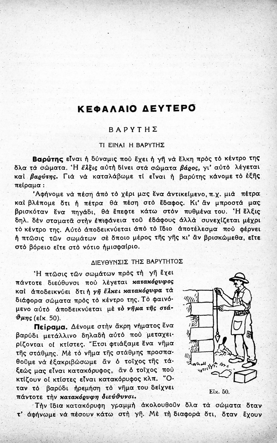 Βαθμίδα εκπαίδευσης: Πρωτοβάθμια Τάξη: Ε' Δημοτικού Μάθημα: Φυσική Γλώσσα: Απλή καθαρεύουσα Παρουσίαση περιεχομένου: Μαθητικό βοήθημα της Ε΄ Δημοτικού για το μάθημα της Φυσικής. Παρέχει βασικές γνώσεις της Φυσικής επιστήμης και της Χημείας. Αναλύει τις ιδιότητες των σωμάτων, καθώς και της θερμότητας, του ηλεκτρισμού και του μαγνητισμού, την υδροστατική, την βαρύτητα και την αεροστατική. Σχετικά με τη χημεία αναφέρεται στα μέταλλα, στα οξέα, τις βάσεις, τα άλατα. Αναφέρεται στην πρακτική εφαρμογή της φυσικής και της χημείας στην καθημερινότητά. Επίσης, περιλαμβάνει πολλά από τα όργανα, που χρησιμοποιούνται στη φυσική, και τη χημεία. Περιέχει εικόνες και σχεδιαγράμματα τα οποία βοηθούν τη διδασκαλία. |