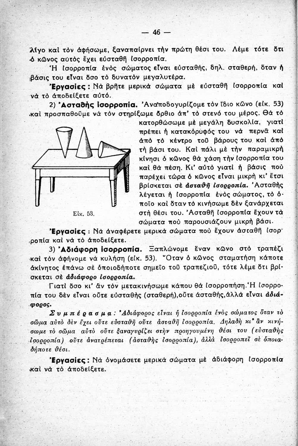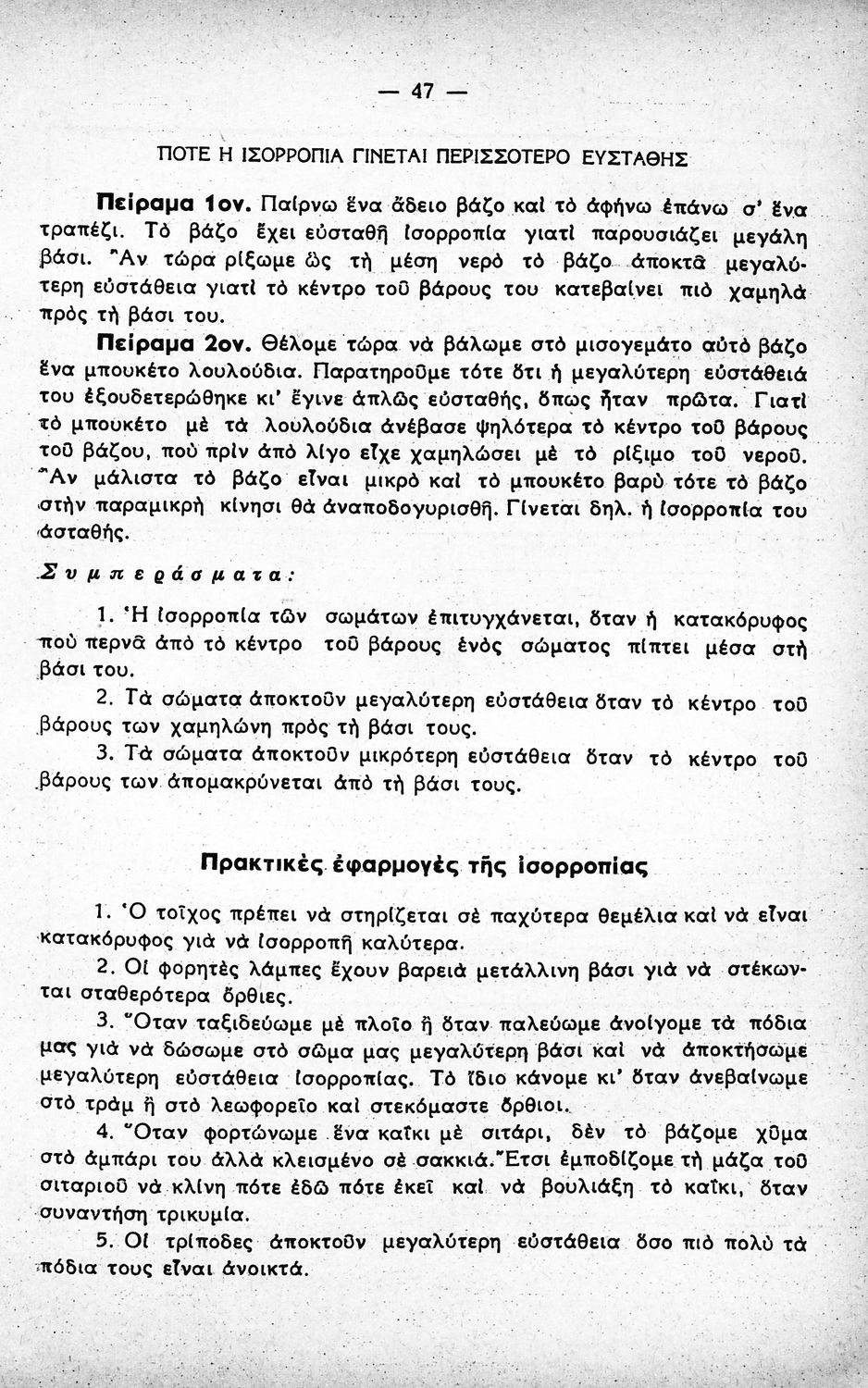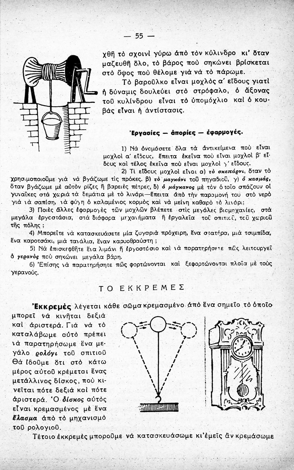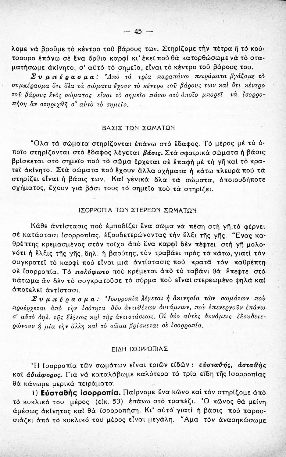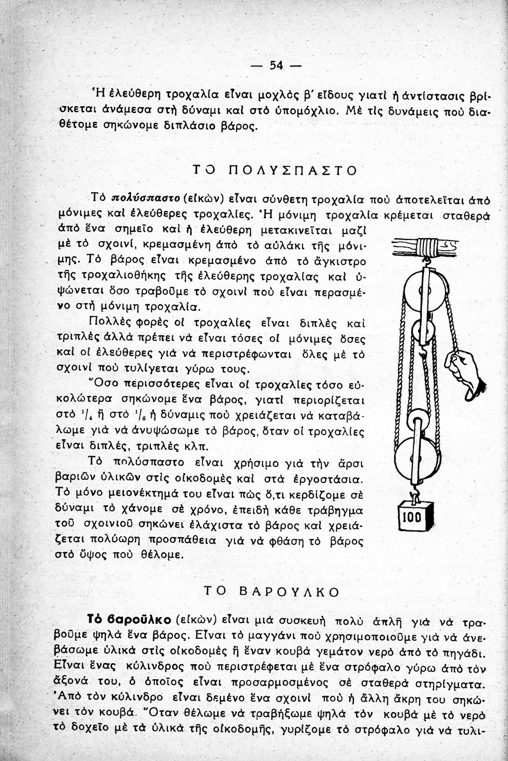 Βαθμίδα εκπαίδευσης: Πρωτοβάθμια Τάξη: Ε' Δημοτικού Μάθημα: Φυσική Γλώσσα: Απλή καθαρεύουσα Παρουσίαση περιεχομένου: Μαθητικό βοήθημα της Ε΄ Δημοτικού για το μάθημα της Φυσικής. Παρέχει βασικές γνώσεις της Φυσικής επιστήμης και της Χημείας. Αναλύει τις ιδιότητες των σωμάτων, καθώς και της θερμότητας, του ηλεκτρισμού και του μαγνητισμού, την υδροστατική, την βαρύτητα και την αεροστατική. Σχετικά με τη χημεία αναφέρεται στα μέταλλα, στα οξέα, τις βάσεις, τα άλατα. Αναφέρεται στην πρακτική εφαρμογή της φυσικής και της χημείας στην καθημερινότητά. Επίσης, περιλαμβάνει πολλά από τα όργανα, που χρησιμοποιούνται στη φυσική, και τη χημεία. Περιέχει εικόνες και σχεδιαγράμματα τα οποία βοηθούν τη διδασκαλία. |