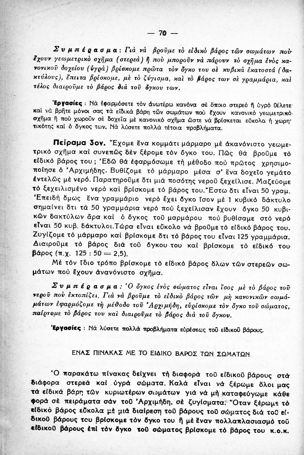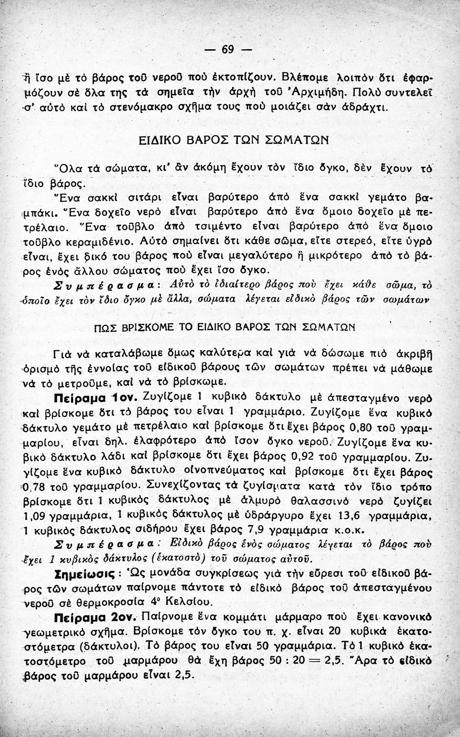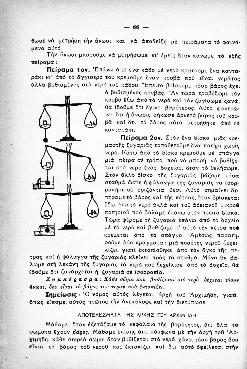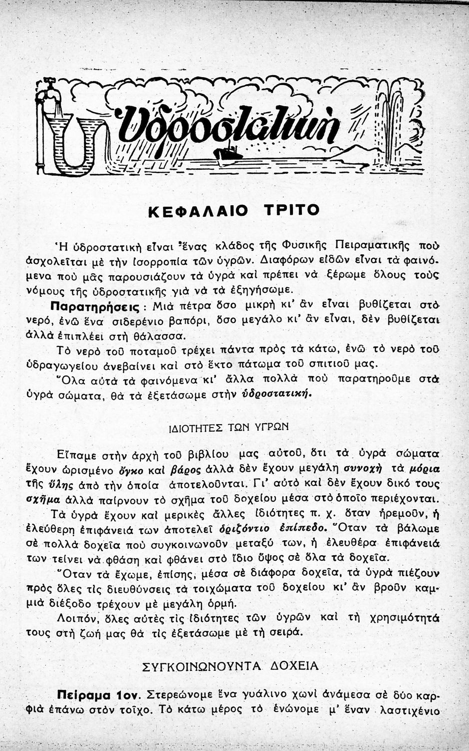 Βαθμίδα εκπαίδευσης: Πρωτοβάθμια Τάξη: Ε' Δημοτικού Μάθημα: Φυσική Γλώσσα: Απλή καθαρεύουσα Παρουσίαση περιεχομένου: Μαθητικό βοήθημα της Ε΄ Δημοτικού για το μάθημα της Φυσικής. Παρέχει βασικές γνώσεις της Φυσικής επιστήμης και της Χημείας. Αναλύει τις ιδιότητες των σωμάτων, καθώς και της θερμότητας, του ηλεκτρισμού και του μαγνητισμού, την υδροστατική, την βαρύτητα και την αεροστατική. Σχετικά με τη χημεία αναφέρεται στα μέταλλα, στα οξέα, τις βάσεις, τα άλατα. Αναφέρεται στην πρακτική εφαρμογή της φυσικής και της χημείας στην καθημερινότητά. Επίσης, περιλαμβάνει πολλά από τα όργανα, που χρησιμοποιούνται στη φυσική, και τη χημεία. Περιέχει εικόνες και σχεδιαγράμματα τα οποία βοηθούν τη διδασκαλία. |
