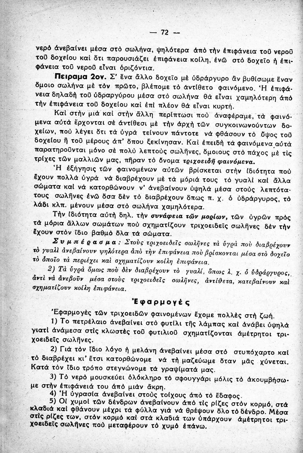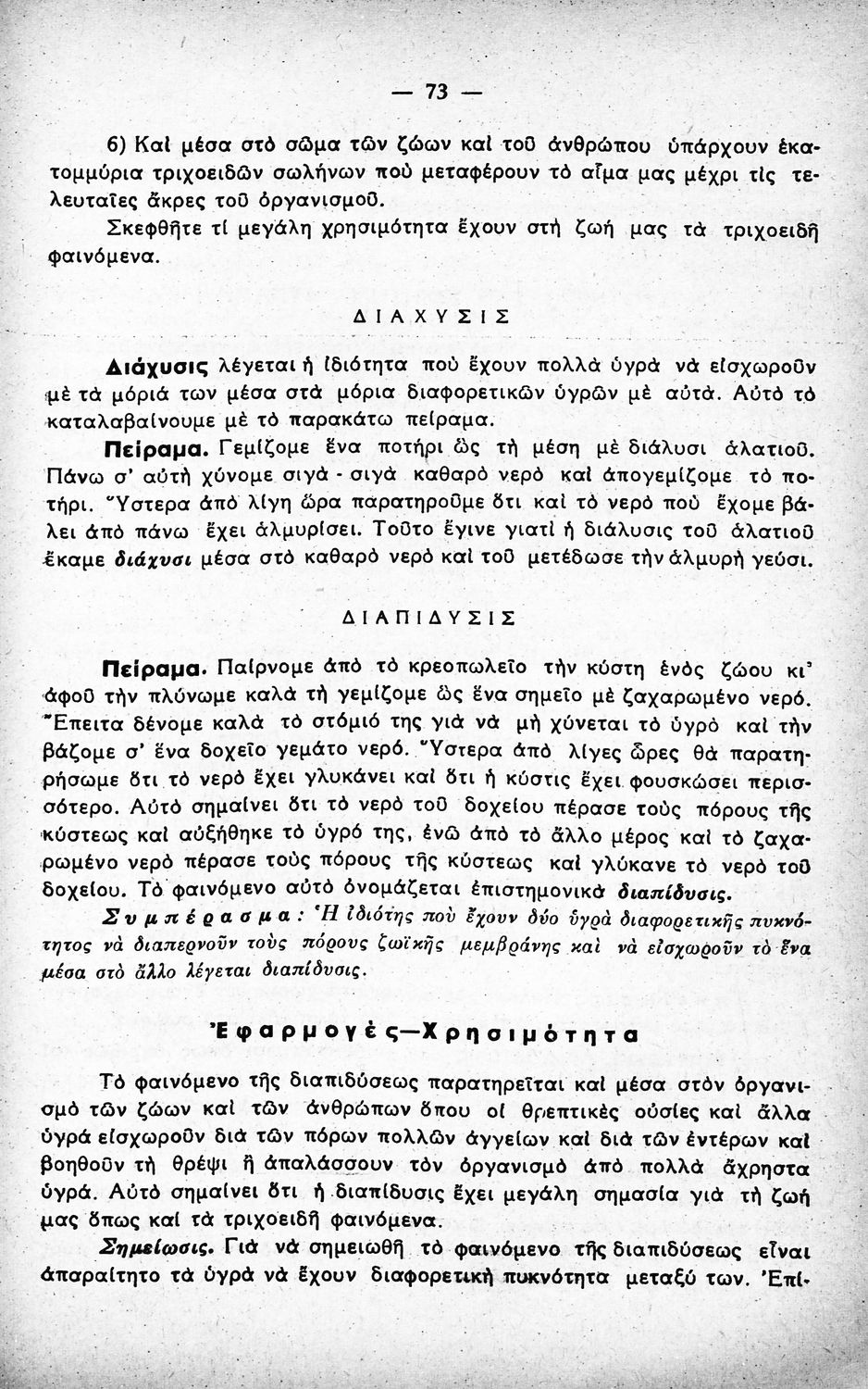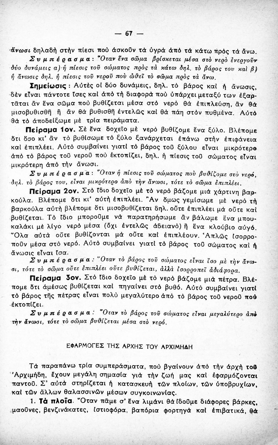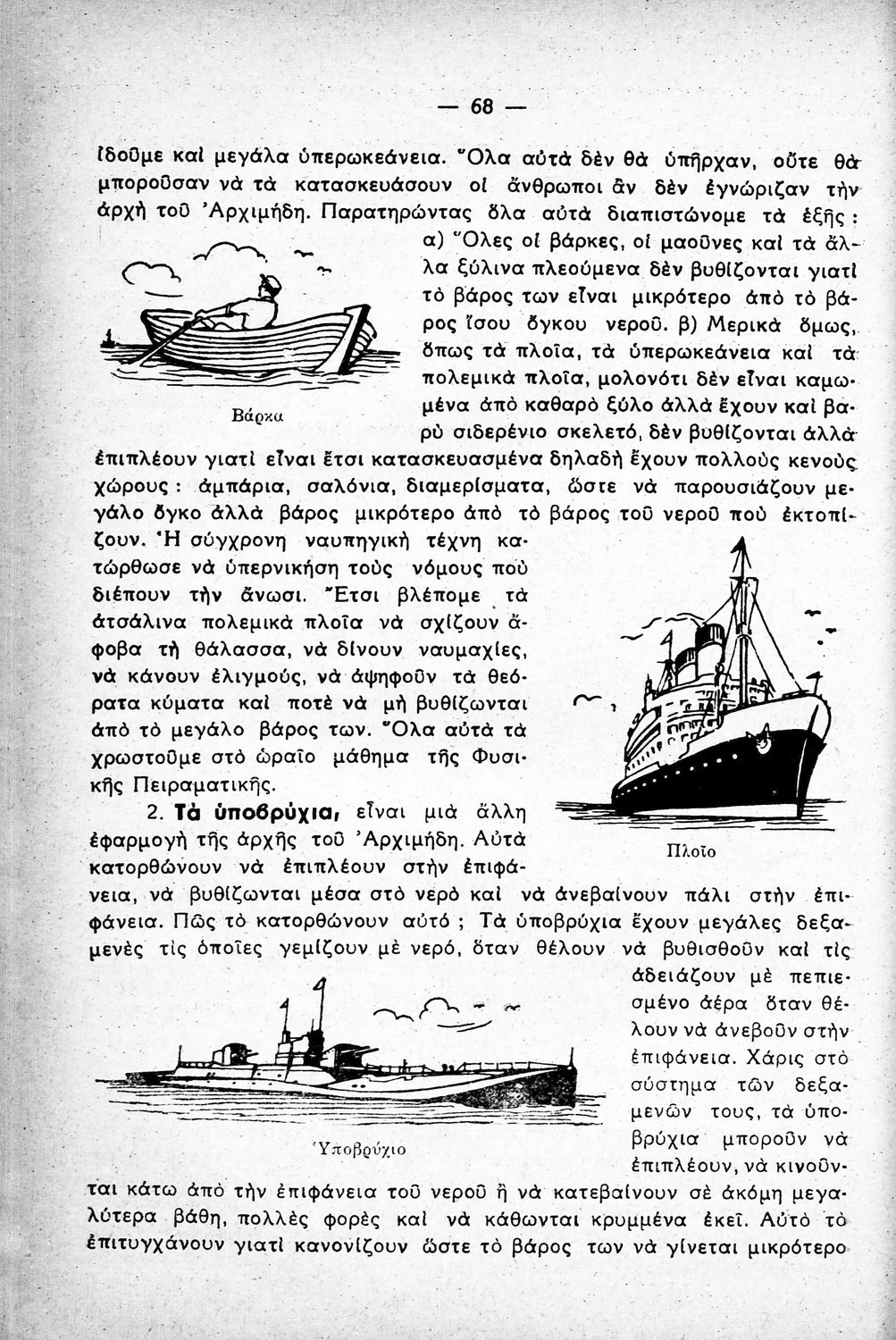 Βαθμίδα εκπαίδευσης: Πρωτοβάθμια Τάξη: Ε' Δημοτικού Μάθημα: Φυσική Γλώσσα: Απλή καθαρεύουσα Παρουσίαση περιεχομένου: Μαθητικό βοήθημα της Ε΄ Δημοτικού για το μάθημα της Φυσικής. Παρέχει βασικές γνώσεις της Φυσικής επιστήμης και της Χημείας. Αναλύει τις ιδιότητες των σωμάτων, καθώς και της θερμότητας, του ηλεκτρισμού και του μαγνητισμού, την υδροστατική, την βαρύτητα και την αεροστατική. Σχετικά με τη χημεία αναφέρεται στα μέταλλα, στα οξέα, τις βάσεις, τα άλατα. Αναφέρεται στην πρακτική εφαρμογή της φυσικής και της χημείας στην καθημερινότητά. Επίσης, περιλαμβάνει πολλά από τα όργανα, που χρησιμοποιούνται στη φυσική, και τη χημεία. Περιέχει εικόνες και σχεδιαγράμματα τα οποία βοηθούν τη διδασκαλία. |