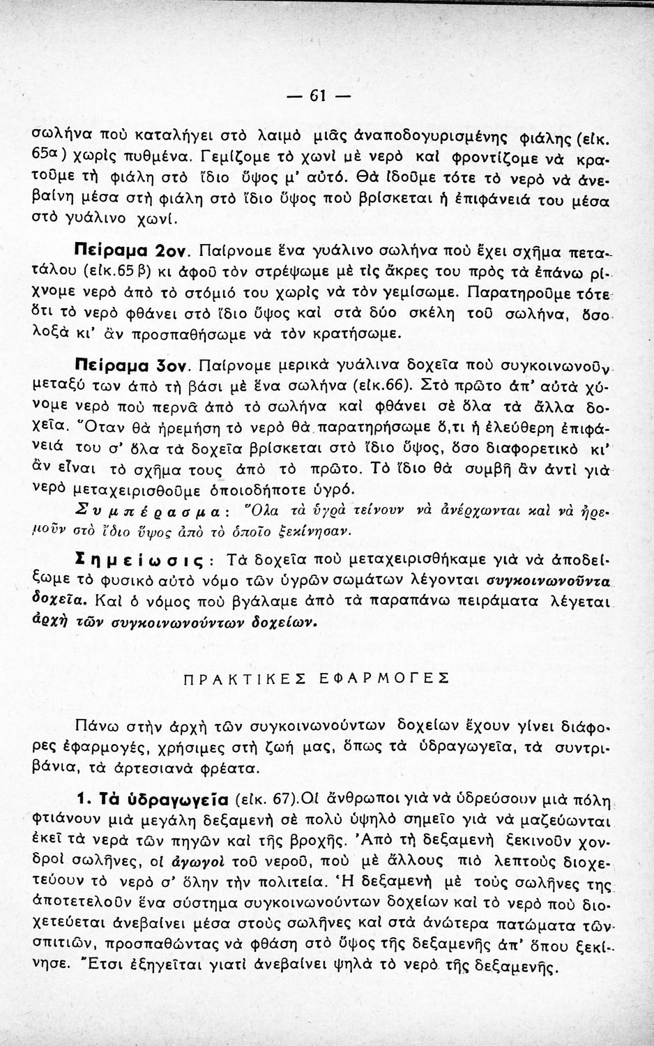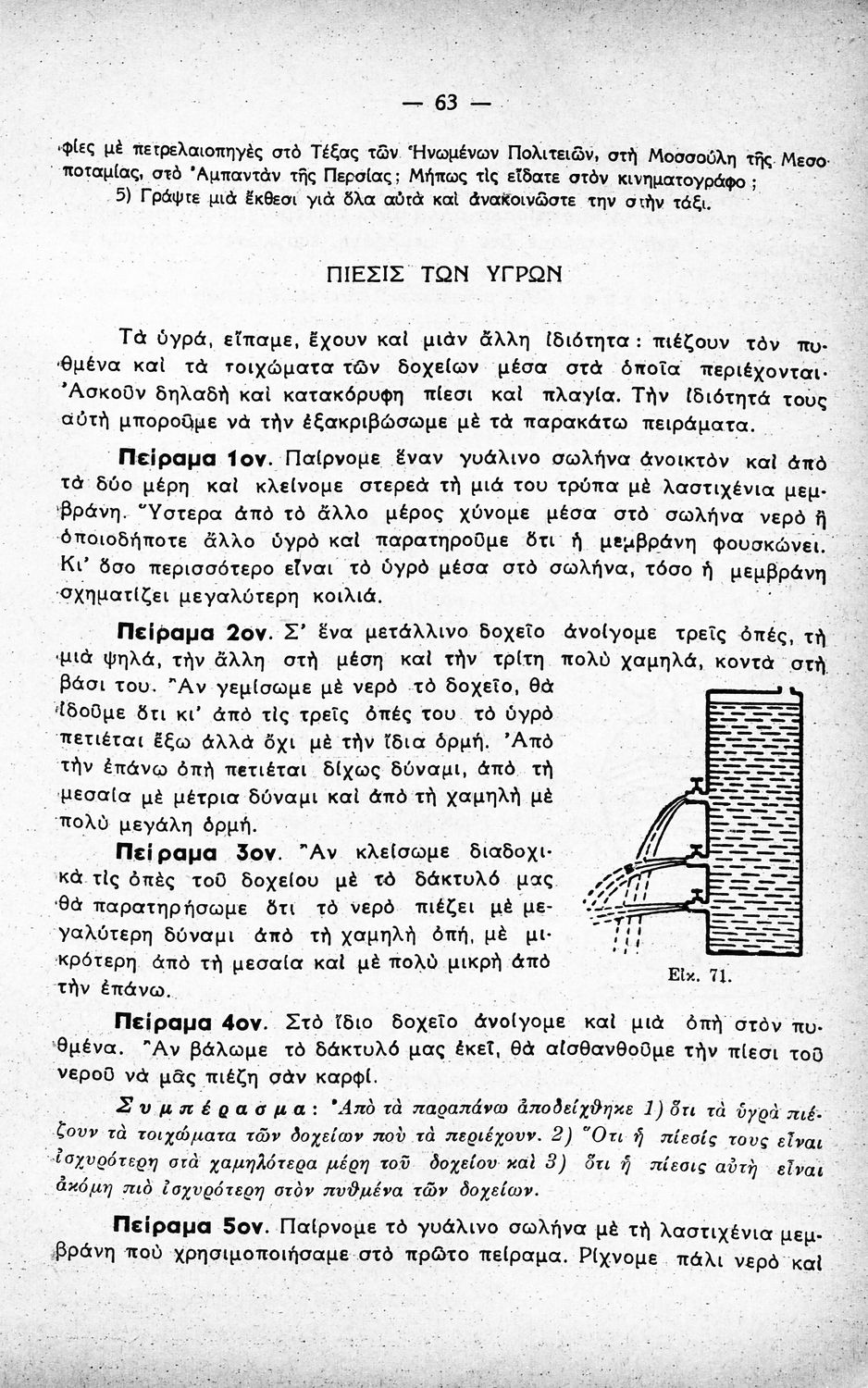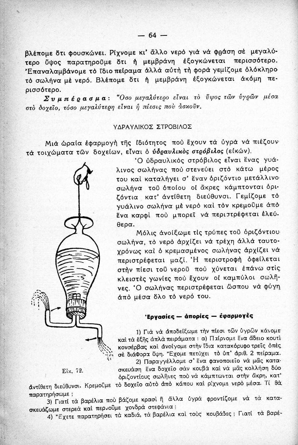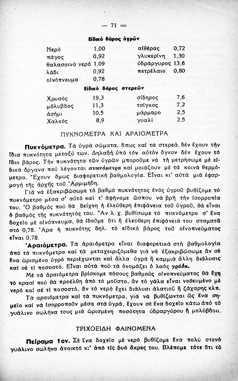 Βαθμίδα εκπαίδευσης: Πρωτοβάθμια Τάξη: Ε' Δημοτικού Μάθημα: Φυσική Γλώσσα: Απλή καθαρεύουσα Παρουσίαση περιεχομένου: Μαθητικό βοήθημα της Ε΄ Δημοτικού για το μάθημα της Φυσικής. Παρέχει βασικές γνώσεις της Φυσικής επιστήμης και της Χημείας. Αναλύει τις ιδιότητες των σωμάτων, καθώς και της θερμότητας, του ηλεκτρισμού και του μαγνητισμού, την υδροστατική, την βαρύτητα και την αεροστατική. Σχετικά με τη χημεία αναφέρεται στα μέταλλα, στα οξέα, τις βάσεις, τα άλατα. Αναφέρεται στην πρακτική εφαρμογή της φυσικής και της χημείας στην καθημερινότητά. Επίσης, περιλαμβάνει πολλά από τα όργανα, που χρησιμοποιούνται στη φυσική, και τη χημεία. Περιέχει εικόνες και σχεδιαγράμματα τα οποία βοηθούν τη διδασκαλία. |