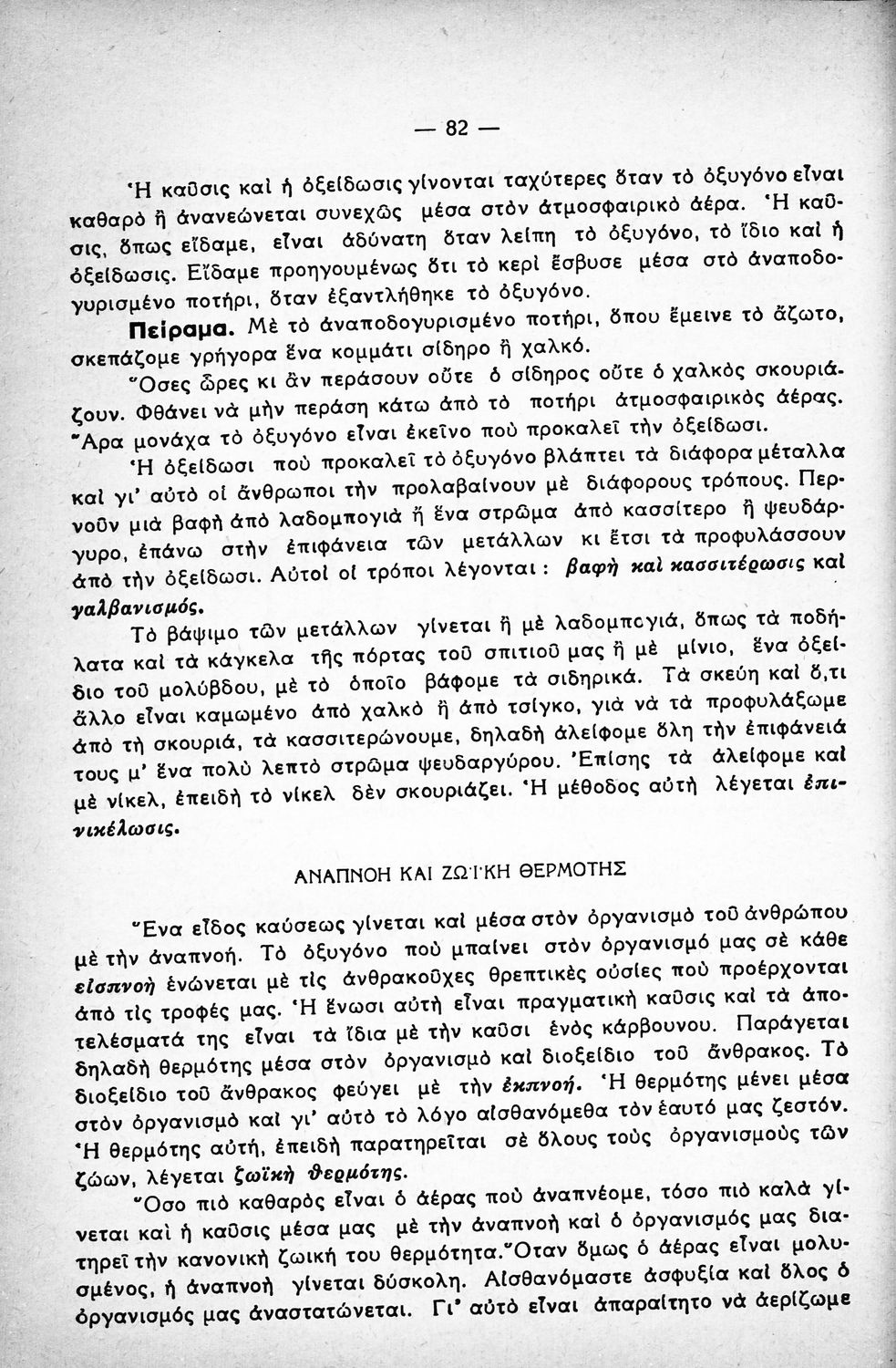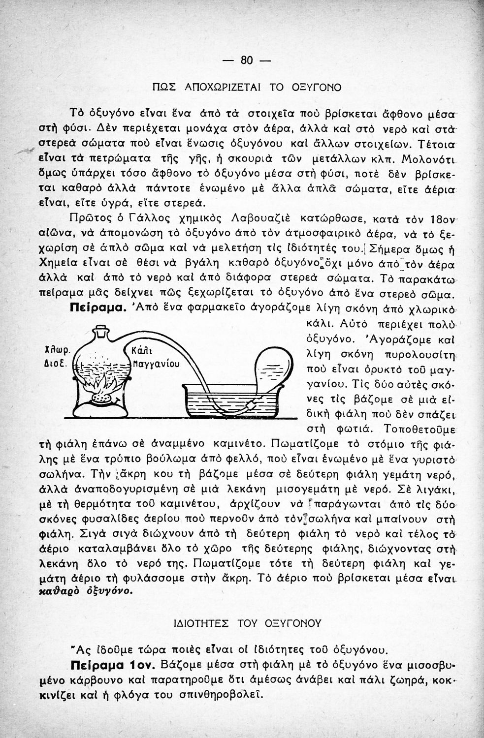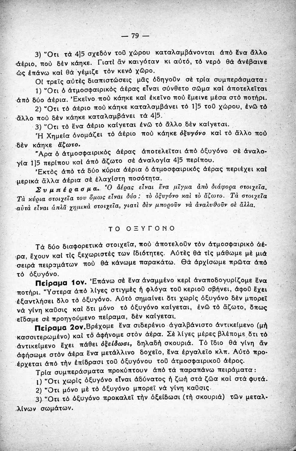 Βαθμίδα εκπαίδευσης: Πρωτοβάθμια Τάξη: Ε' Δημοτικού / ΣΤ' Δημοτικού Μάθημα: Φυσική Γλώσσα: Απλή καθαρεύουσα Παρουσίαση περιεχομένου: Μαθητικό βοήθημα της Ε΄ και ΣΤ΄ Δημοτικού για το μάθημα της Φυσικής. Παρέχει βασικές γνώσεις της φυσικής επιστήμης και της χημείας. Αναλύει τις ιδιότητες των σωμάτων, καθώς και της θερμότητας, του ηλεκτρισμού και του μαγνητισμού, την υδροστατική, την βαρύτητα και την αεροστατική. Σχετικά με τη χημεία αναφέρεται στα μέταλλα, στα οξέα, τις βάσεις, τα άλατα. Αναφέρεται στην πρακτική εφαρμογή της φυσικής και της χημείας στην καθημερινότητά. Επίσης, περιλαμβάνει πολλά από τα όργανα, που χρησιμοποιούνται στη φυσική, και τη χημεία. Περιέχει εικόνες και σχεδιαγράμματα τα οποία βοηθούν τη διδασκαλία. |