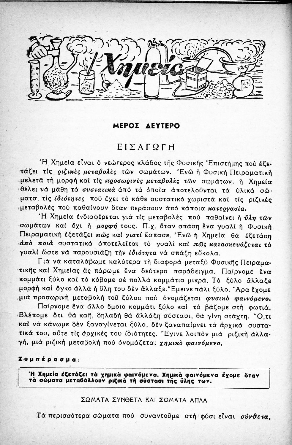 Μαθητικό βοήθημα της Ε΄ και ΣΤ΄ Δημοτικού για το μάθημα της Φυσικής. Παρέχει βασικές γνώσεις της φυσικής επιστήμης και της χημείας. Αναλύει τις ιδιότητες των σωμάτων, καθώς και της θερμότητας, του ηλεκτρισμού και του μαγνητισμού, την υδροστατική, την βαρύτητα και την αεροστατική. Σχετικά με τη χημεία αναφέρεται στα μέταλλα, στα οξέα, τις βάσεις, τα άλατα. Αναφέρεται στην πρακτική εφαρμογή της φυσικής και της χημείας στην καθημερινότητά. Επίσης, περιλαμβάνει πολλά από τα όργανα, που χρησιμοποιούνται στη φυσική, και τη χημεία. Περιέχει εικόνες και σχεδιαγράμματα τα οποία βοηθούν τη διδασκαλία.