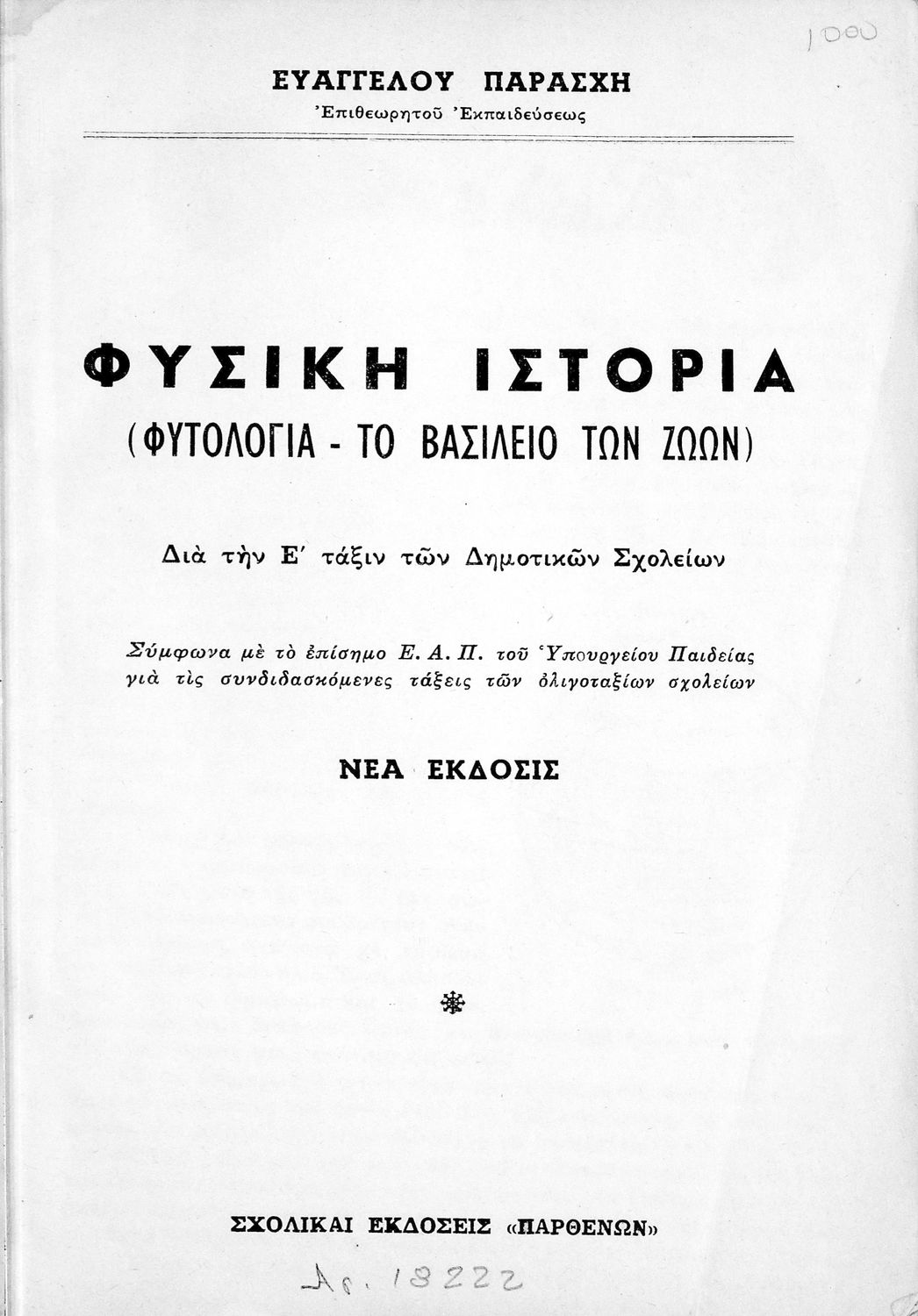 Τίτλος: Φυσική Ιστορία (Φυτολογία, το βασίλειο των ζώων) δια την Ε΄ Τάξιν των Δημοτικών σχολείων