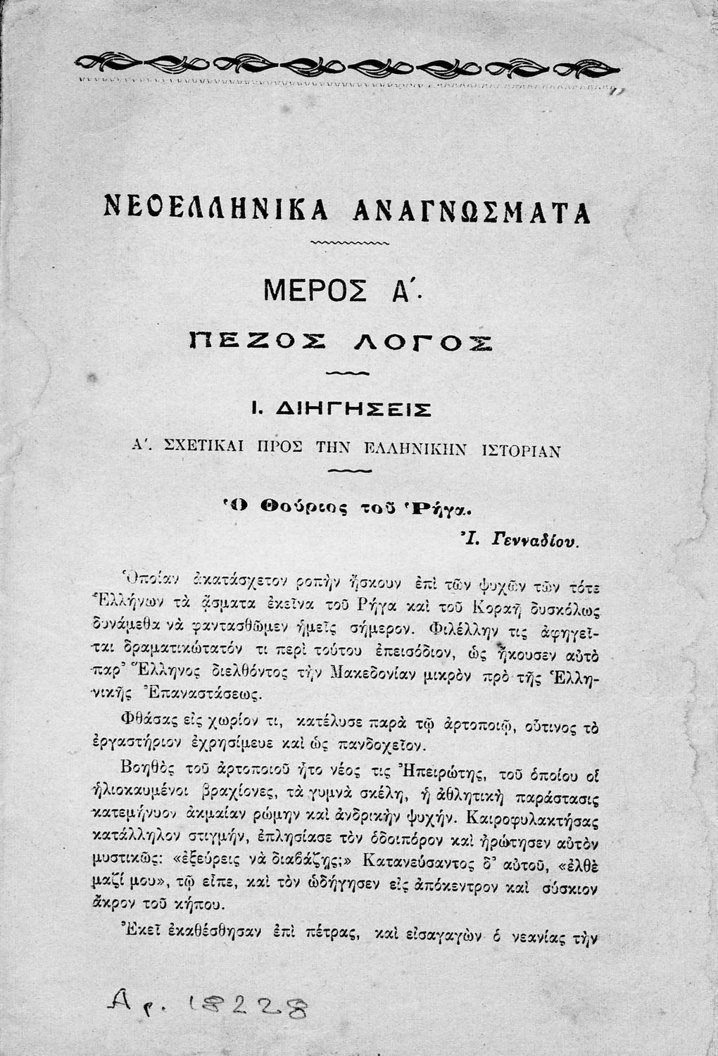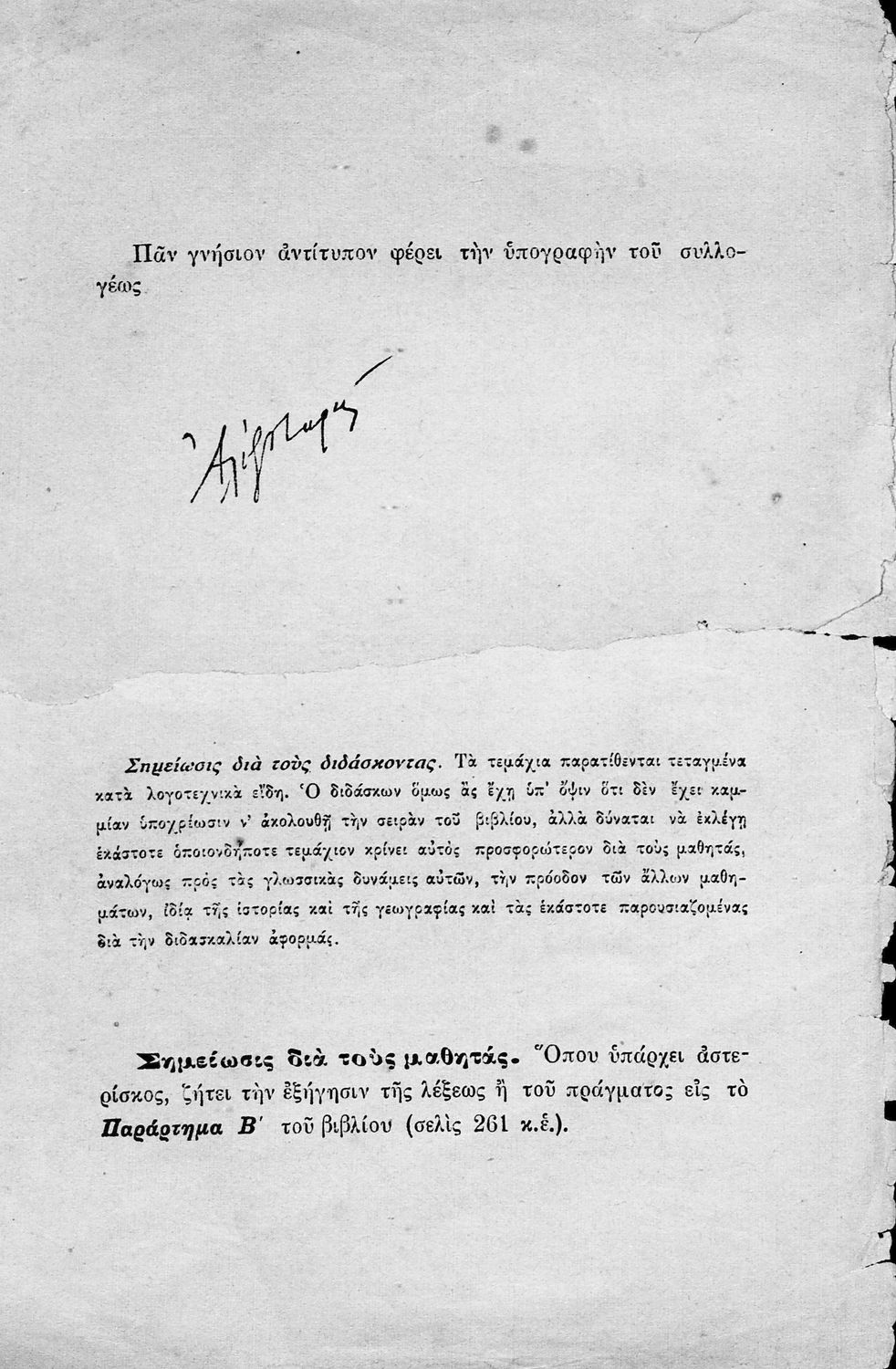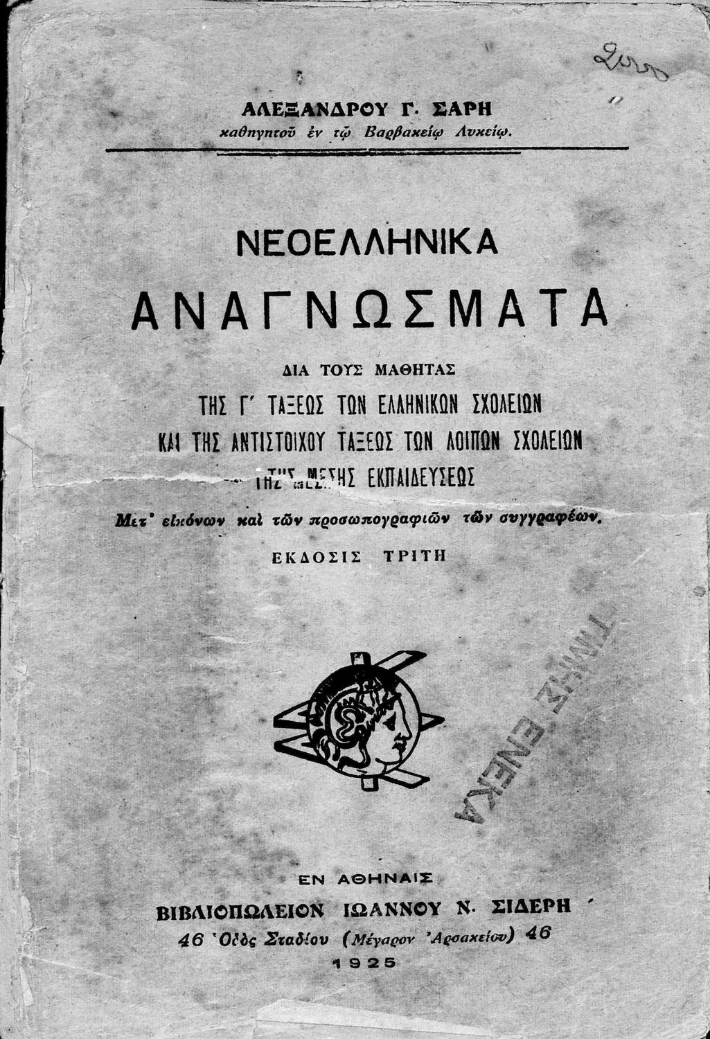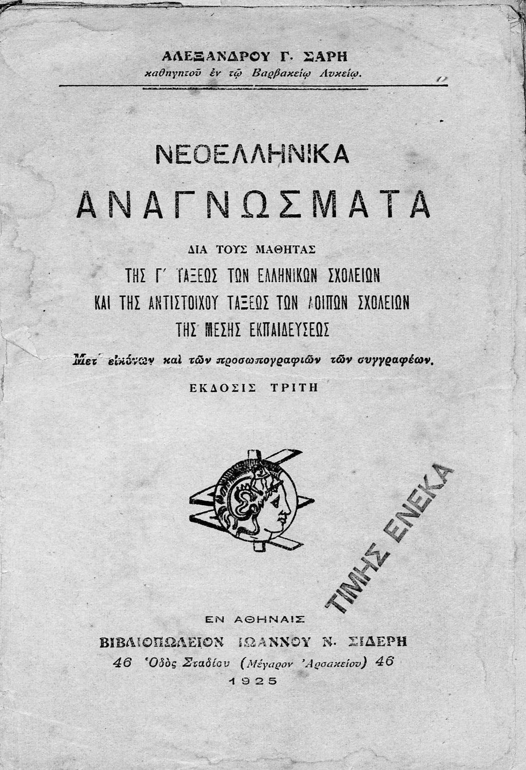 Τίτλος: Νεοελληνικά αναγνώσματα διά τους μαθητάς της Γ΄ τάξεως των Ελληνικών Σχολείων και της αντιστοίχου τάξεως των λοιπών σχολείων της Μέσης Εκπαιδεύσεως.