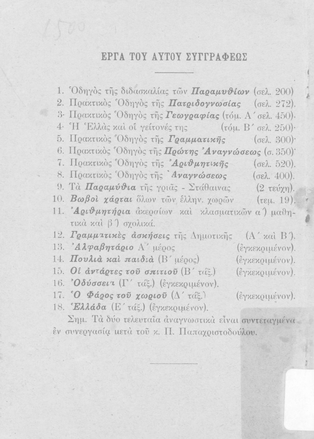 Παιδαγωγικό βοήθημα που αναφέρεται σε θέματα μεθοδολογίας και διδακτικής των διαφόρων μαθημάτων του Δημοτικού Σχολείου. Ο συγγραφέας ήταν Διευθυντής σε Δημοτικό Σχολείο του Μαρκόπουλου.