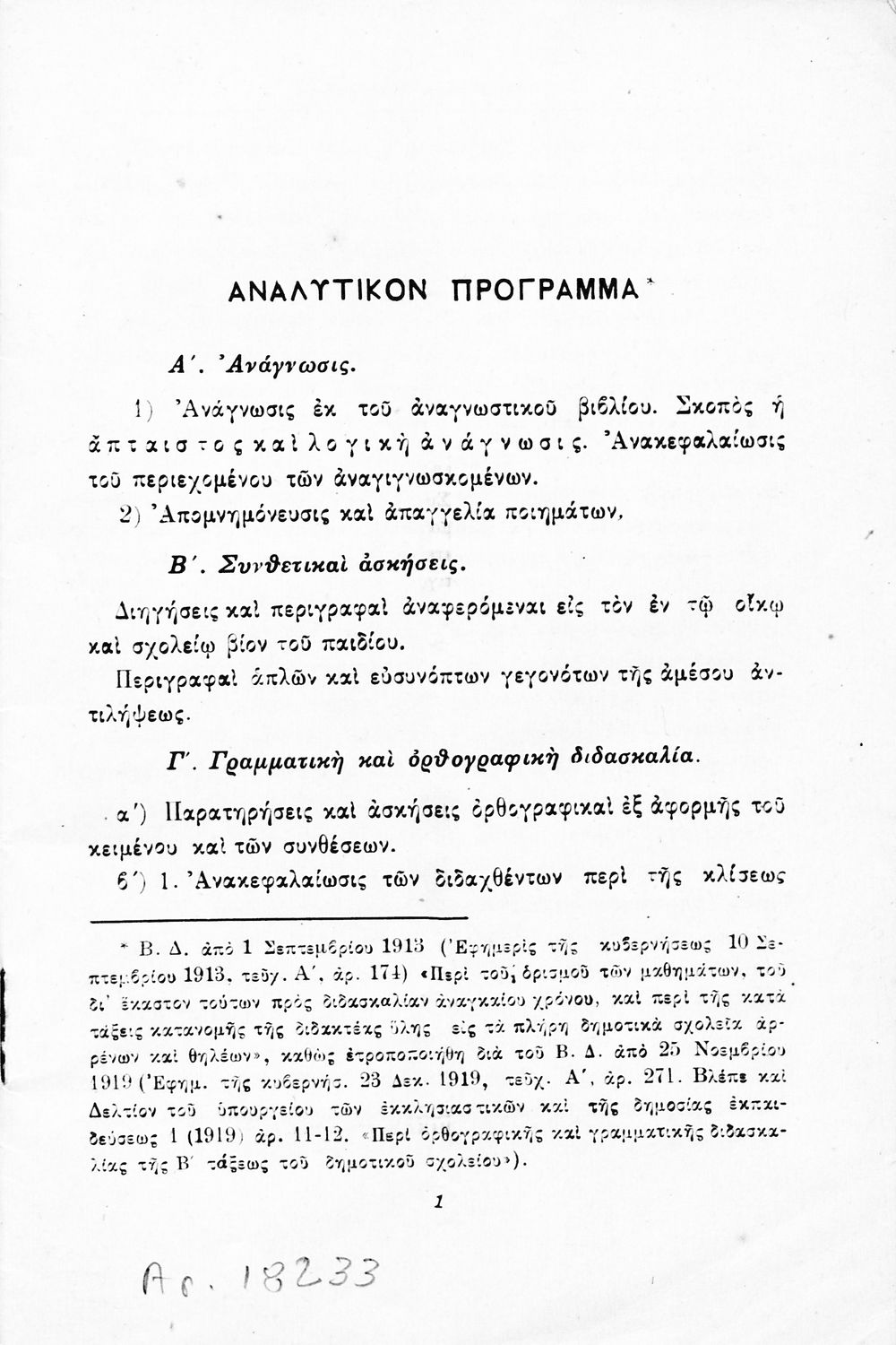 Κωδικός αναγνώρισης: 01-18233 Τίτλος: Η Γλωσσική διδασκαλία της Δ΄ τάξεως του Δημοτικού Σχολείου Μέγεθος και υπόστρωμα: Αναλυτικό πρόγραμμα, 19εκ., μαλακό εξώφυλλο, 38 σελίδες. |