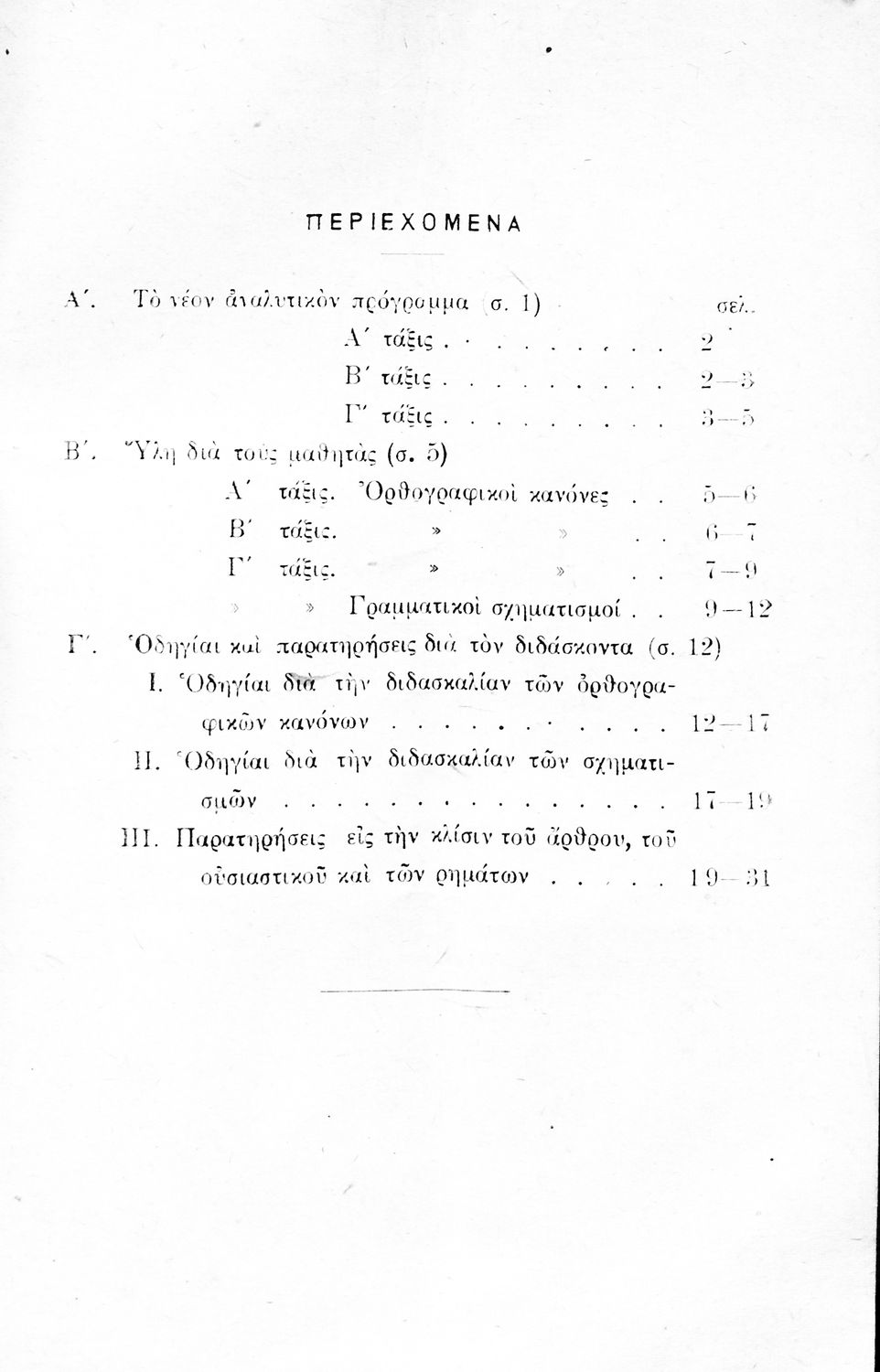 Βαθμίδα εκπαίδευσης: Πρωτοβάθμια Τάξη: Α' Δημοτικού / Β' Δημοτικού / Γ' Δημοτικού Μάθημα: Νέα Ελληνικά Γλώσσα: Καθαρεύουσα Παρουσίαση περιεχομένου: Αναλυτικό πρόγραμμα για τη διδασκαλία της γραμματικής στις τρεις πρώτες τάξεις του Δημοτικού. |