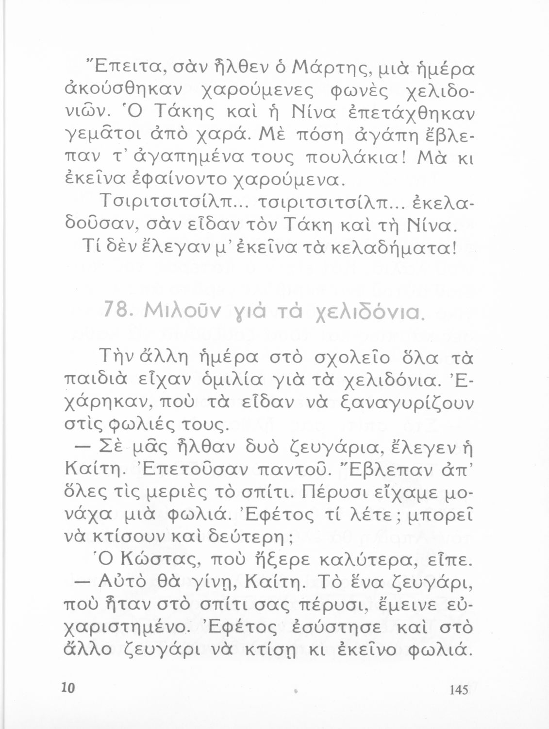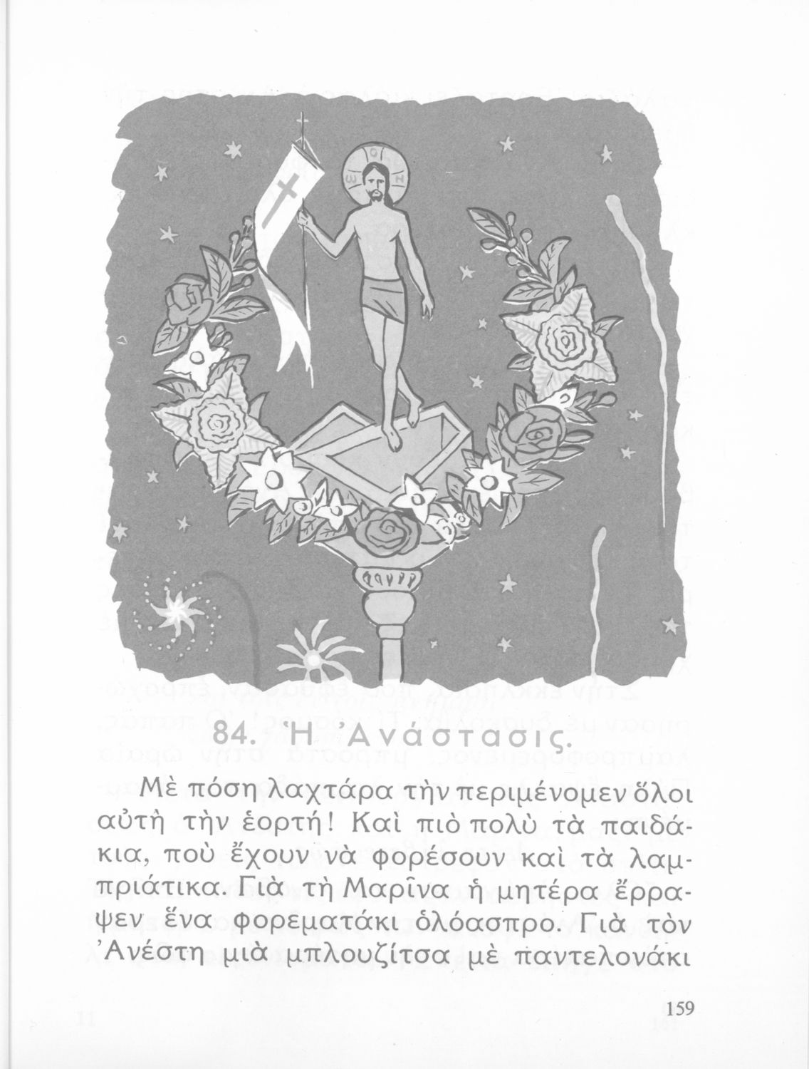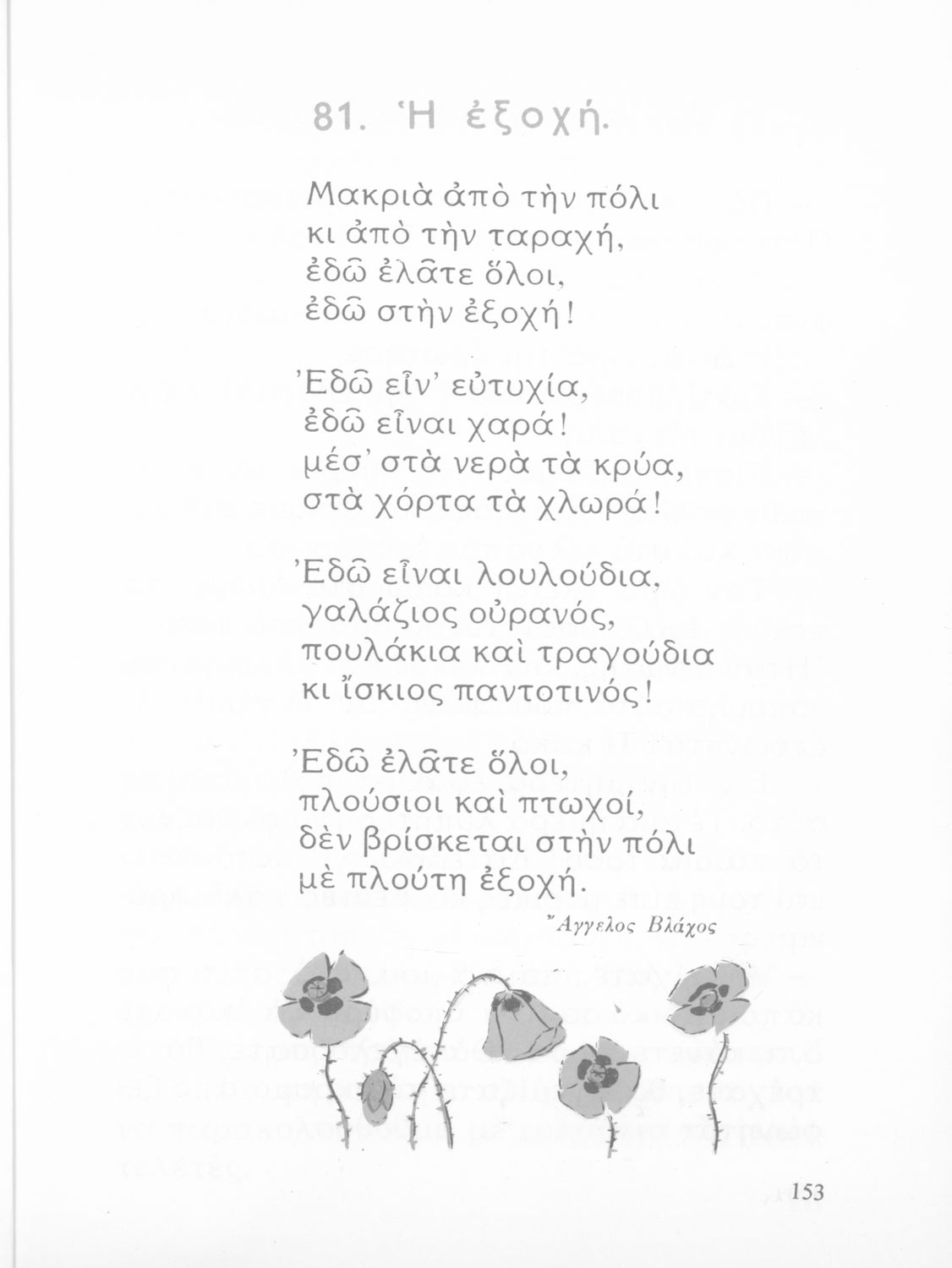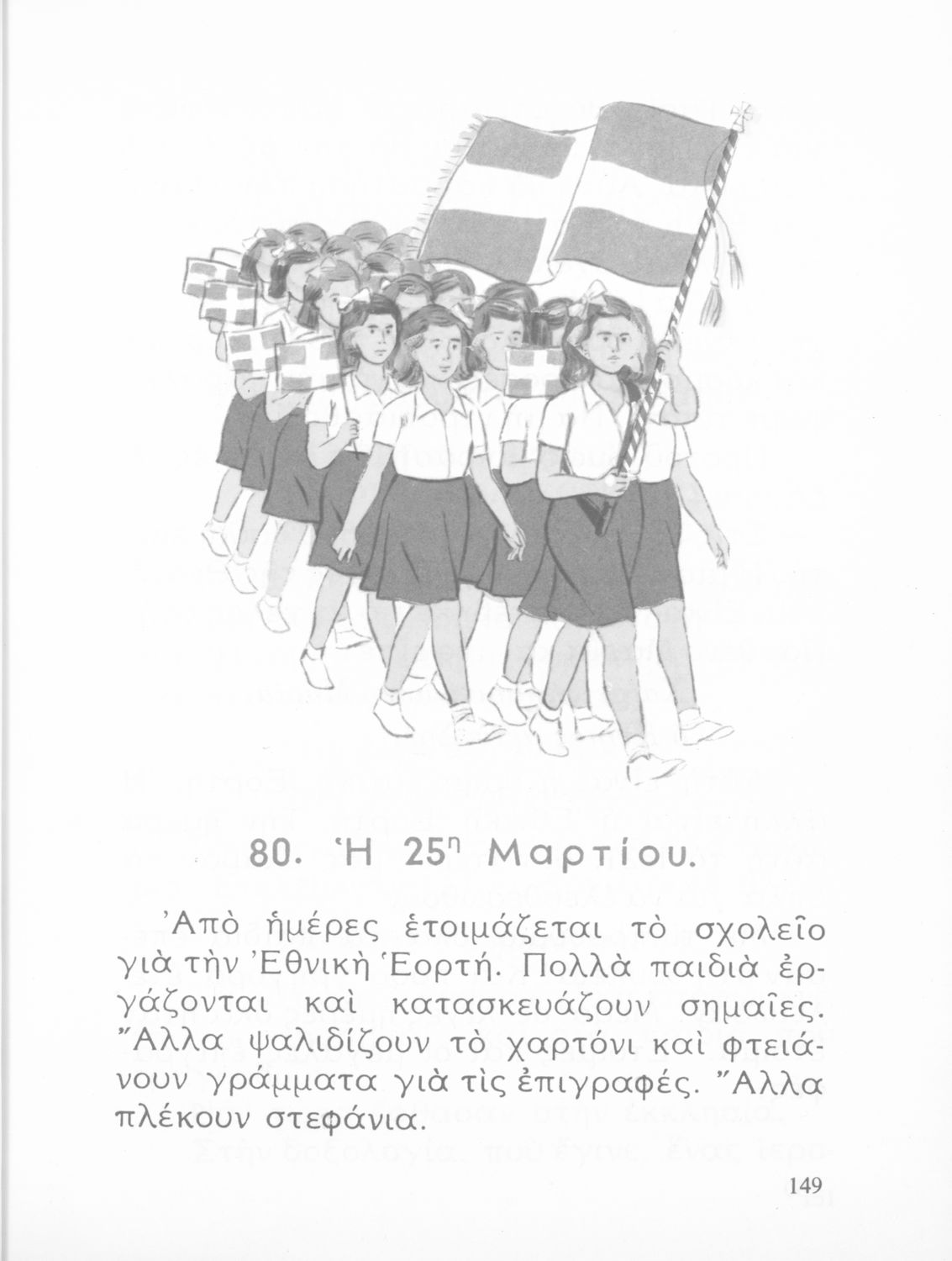 Αναγνωστικό Β' Δημοτικού που είναι χωρισμένο σύμφωνα με τις εποχές του χρόνου και περιλαμβάνει κείμενα ηθοποιητικού περιεχομένου εμπνευσμένα από τη θρησκευτική, εθνική, κοινωνική και οικογενειακή ζωή. Φέρει το σύμβολο της δικτατορίας.