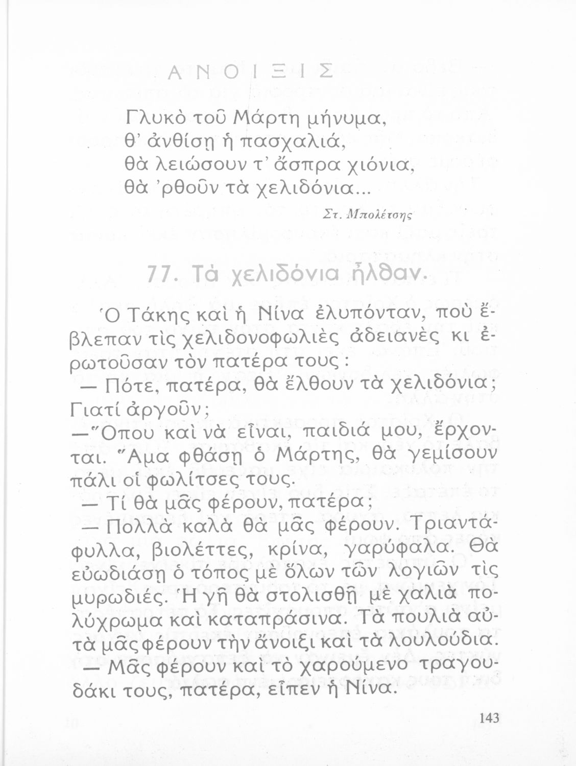 Αναγνωστικό Β' Δημοτικού που είναι χωρισμένο σύμφωνα με τις εποχές του χρόνου και περιλαμβάνει κείμενα ηθοποιητικού περιεχομένου εμπνευσμένα από τη θρησκευτική, εθνική, κοινωνική και οικογενειακή ζωή. Φέρει το