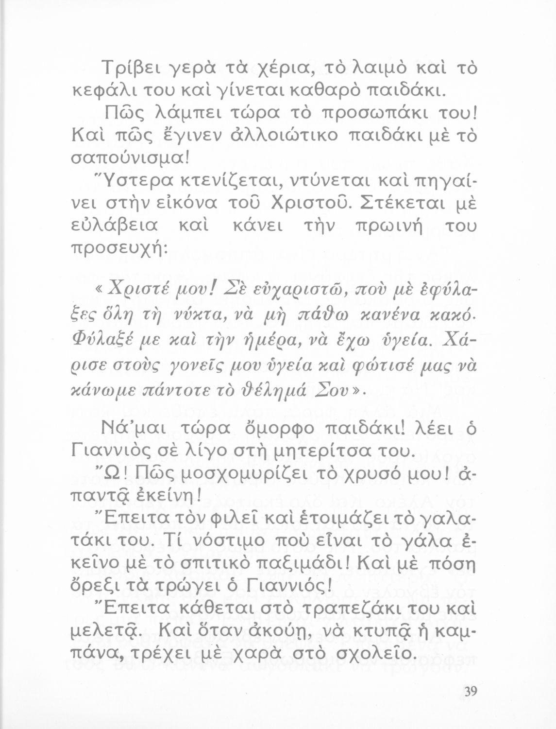 Αναγνωστικό Β' Δημοτικού που είναι χωρισμένο σύμφωνα με τις εποχές του χρόνου και περιλαμβάνει κείμενα ηθοποιητικού περιεχομένου εμπνευσμένα από τη θρησκευτική, εθνική, κοινωνική και οικογενειακή ζωή.