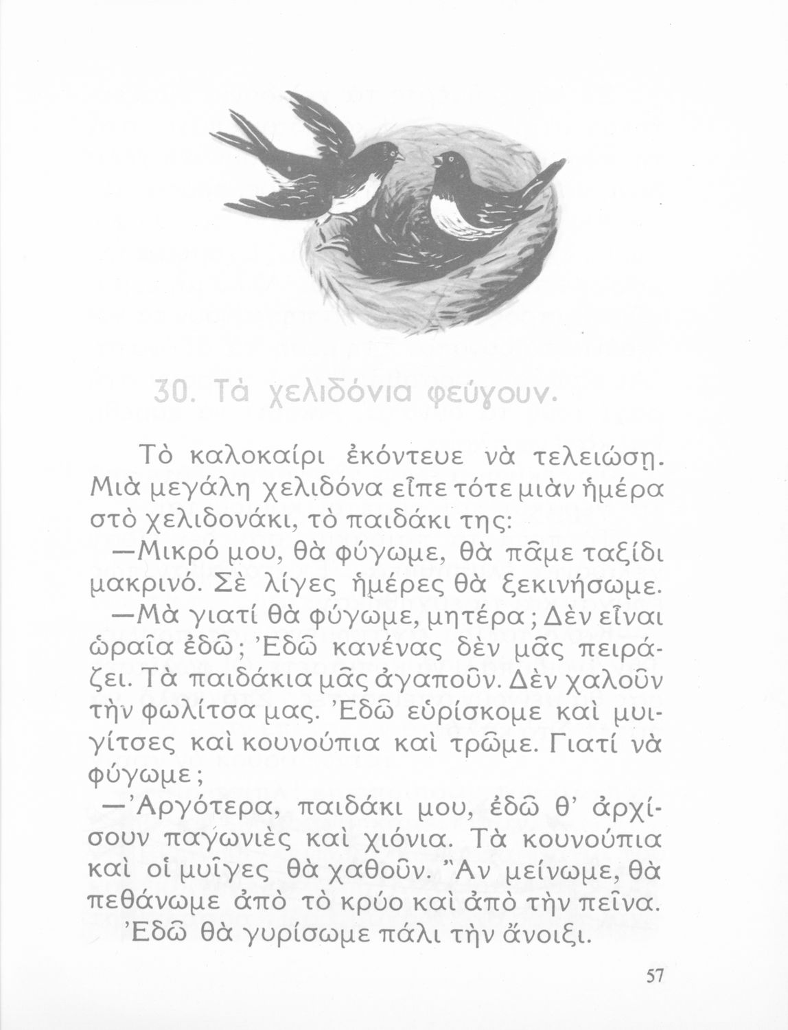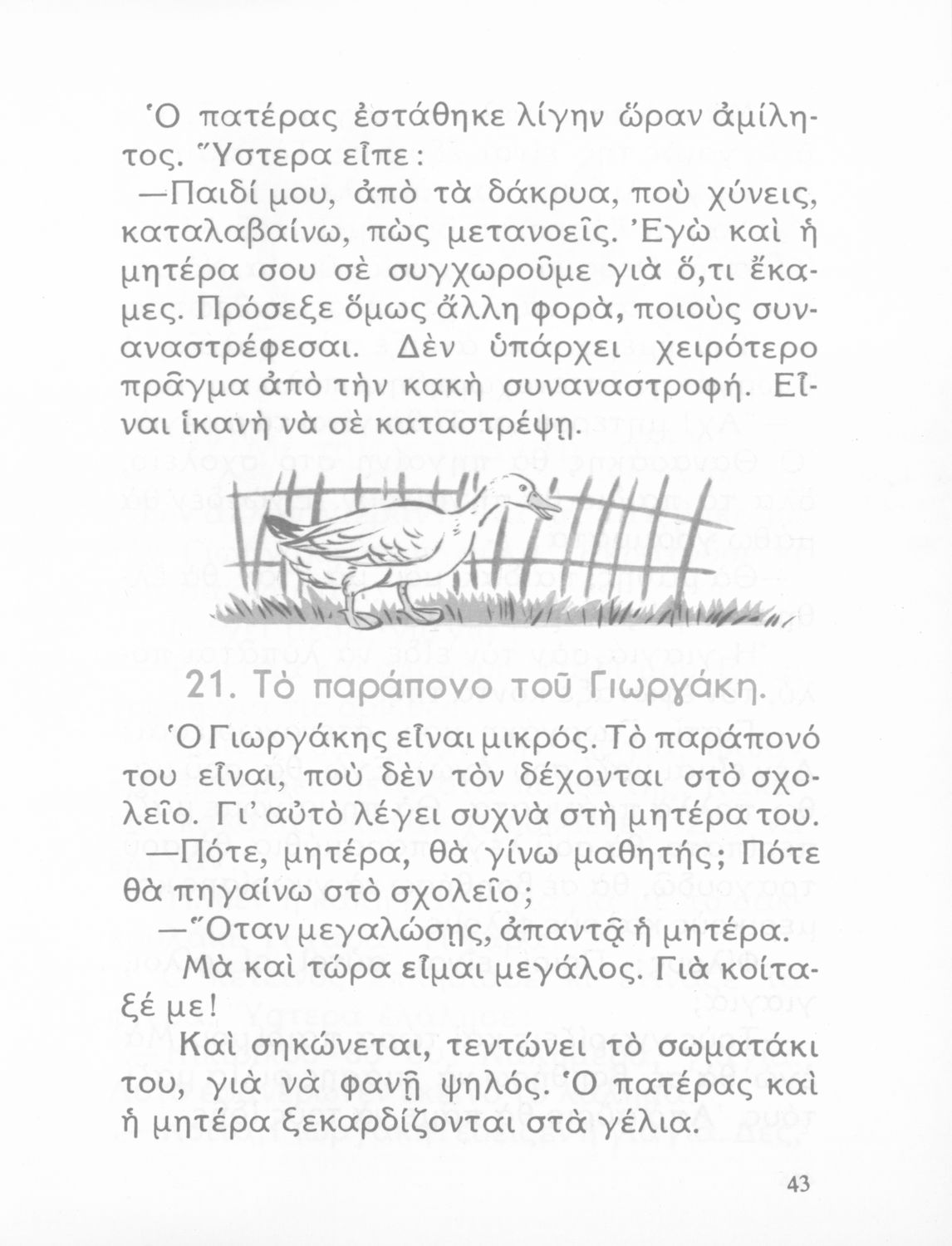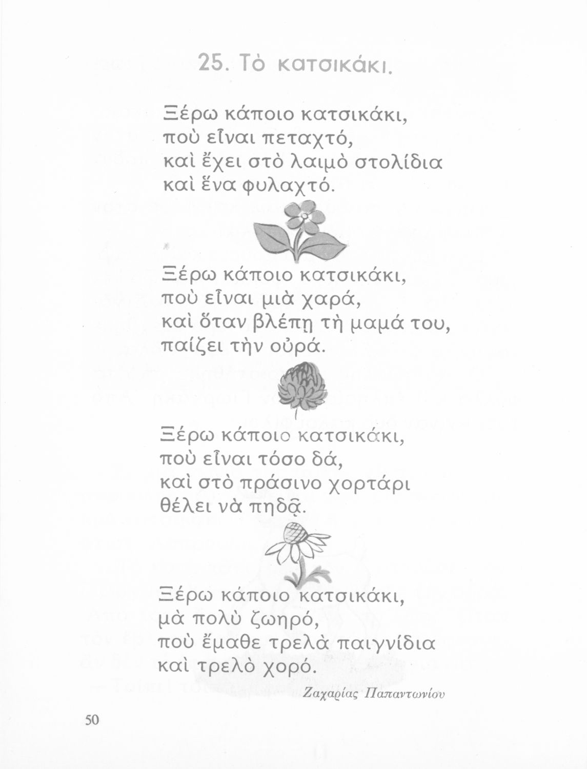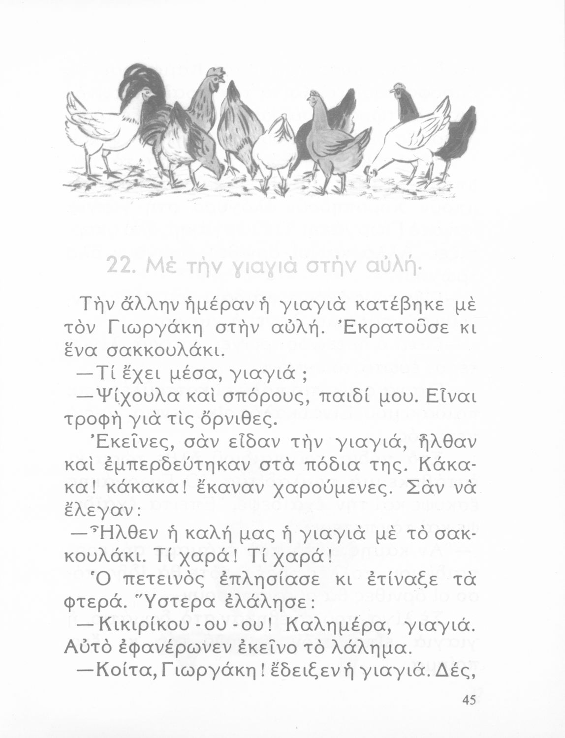 Αναγνωστικό Β' Δημοτικού που είναι χωρισμένο σύμφωνα με τις εποχές του χρόνου και περιλαμβάνει κείμενα ηθοποιητικού περιεχομένου εμπνευσμένα από τη θρησκευτική, εθνική, κοινωνική και οικογενειακή ζωή. Φέρει το σύμβολο της δικτατορίας.
