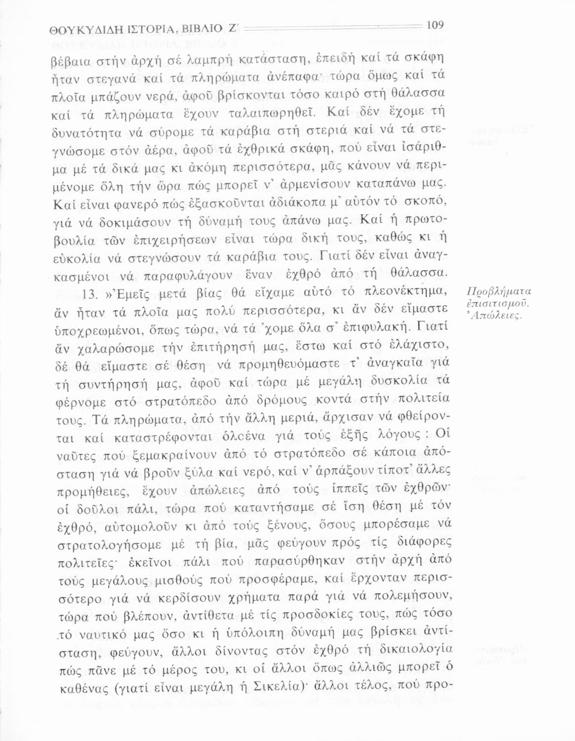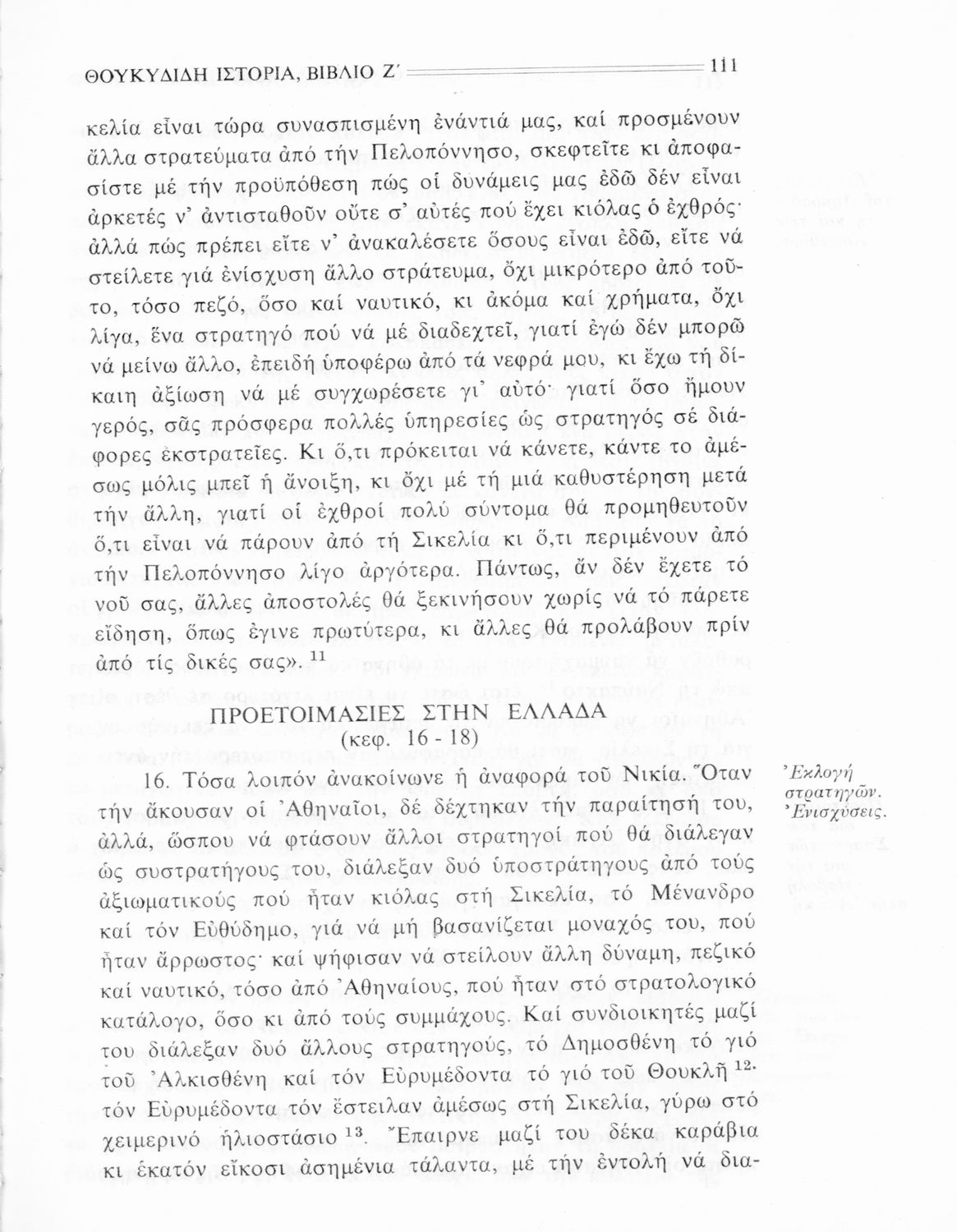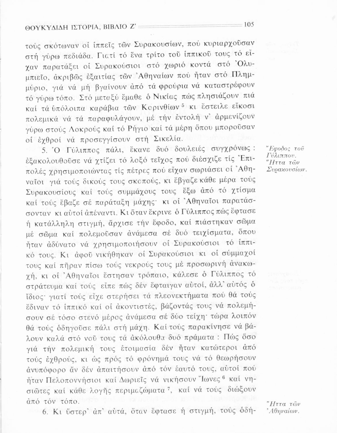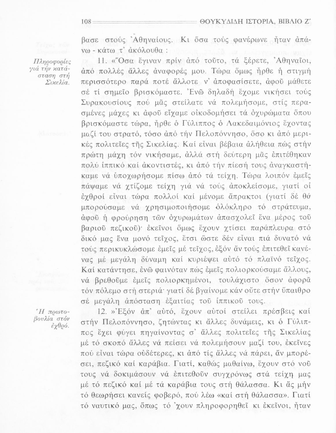 Σχολικό εγχειρίδιο Αρχαίων Ελληνικών Β΄ Γυμνασίου που περιλαμβάνει την μετάφραση των βιβλίων ΣΤ΄ και Ζ΄ της Ιστορίας του Θουκυδίδη, εισαγωγή στη ζωή και το έργο του, και ερμηνευτικά και πραγματολογικά σχόλια.