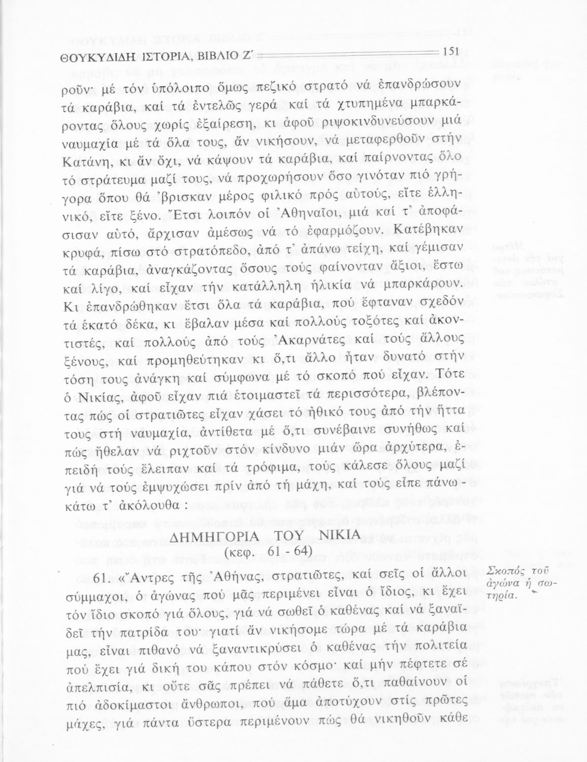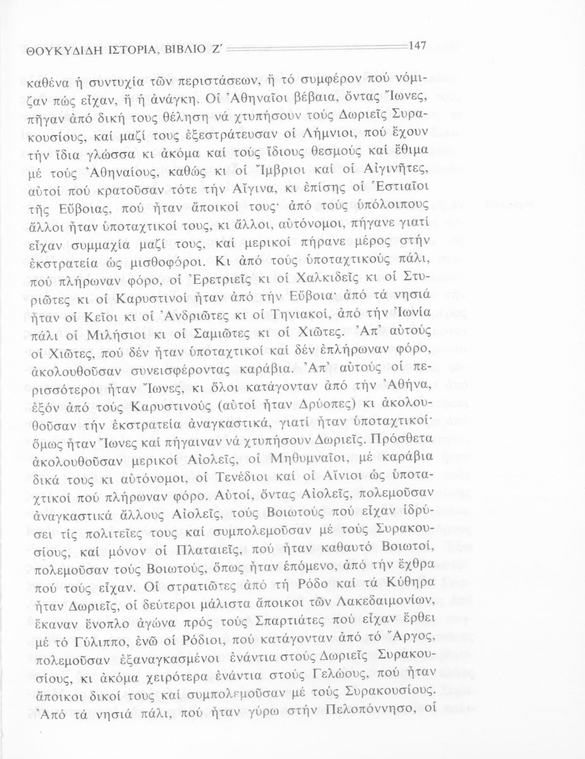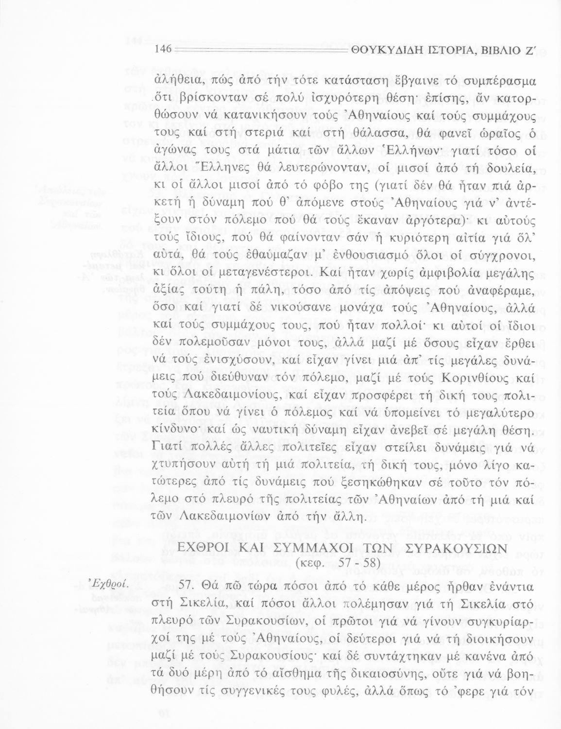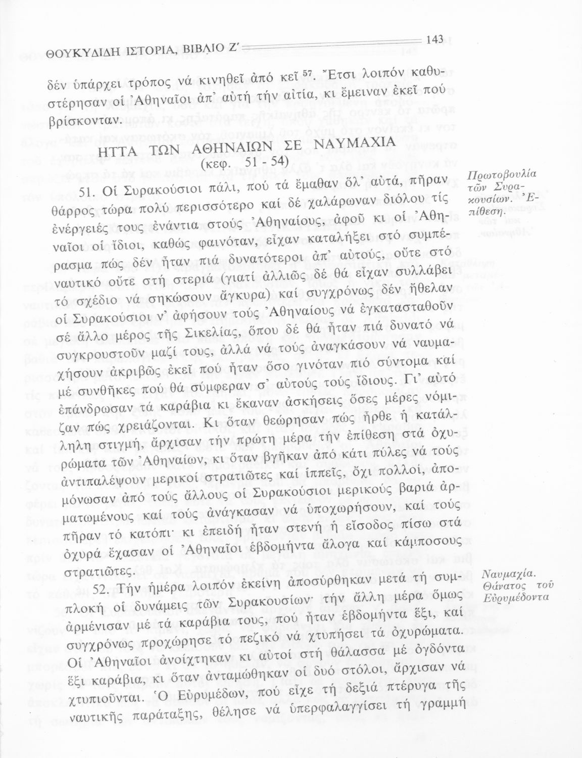 Σχολικό εγχειρίδιο Αρχαίων Ελληνικών Β΄ Γυμνασίου που περιλαμβάνει την μετάφραση των βιβλίων ΣΤ΄ και Ζ΄ της Ιστορίας του Θουκυδίδη, εισαγωγή στη ζωή και το έργο του, και ερμηνευτικά και πραγματολογικά σχόλια.
