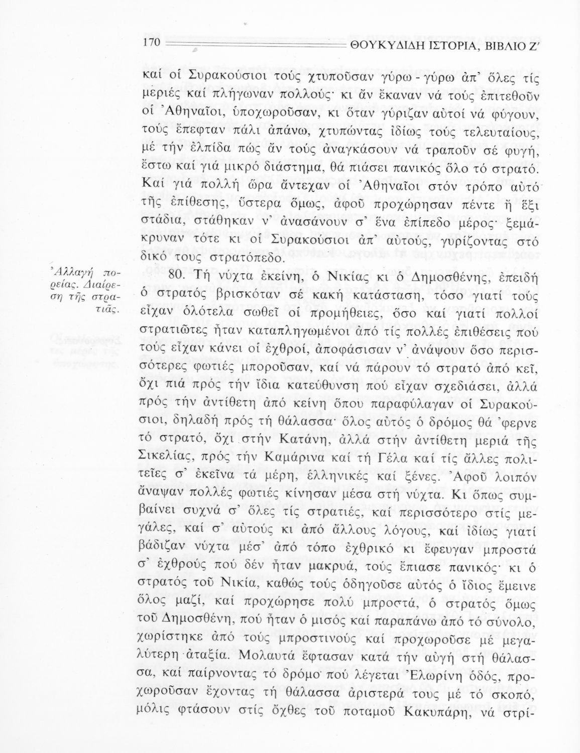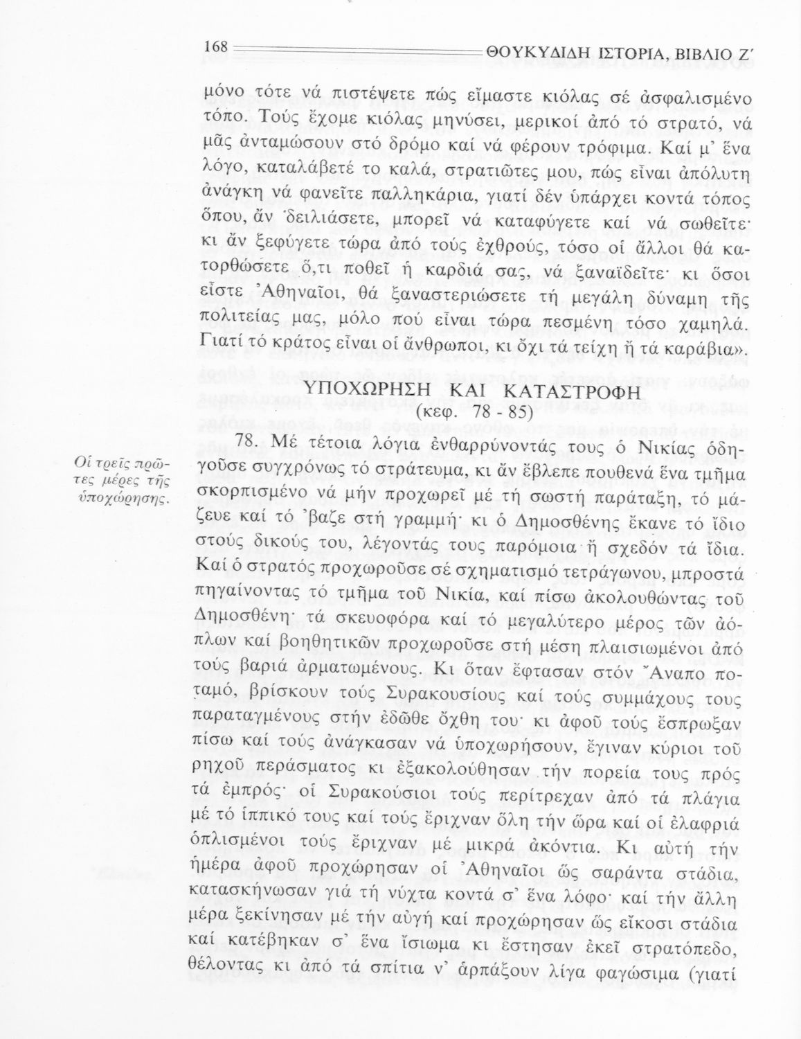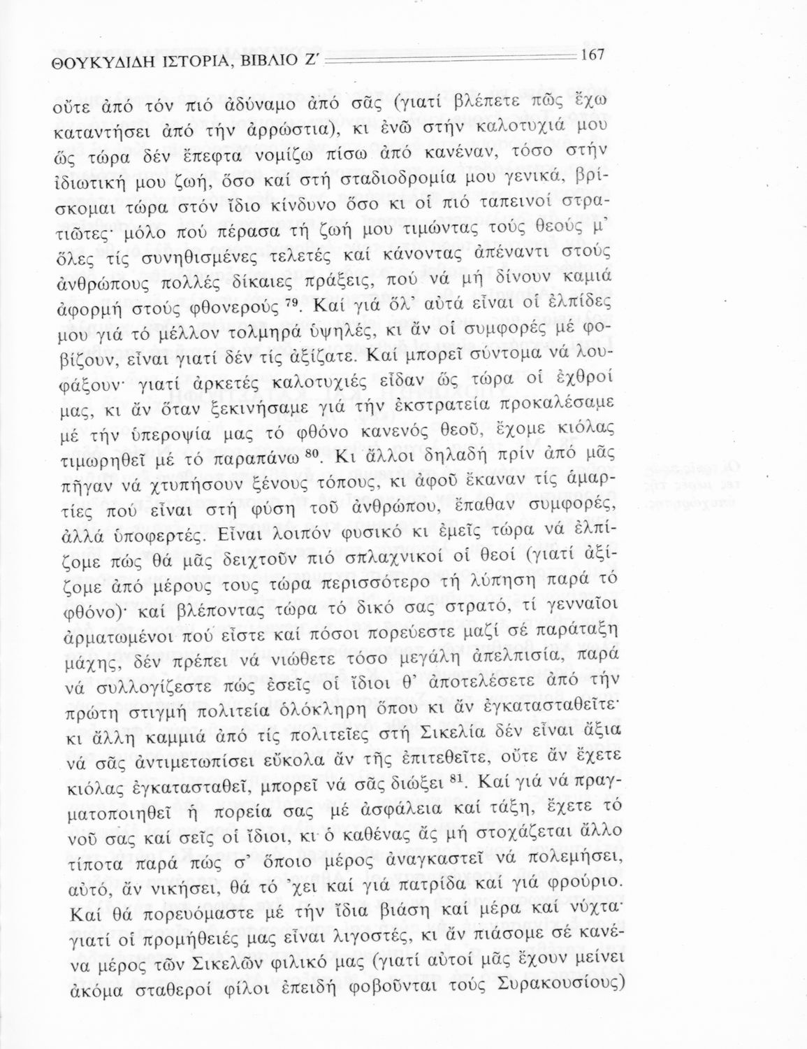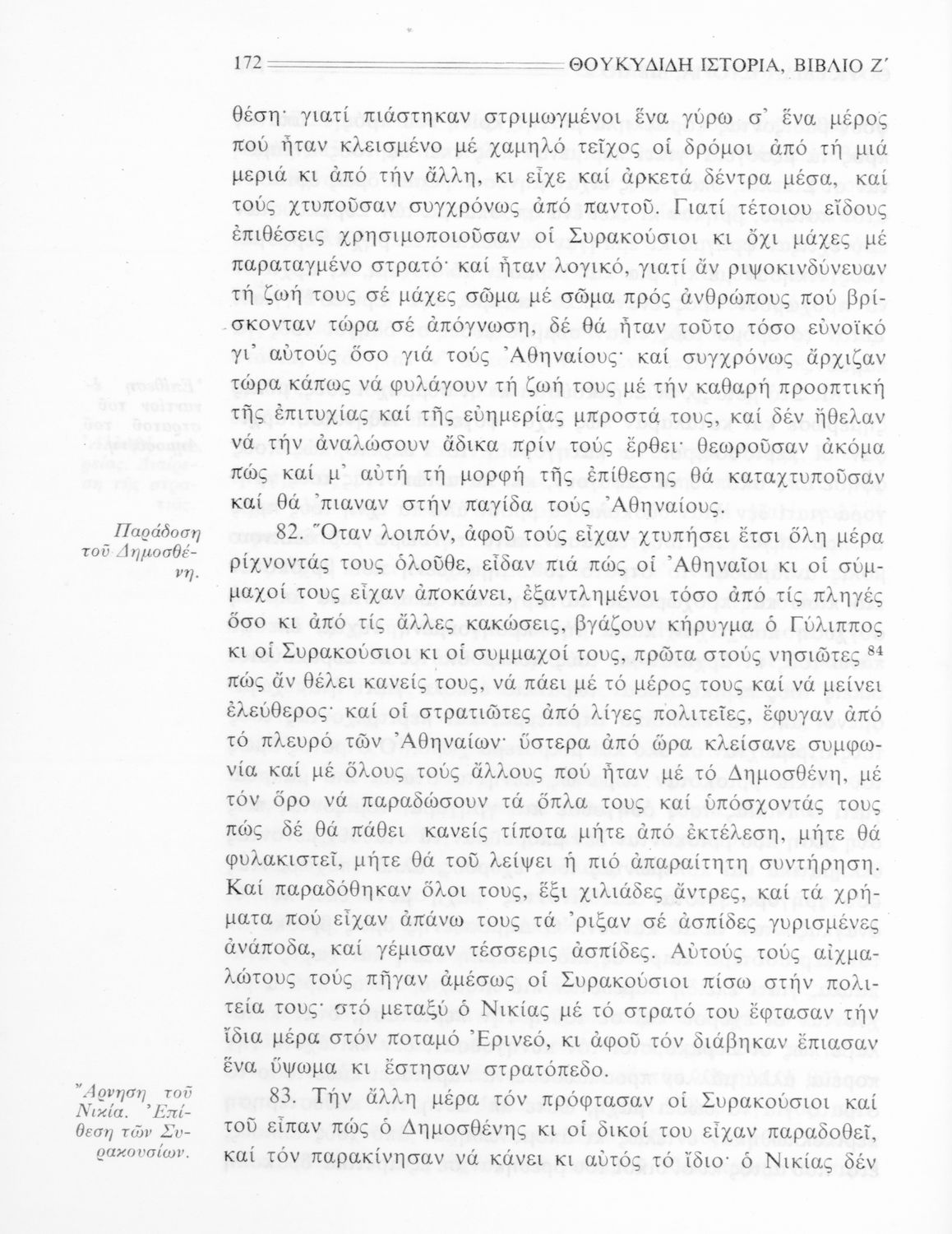 Σχολικό εγχειρίδιο Αρχαίων Ελληνικών Β΄ Γυμνασίου που περιλαμβάνει την μετάφραση των βιβλίων ΣΤ΄ και Ζ΄ της Ιστορίας του Θουκυδίδη, εισαγωγή στη ζωή και το έργο του, και ερμηνευτικά και πραγματολογικά σχόλια.