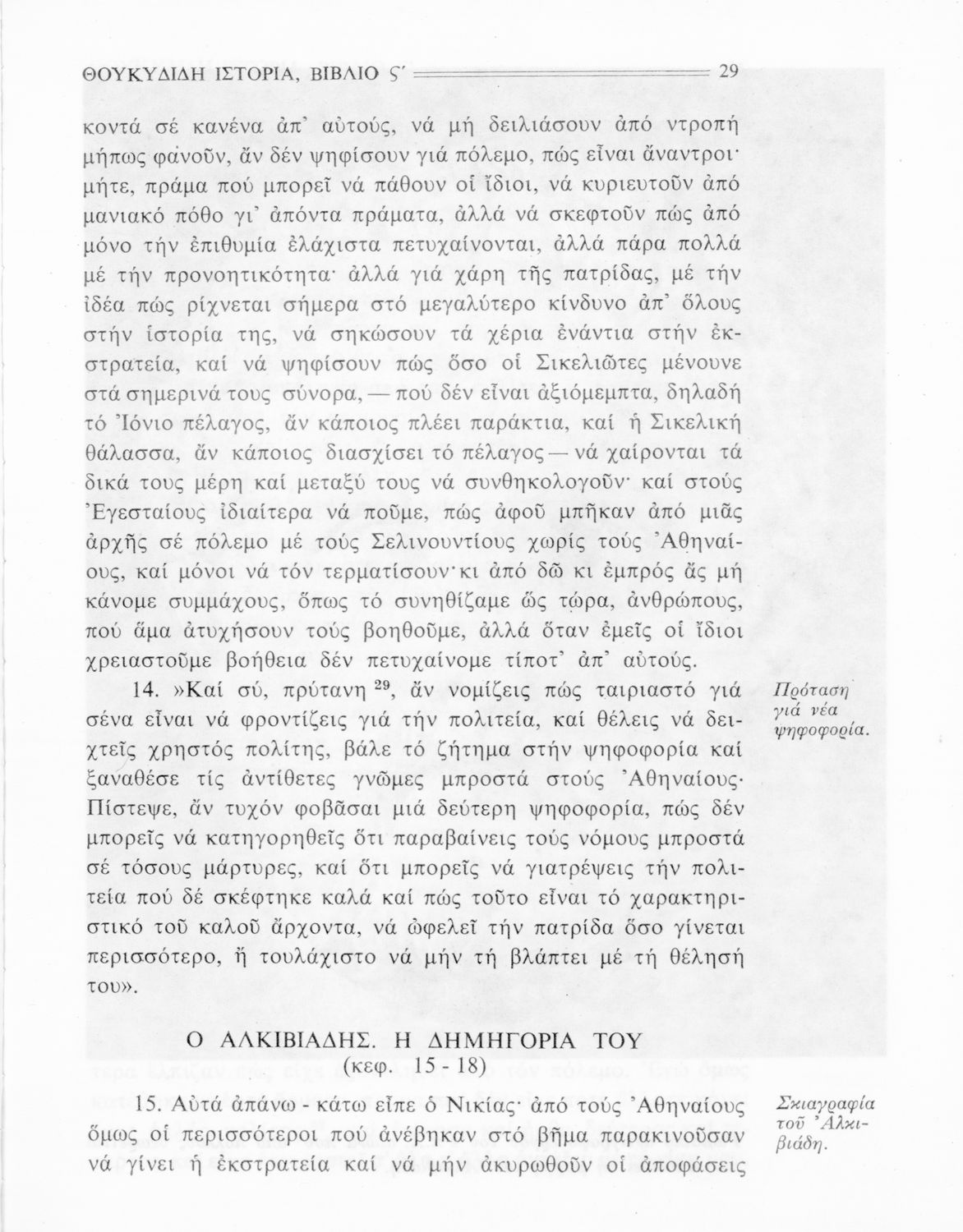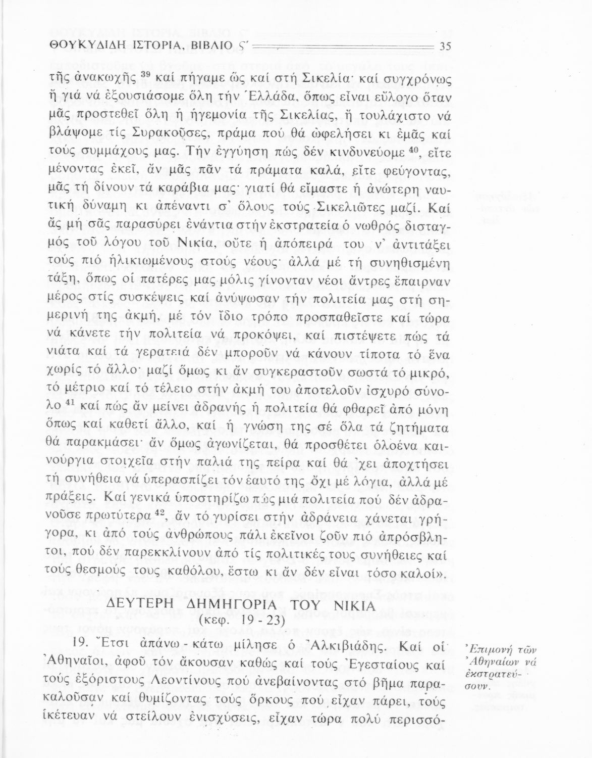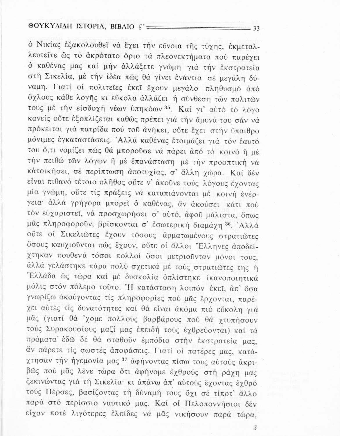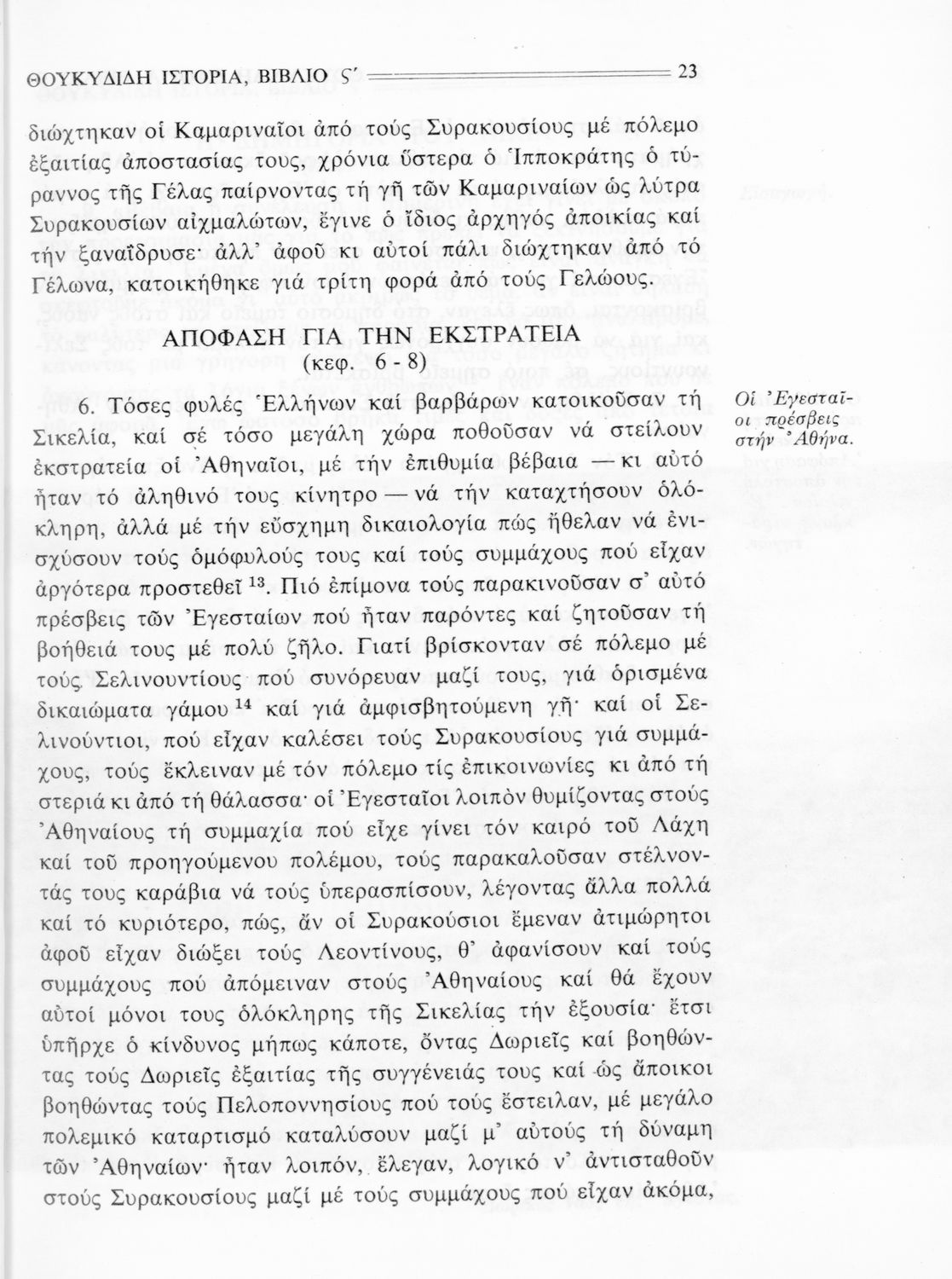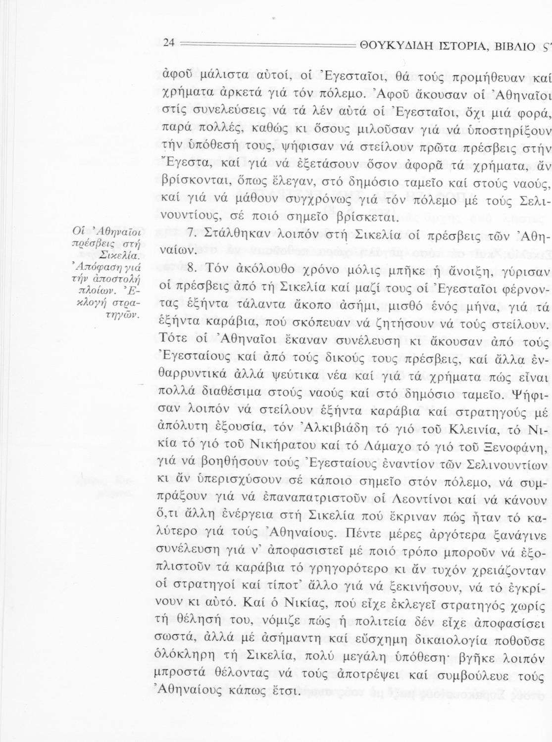 Σχολικό εγχειρίδιο Αρχαίων Ελληνικών Β΄ Γυμνασίου που περιλαμβάνει την μετάφραση των βιβλίων ΣΤ΄ και Ζ΄ της Ιστορίας του Θουκυδίδη, εισαγωγή στη ζωή και το έργο του, και ερμηνευτικά και πραγματολογικά σχόλια.