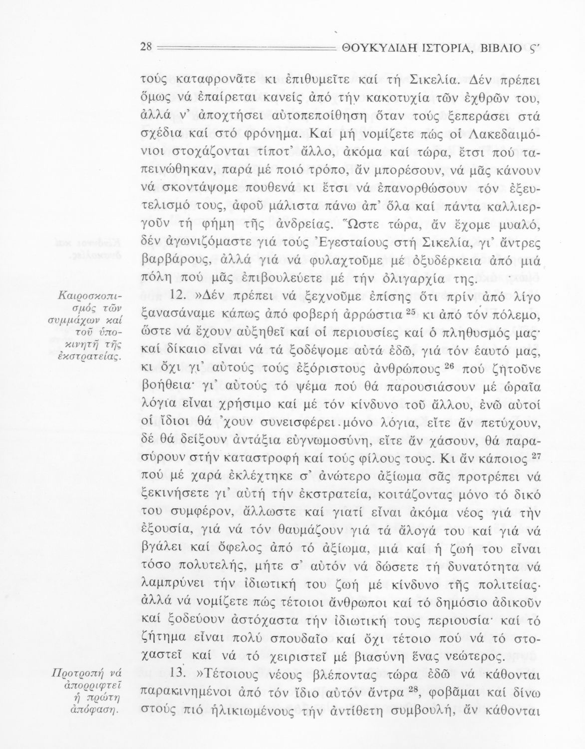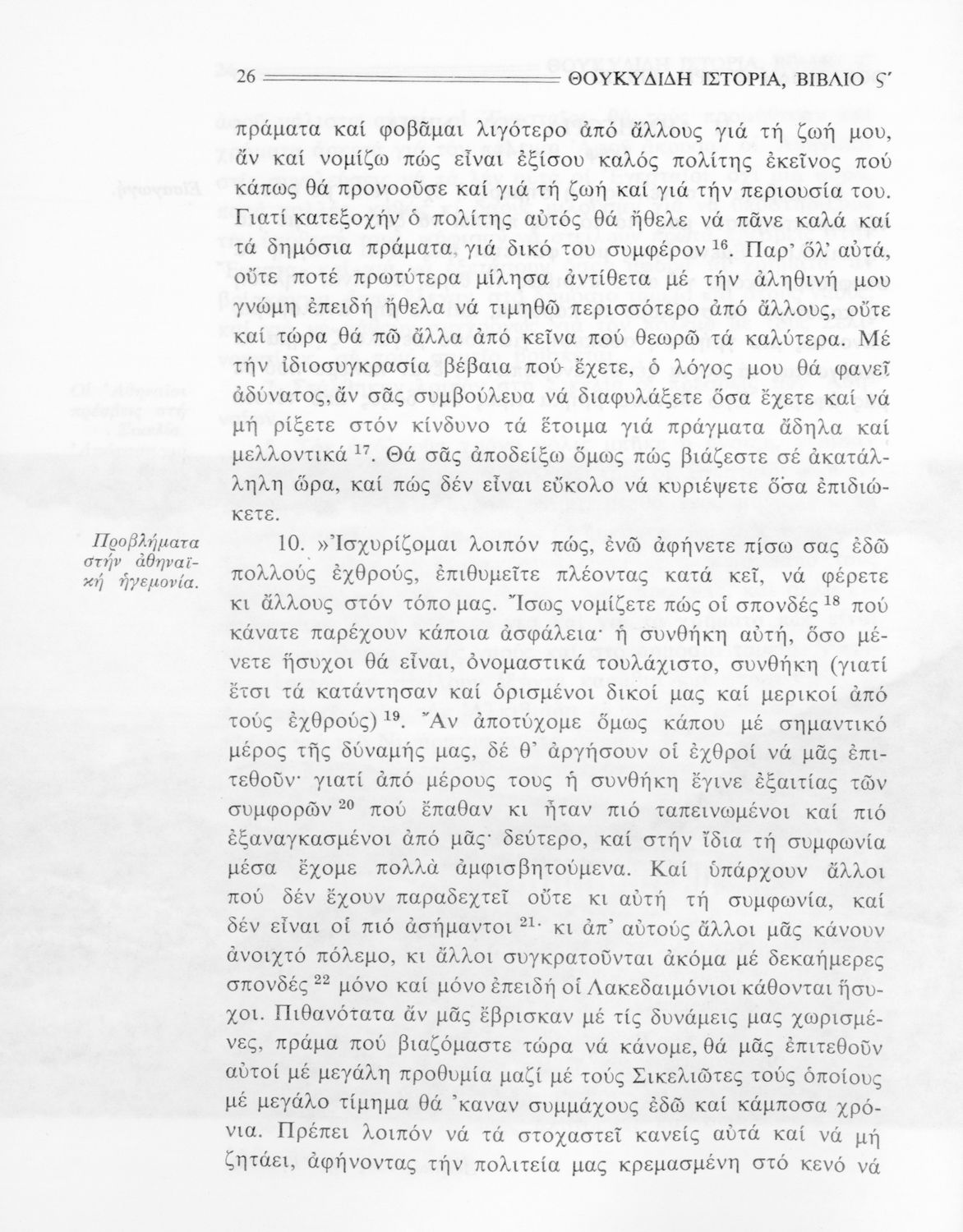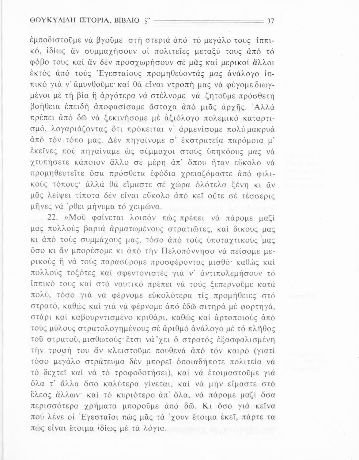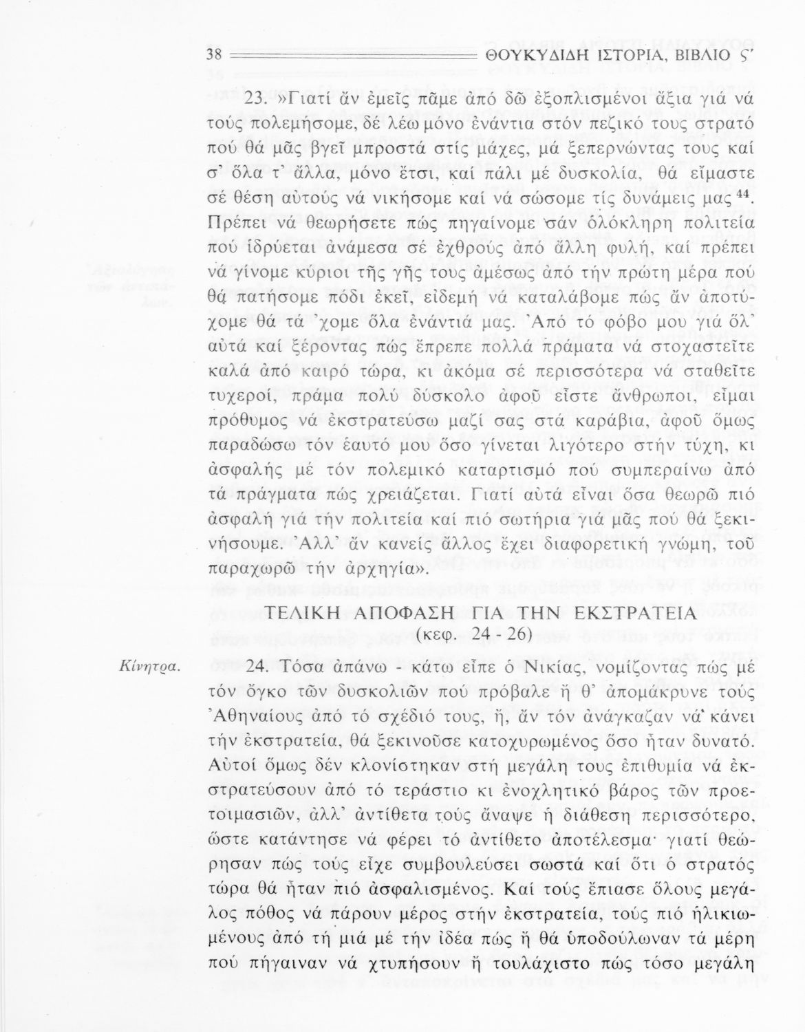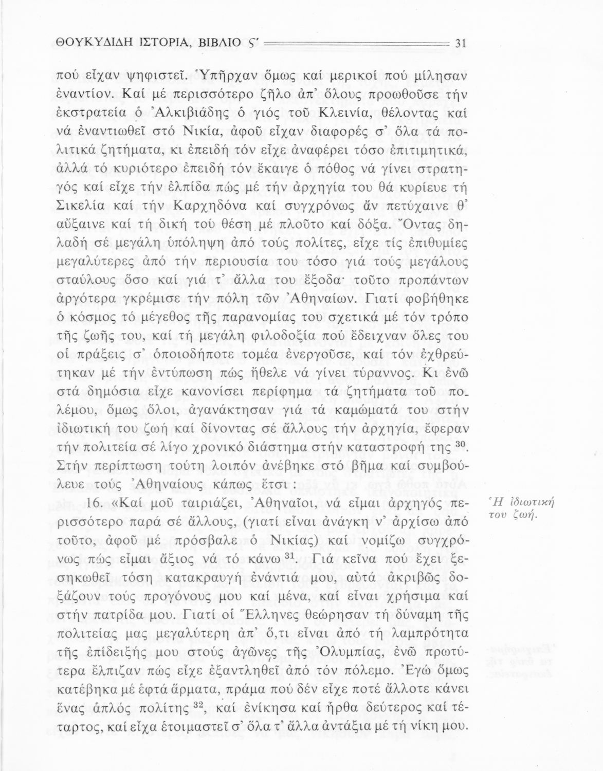 Σχολικό εγχειρίδιο Αρχαίων Ελληνικών Β΄ Γυμνασίου που περιλαμβάνει την μετάφραση των βιβλίων ΣΤ΄ και Ζ΄ της Ιστορίας του Θουκυδίδη, εισαγωγή στη ζωή και το έργο του, και ερμηνευτικά και πραγματολογικά σχόλια.