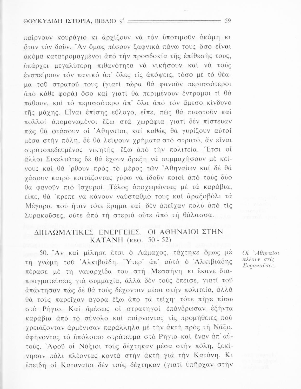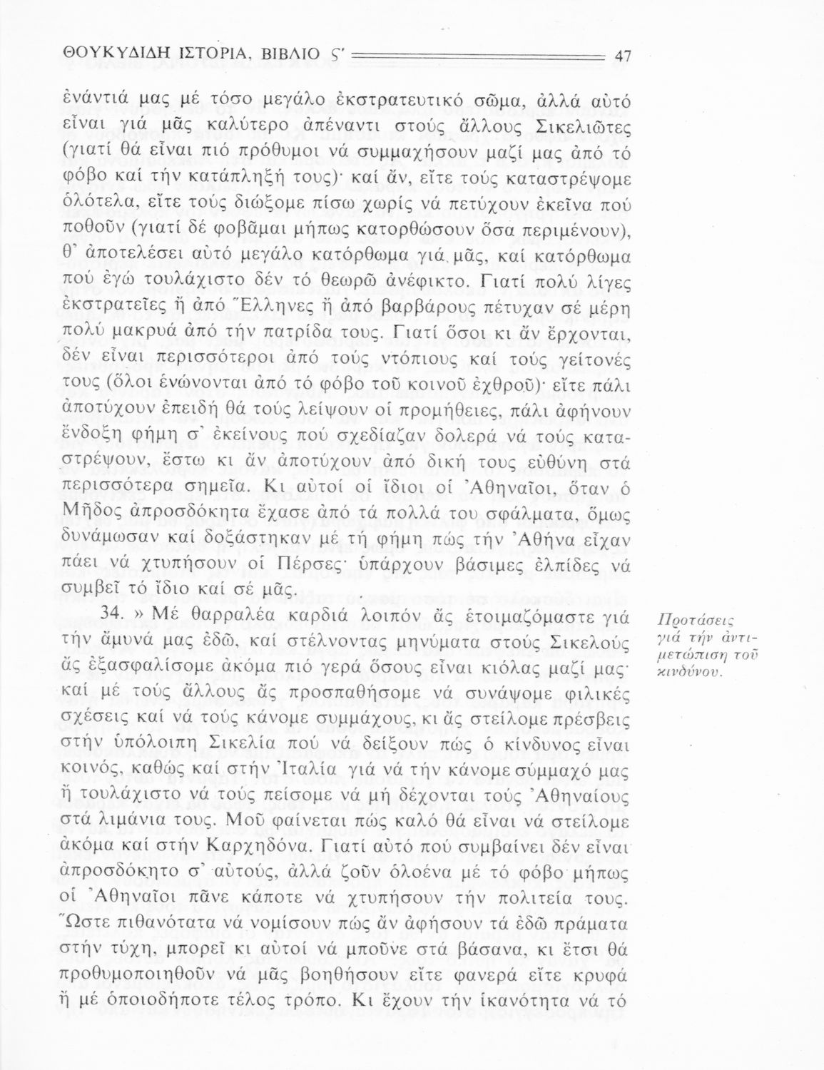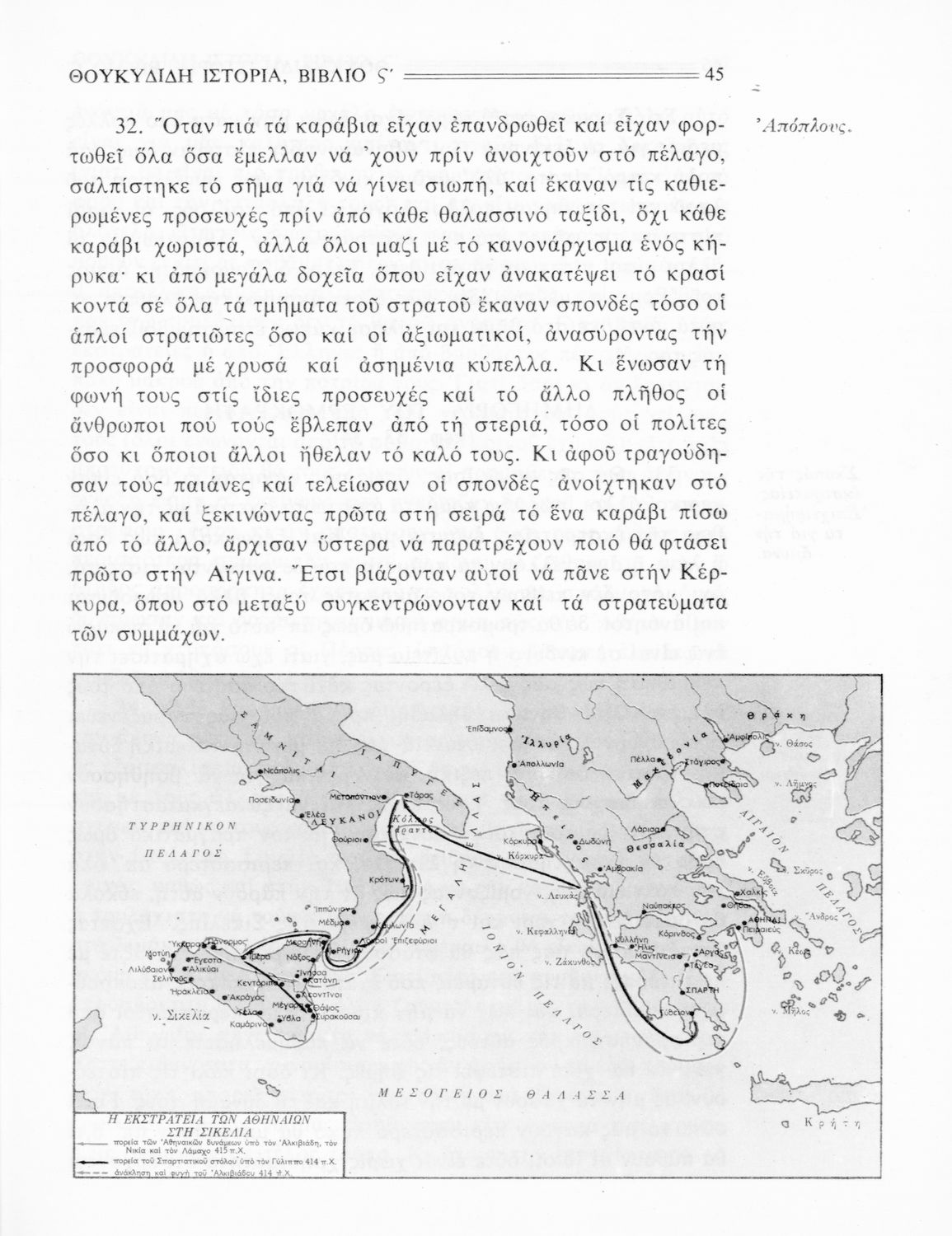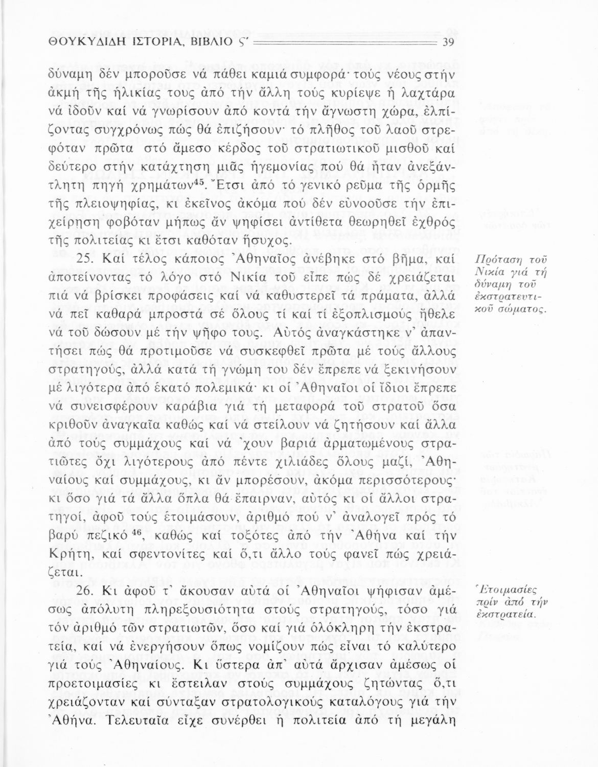 Σχολικό εγχειρίδιο Αρχαίων Ελληνικών Β΄ Γυμνασίου που περιλαμβάνει την μετάφραση των βιβλίων ΣΤ΄ και Ζ΄ της Ιστορίας του Θουκυδίδη, εισαγωγή στη ζωή και το έργο του, και ερμηνευτικά και πραγματολογικά σχόλια.