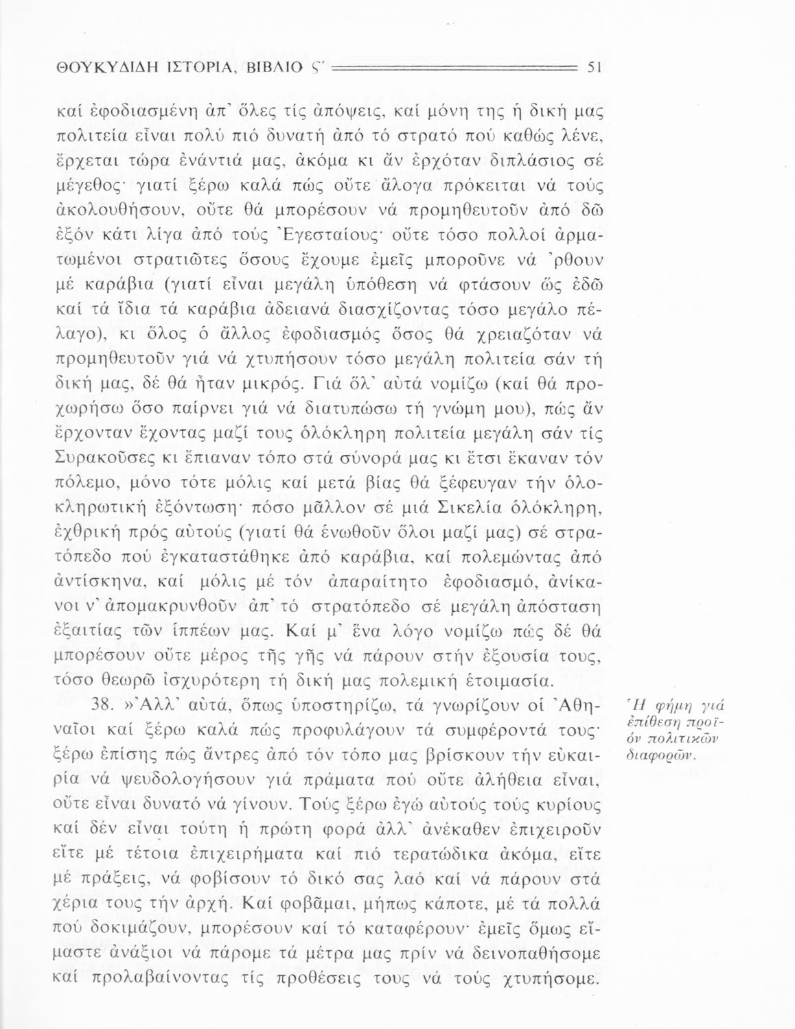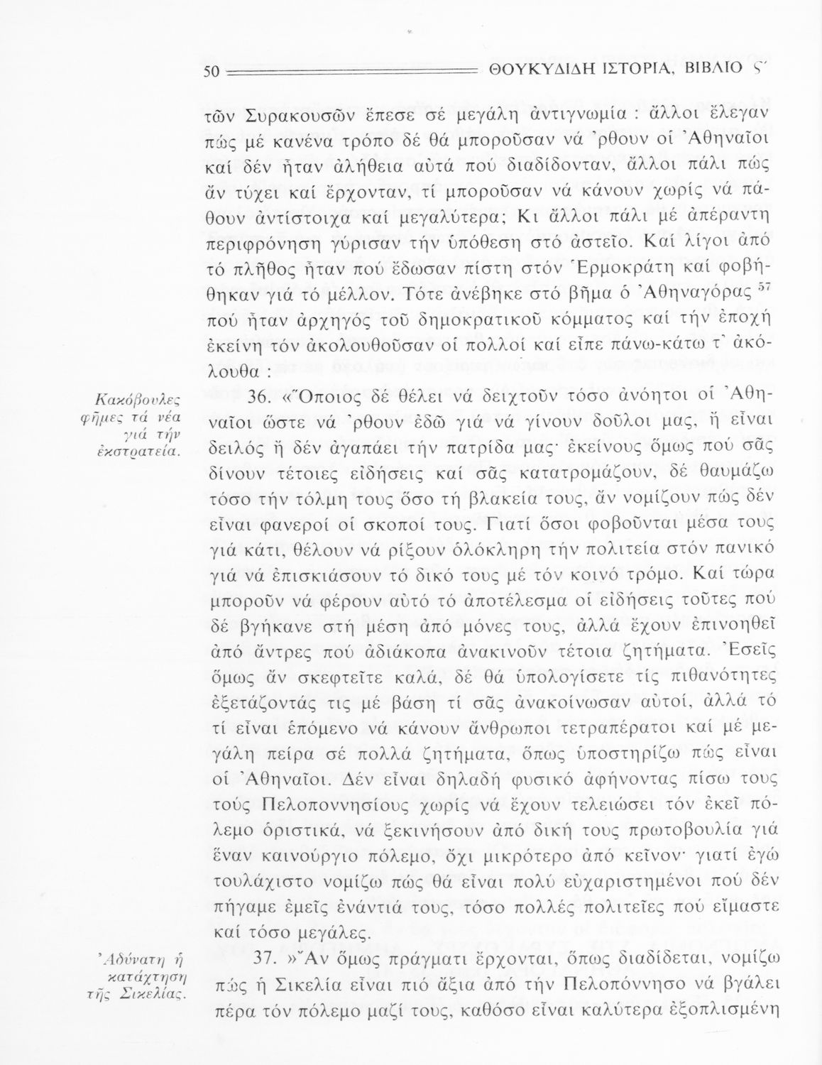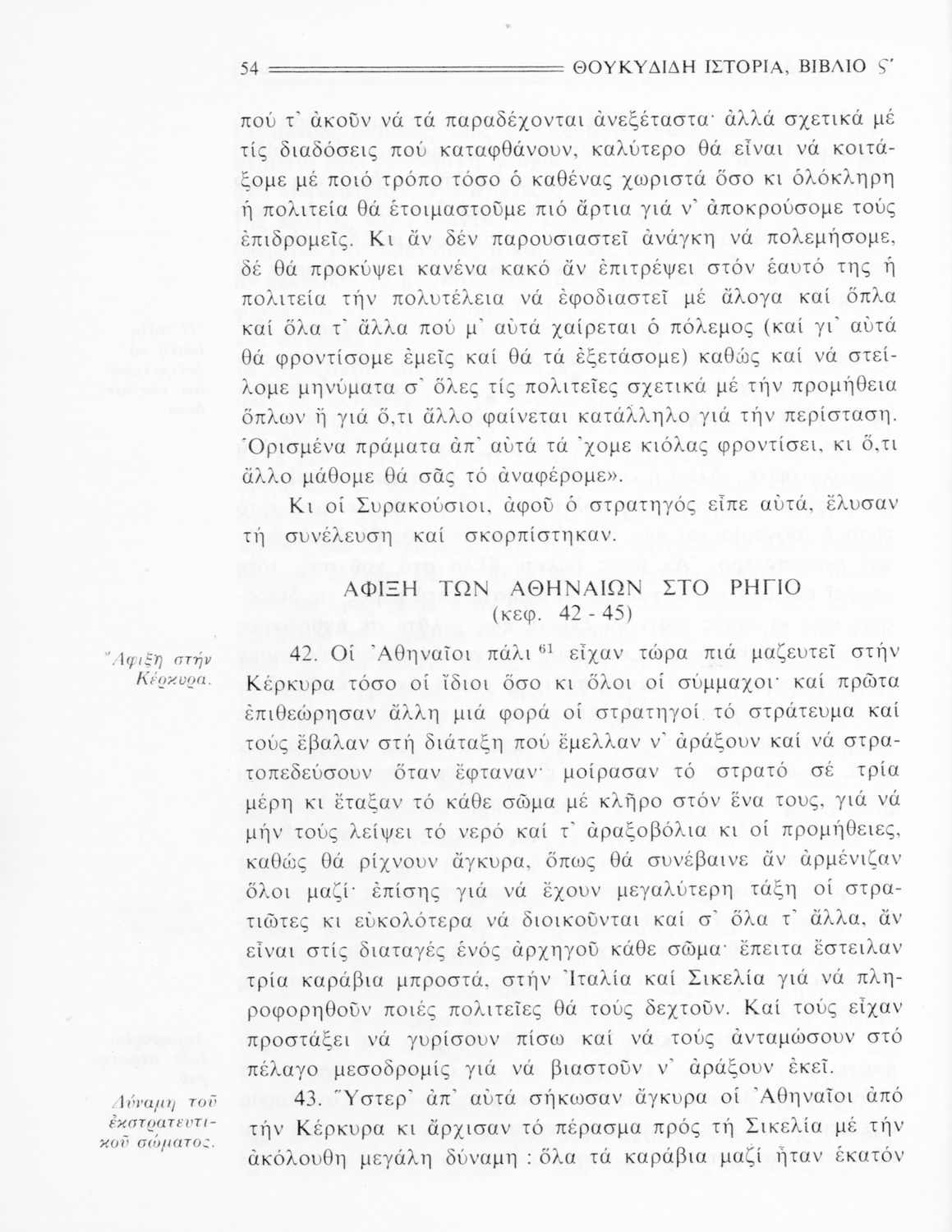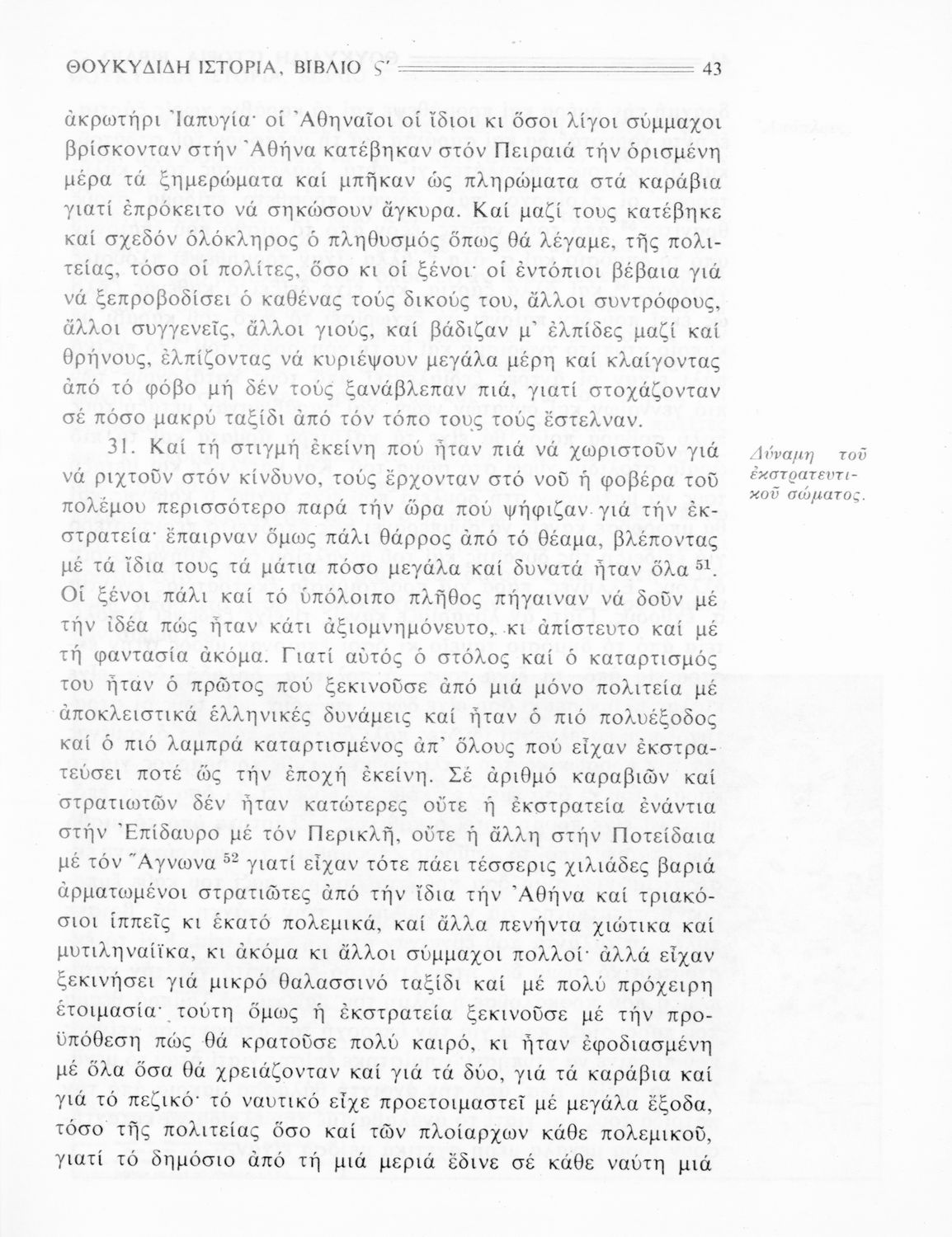 Σχολικό εγχειρίδιο Αρχαίων Ελληνικών Β΄ Γυμνασίου που περιλαμβάνει την μετάφραση των βιβλίων ΣΤ΄ και Ζ΄ της Ιστορίας του Θουκυδίδη, εισαγωγή στη ζωή και το έργο του, και ερμηνευτικά και πραγματολογικά σχόλια.