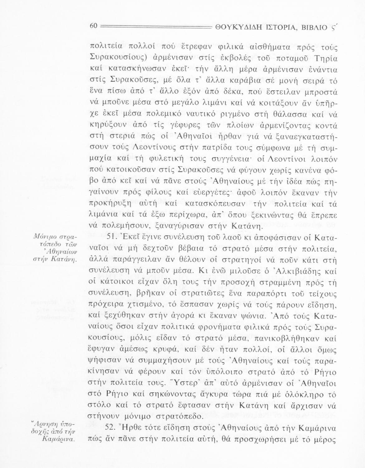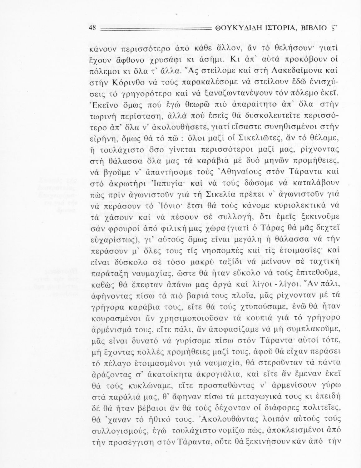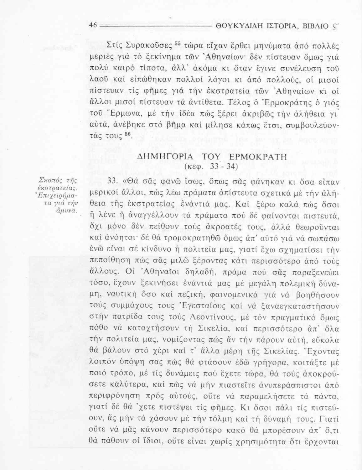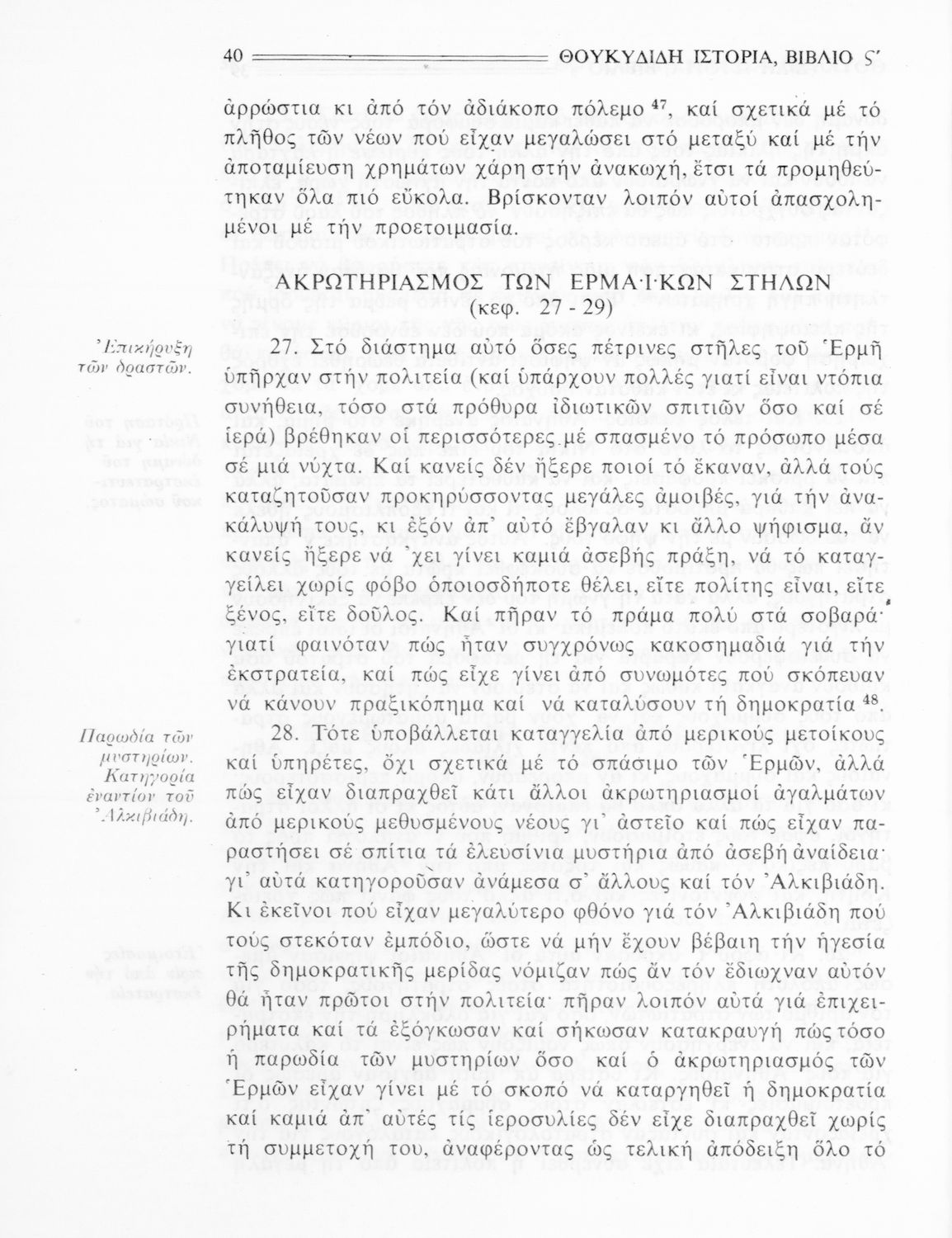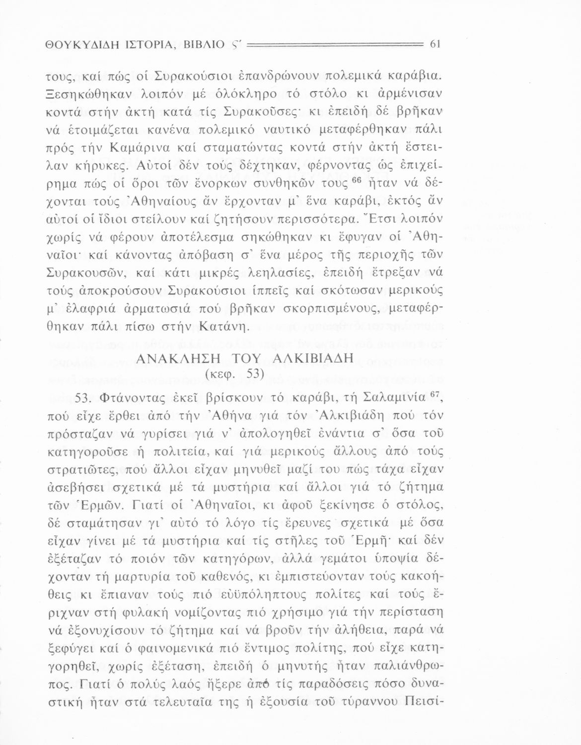 Σχολικό εγχειρίδιο Αρχαίων Ελληνικών Β΄ Γυμνασίου που περιλαμβάνει την μετάφραση των βιβλίων ΣΤ΄ και Ζ΄ της Ιστορίας του Θουκυδίδη, εισαγωγή στη ζωή και το έργο του, και ερμηνευτικά και πραγματολογικά σχόλια.