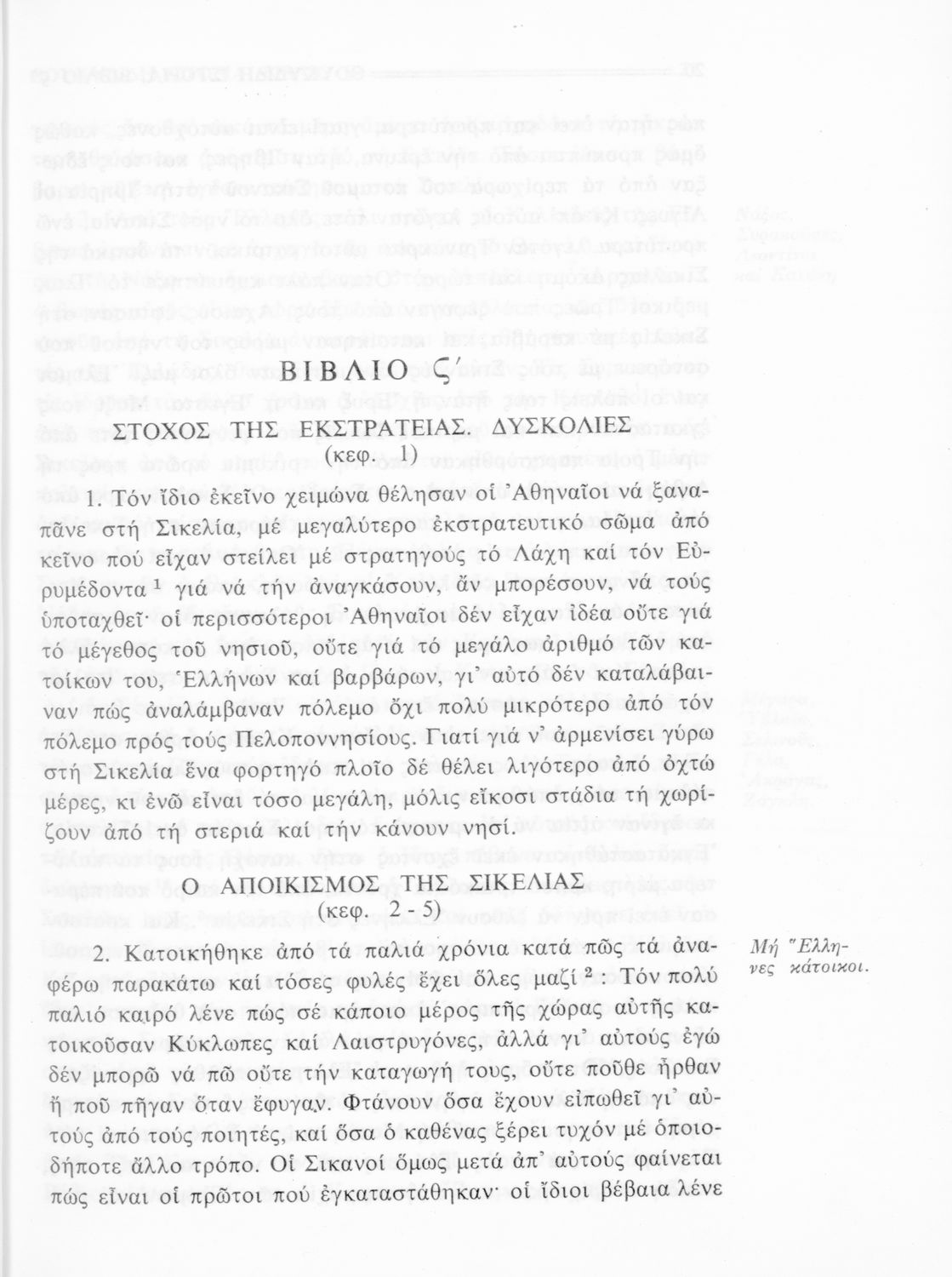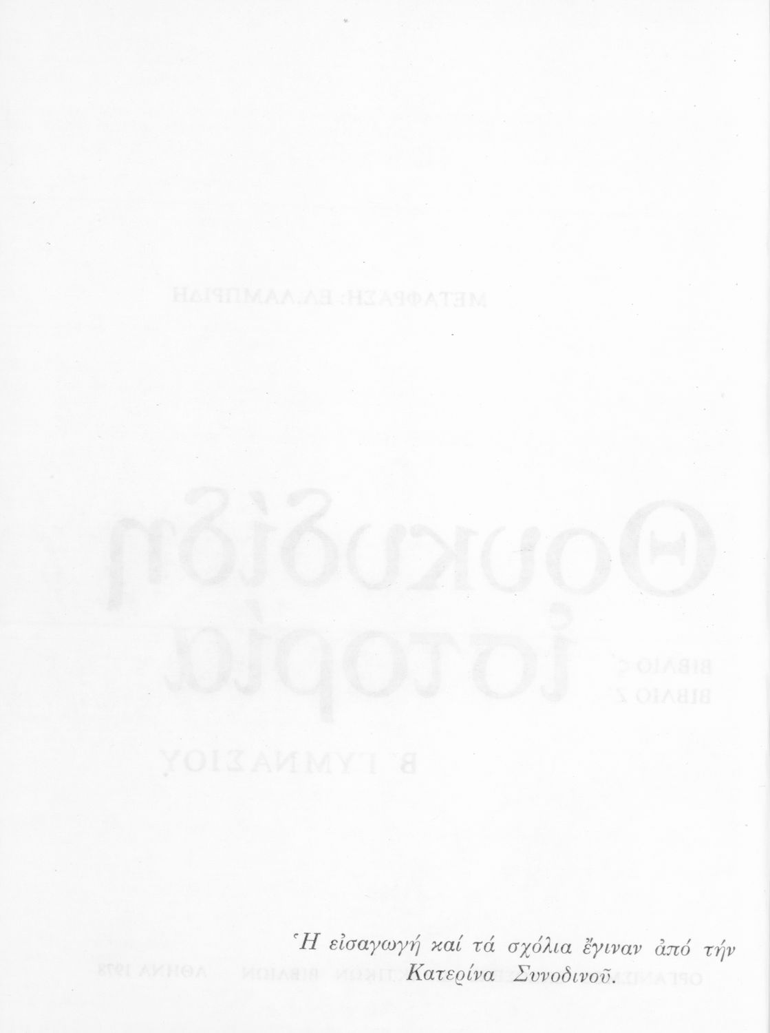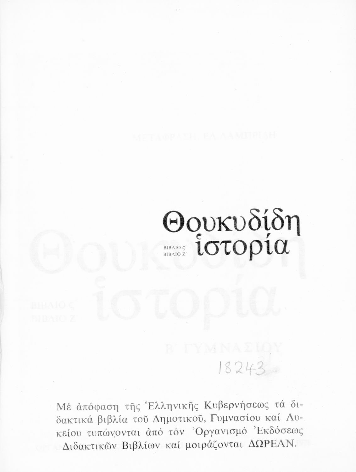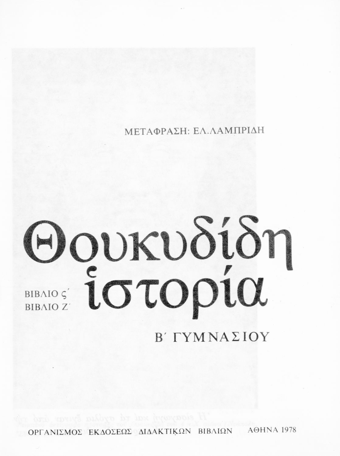 Σχολικό εγχειρίδιο Αρχαίων Ελληνικών Β΄ Γυμνασίου που περιλαμβάνει την μετάφραση των βιβλίων ΣΤ΄ και Ζ΄ της Ιστορίας του Θουκυδίδη, εισαγωγή στη ζωή και το έργο του, και ερμηνευτικά και πραγματολογικά σχόλια.