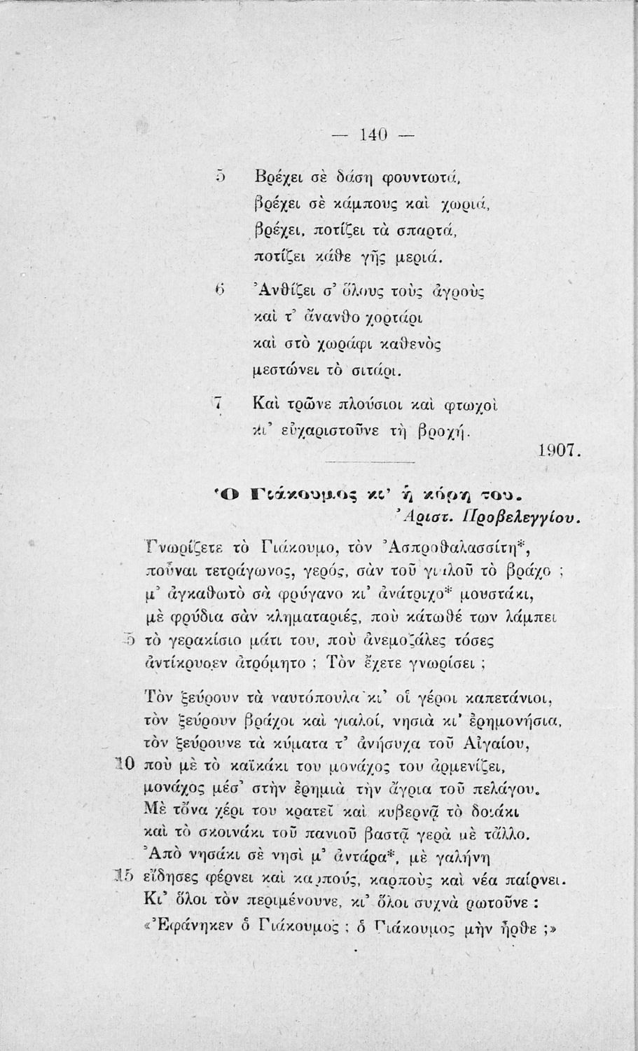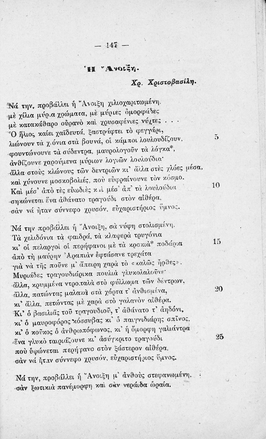 Σχολικό εγχειρίδιο για την Β΄ Γυμνασίου και την Γ΄ Αστικού Θηλέων για το μάθημα των Νέων Ελληνικών. Το εγχειρίδιο αποτελείται από κείμενα πεζού λόγου, επικολυρικά ποιήματα, ωδές, ηθογραφικά διηγήματα, ρητορικά