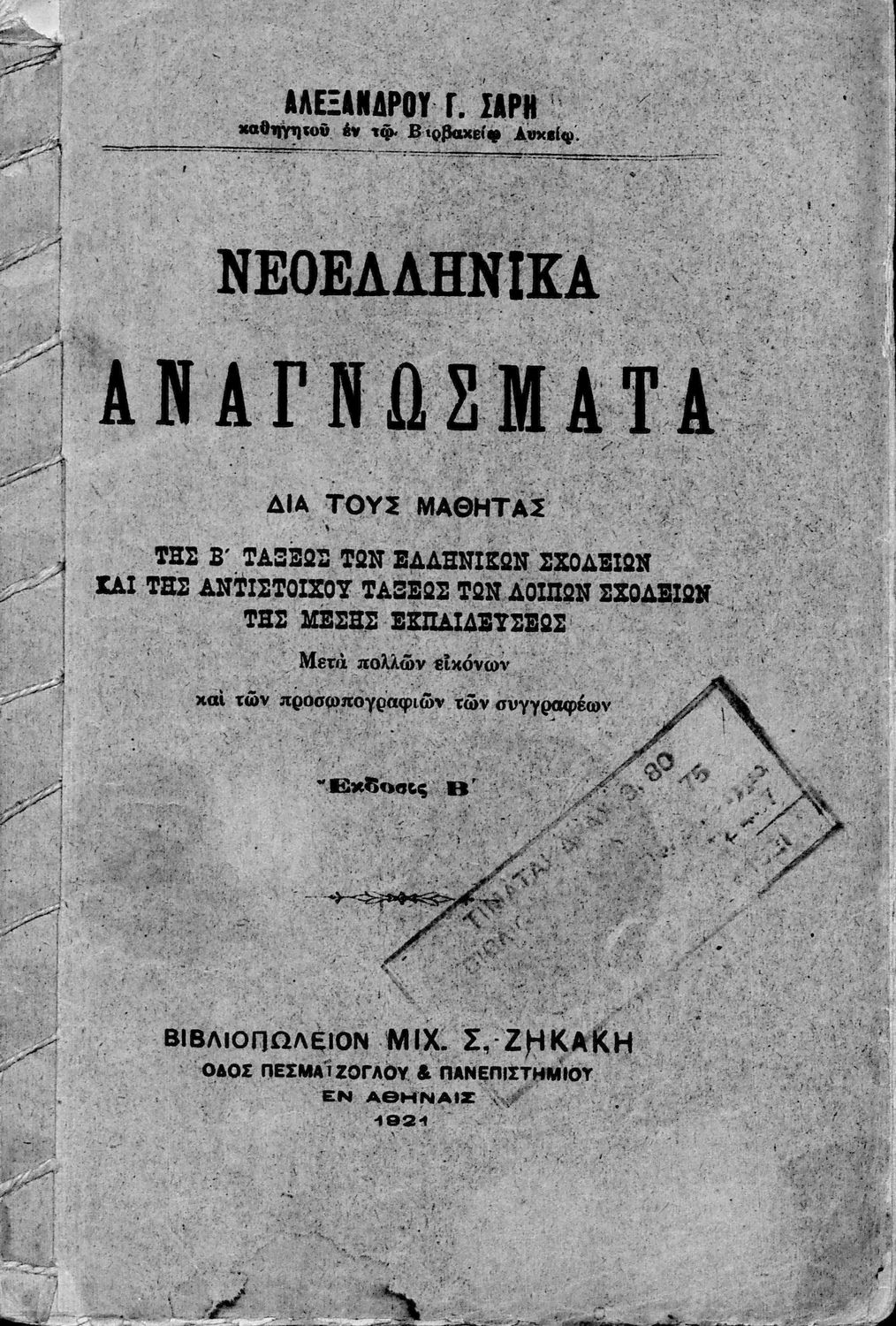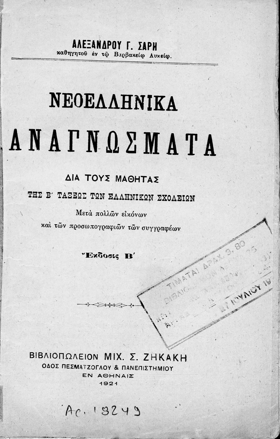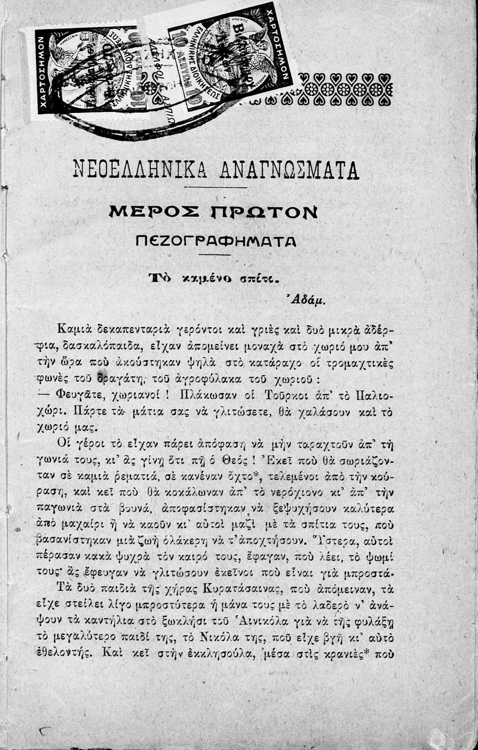 Τίτλος: Νεοελληνικά αναγνώσματα δια τους μαθητάς της Β΄ Τάξεως των Ελληνικών σχολείων