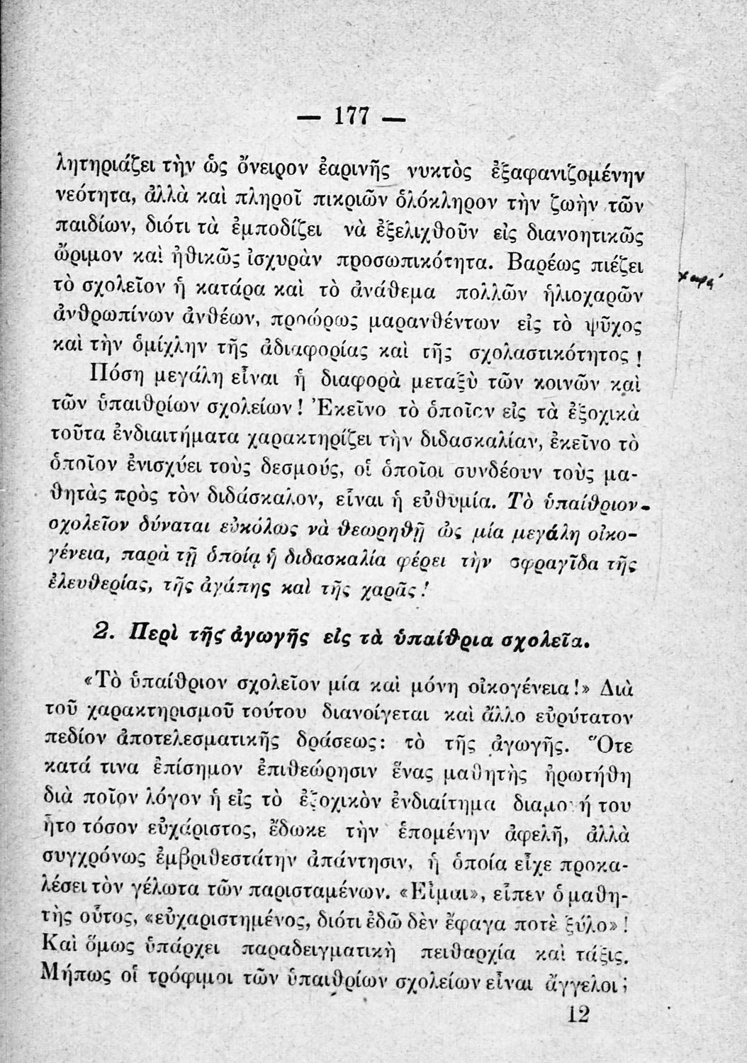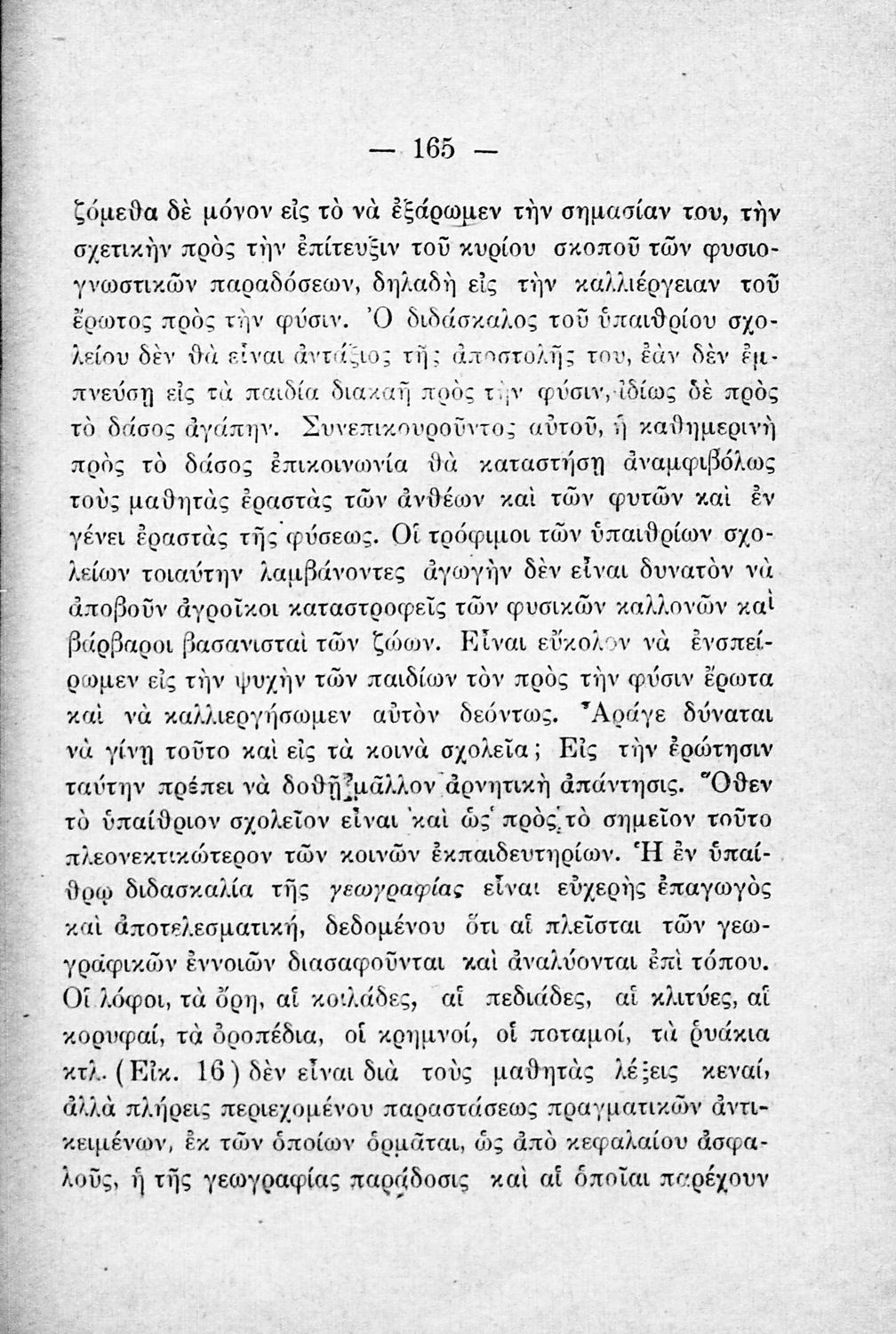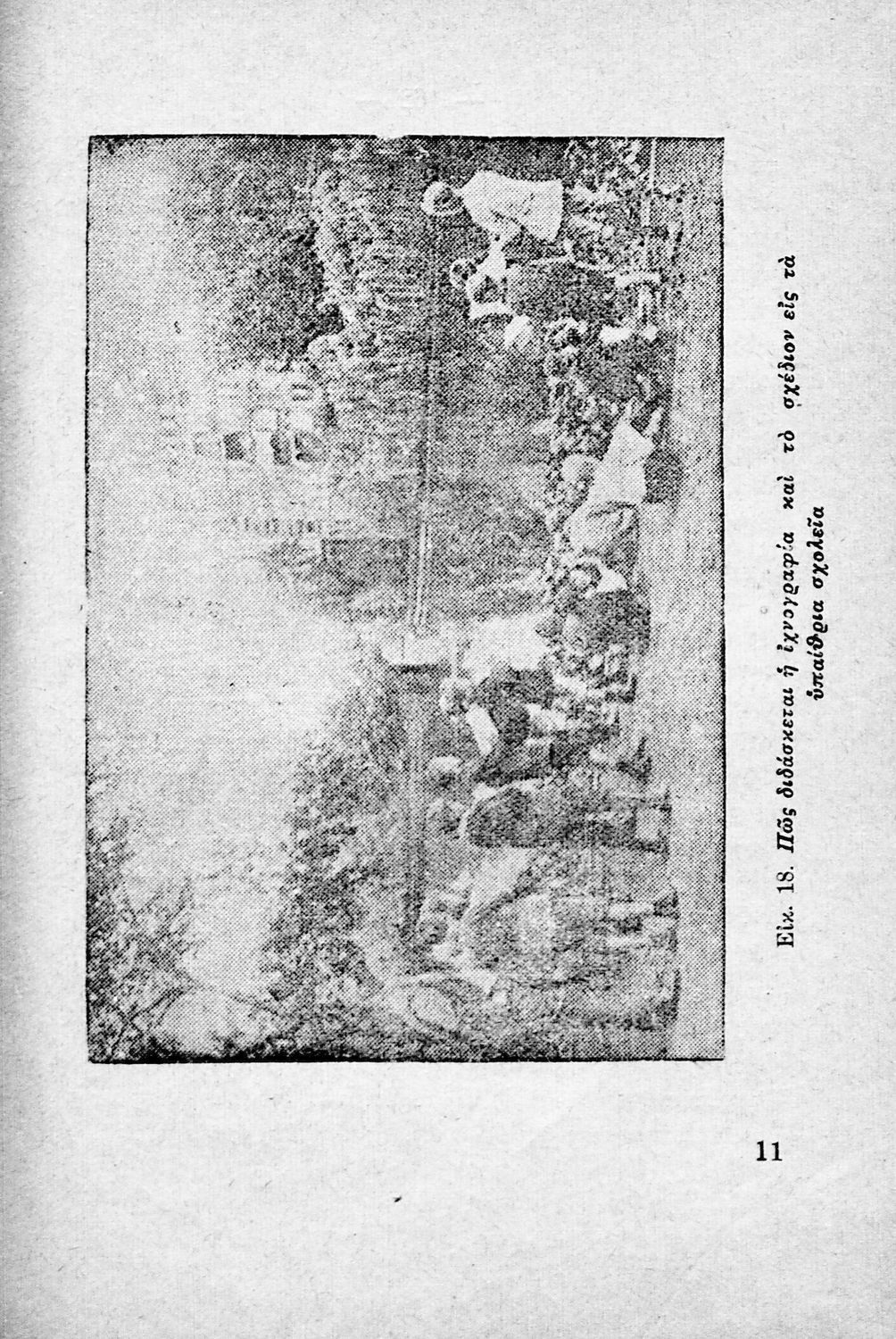 Παρουσίαση περιεχομένου: Παιδαγωγικό βοήθημα που βασίζεται στο «υγειονολογικό και παιδαγωγικό σύστημα της υπαίθριας διδασκαλίας σύμφωνα με τα τελευταία για την εποχή πορίσματα της παιδολογίας και σχολικής υγιεινής». Απευθύνεται σε Έλληνες Λειτουργούς της Εκπαίδευσης. Ο συγγραφέας ήταν γιατρός, τμηματάρχης της Σχολικής Υγιεινής.