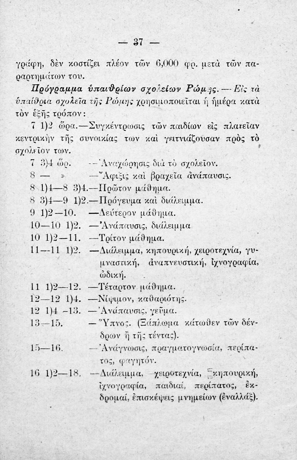 Παρουσίαση περιεχομένου: Παιδαγωγικό βοήθημα που βασίζεται στο «υγειονολογικό και παιδαγωγικό σύστημα της υπαίθριας διδασκαλίας σύμφωνα με τα τελευταία για την εποχή πορίσματα της παιδολογίας και σχολικής υγιεινής». Απευθύνεται σε Έλληνες Λειτουργούς της Εκπαίδευσης. Ο συγγραφέας ήταν γιατρός, τμηματάρχης της Σχολικής Υγιεινής.