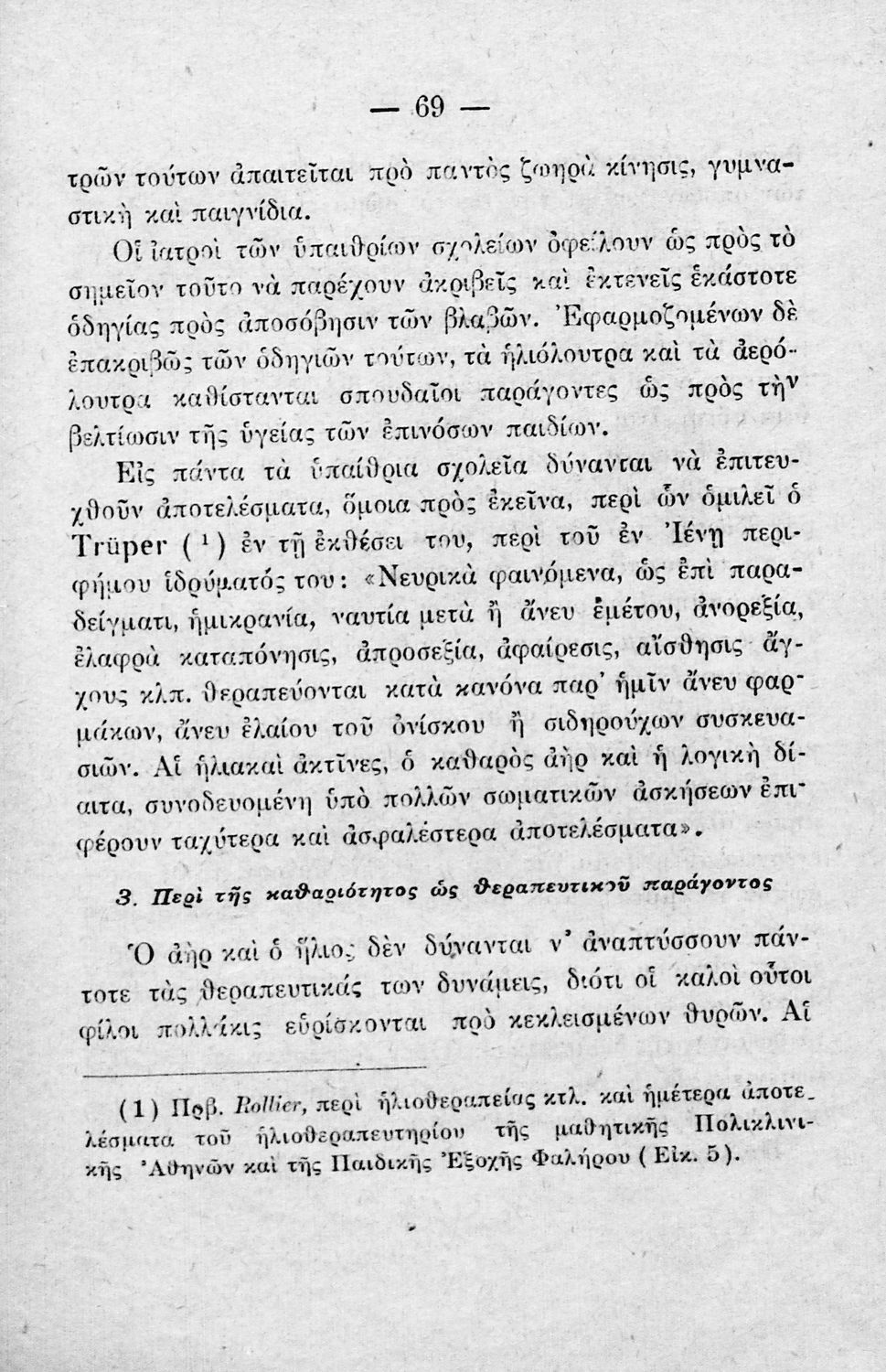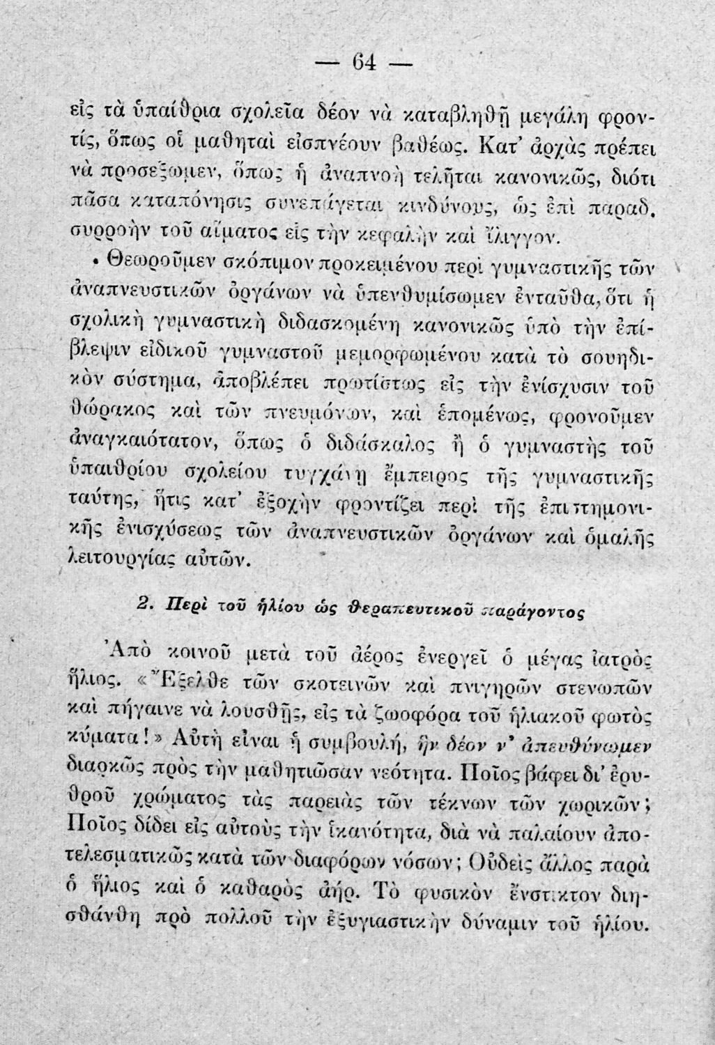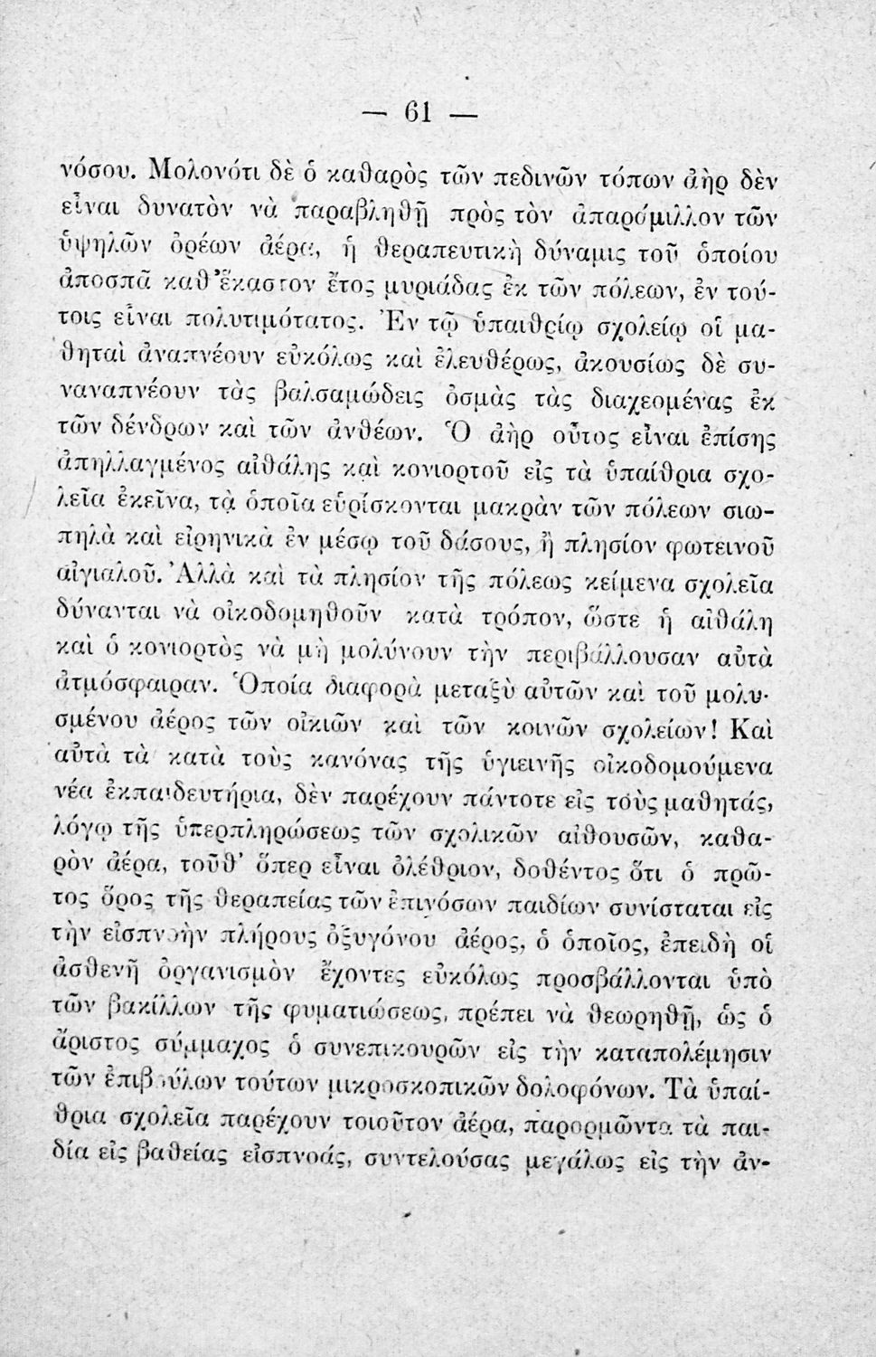 Παιδαγωγικό βοήθημα που βασίζεται στο «υγειονολογικό και παιδαγωγικό σύστημα της υπαίθριας διδασκαλίας σύμφωνα με τα τελευταία για την εποχή πορίσματα της παιδολογίας και σχολικής υγιεινής». Απευθύνεται σε Έλληνες Λειτουργούς της Εκπαίδευσης. Ο συγγραφέας ήταν γιατρός, τμηματάρχης της Σχολικής Υγιεινής.