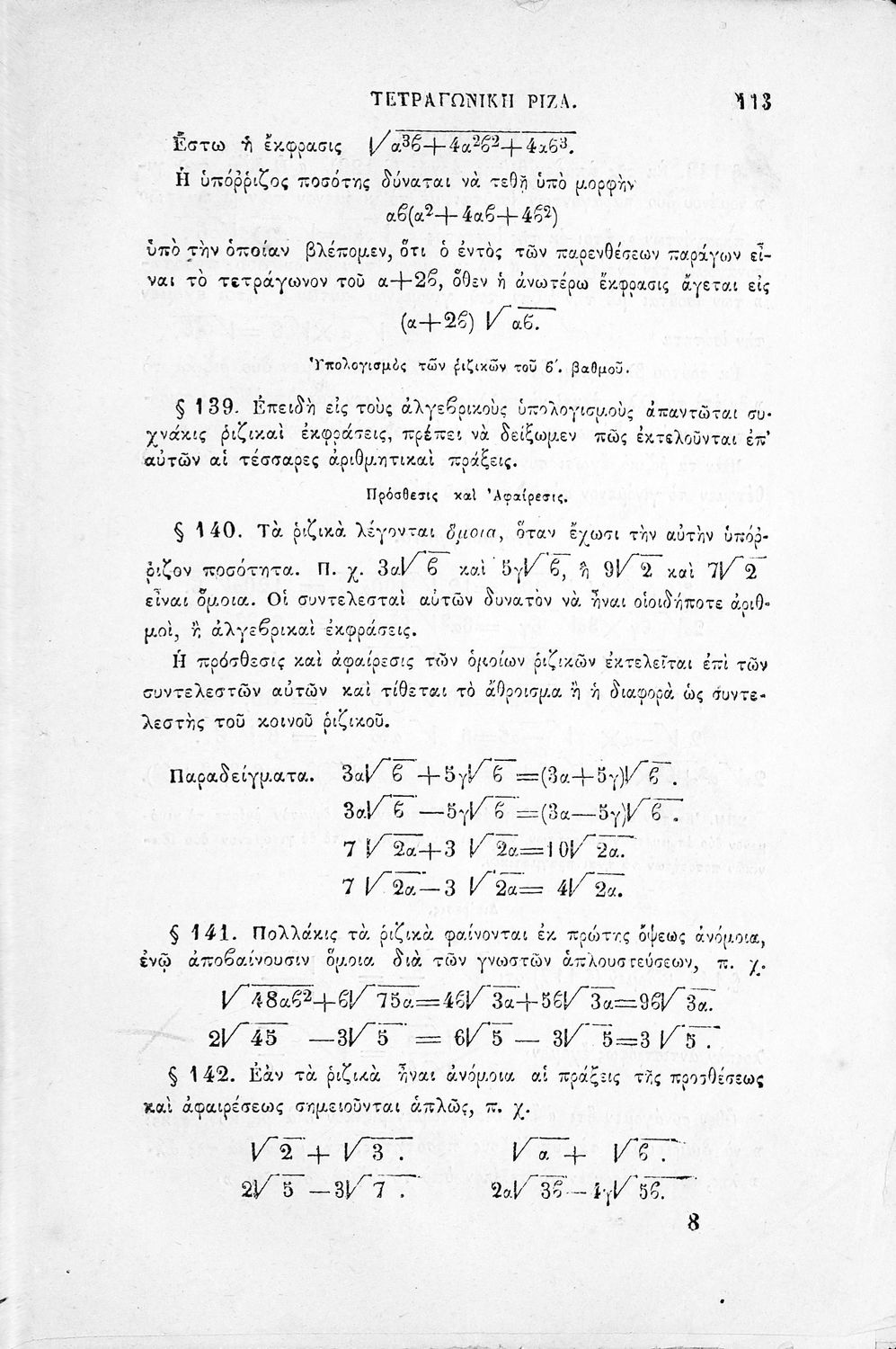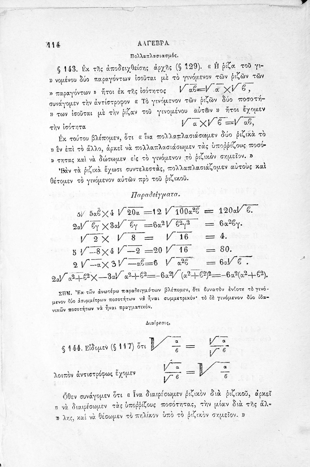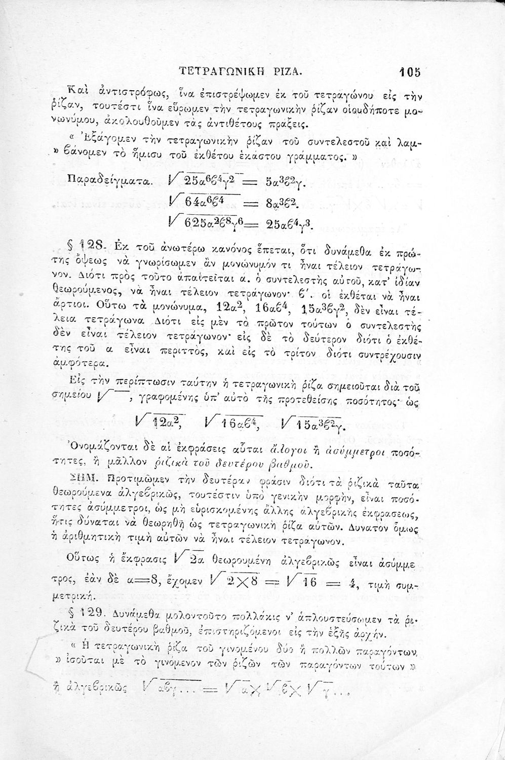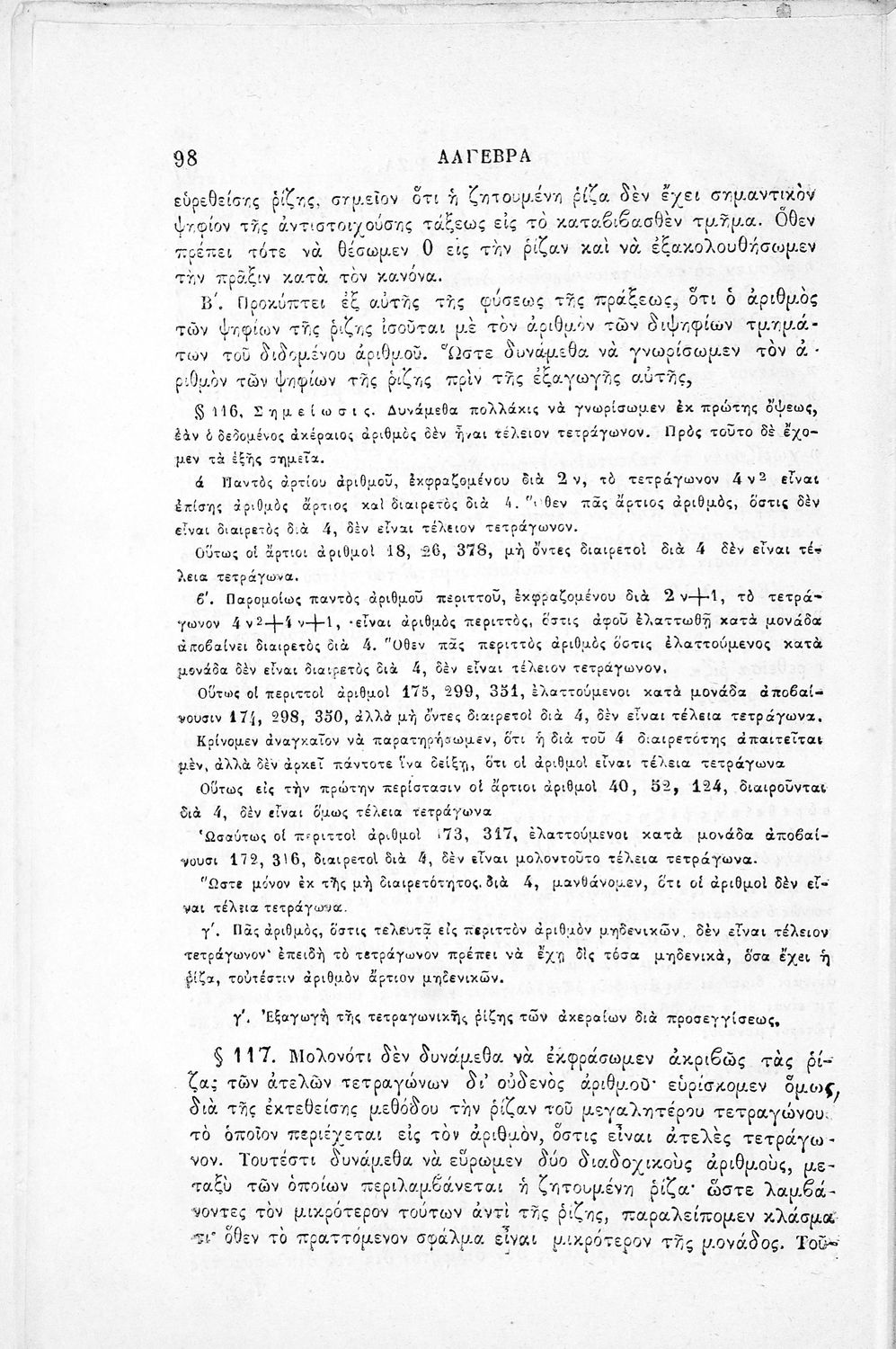 Σχολικό εγχειρίδιο Άλγεβρας Γυμνασίου που περιέχει θεωρία και ασκήσεις. Ο συγγραφέας ήταν υφηγητής στο Εθνικό Πανεπιστήμιο.