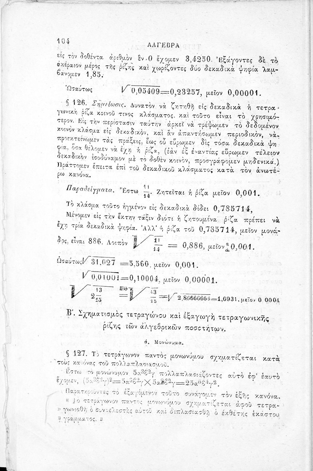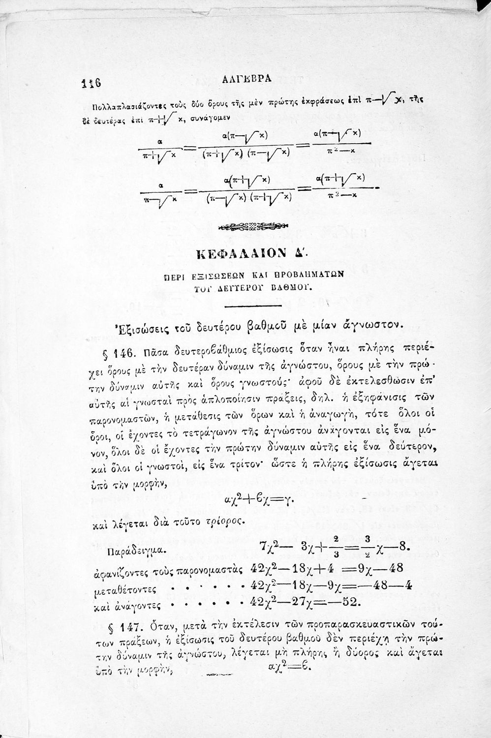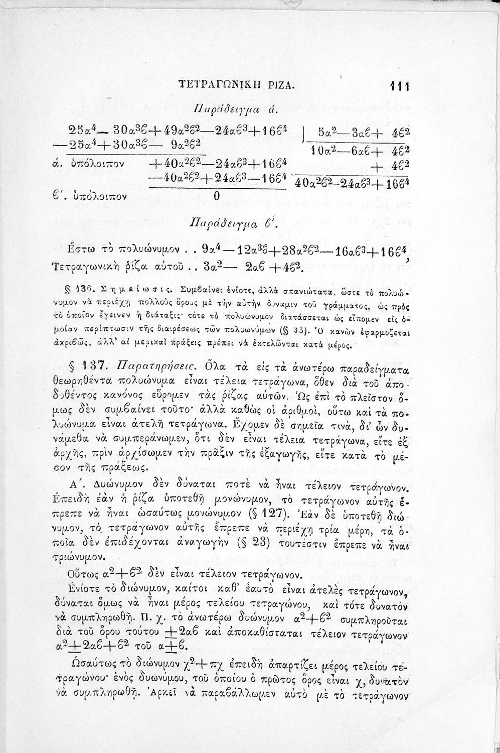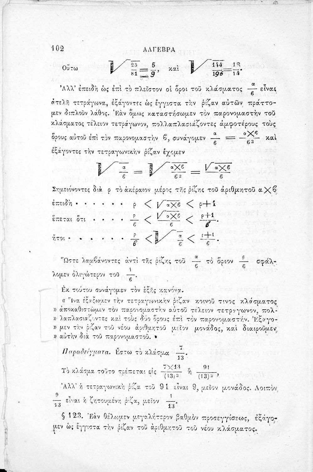 Σχολικό εγχειρίδιο Άλγεβρας Γυμνασίου που περιέχει θεωρία και ασκήσεις. Ο συγγραφέας ήταν υφηγητής στο Εθνικό Πανεπιστήμιο.