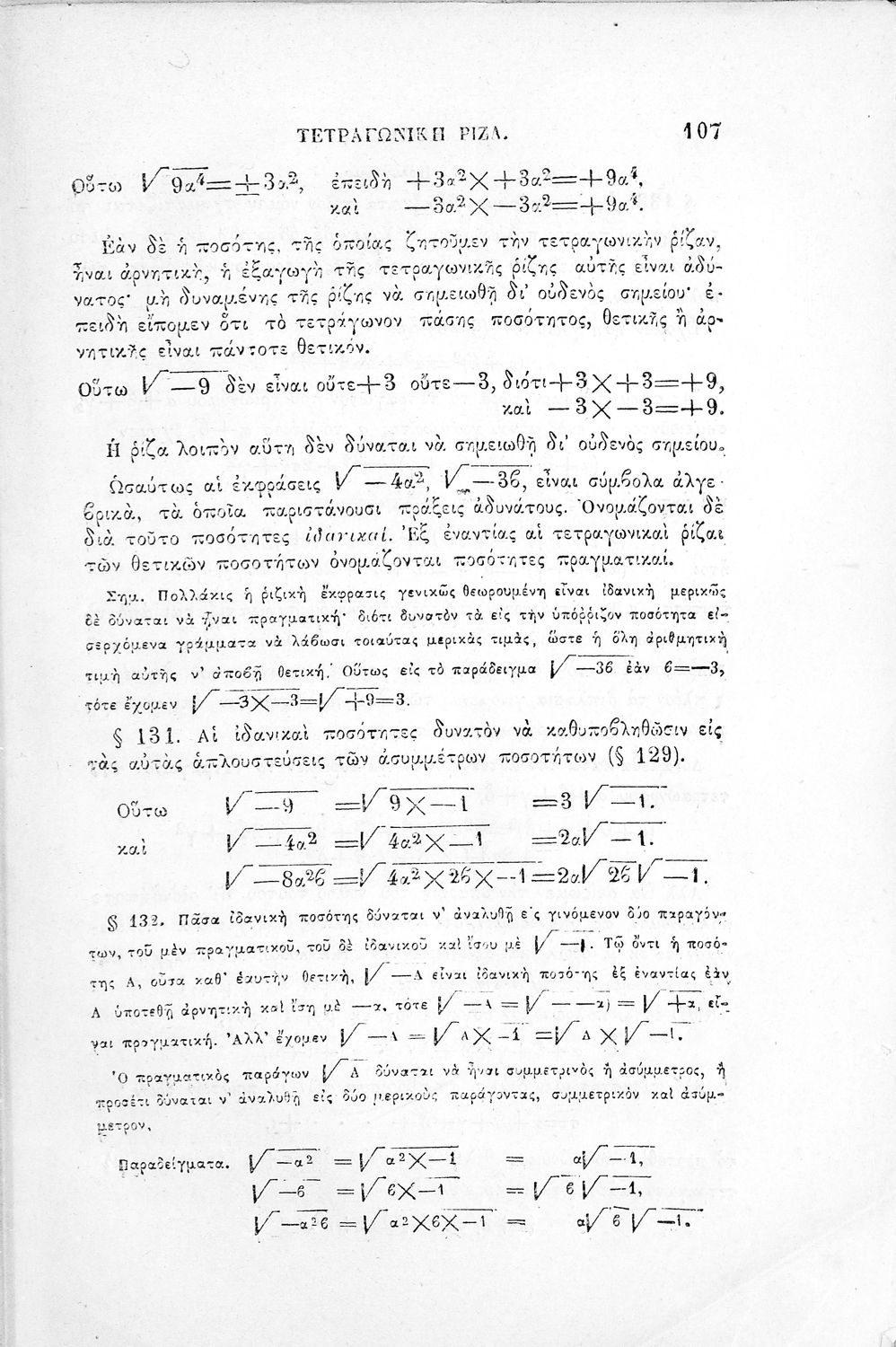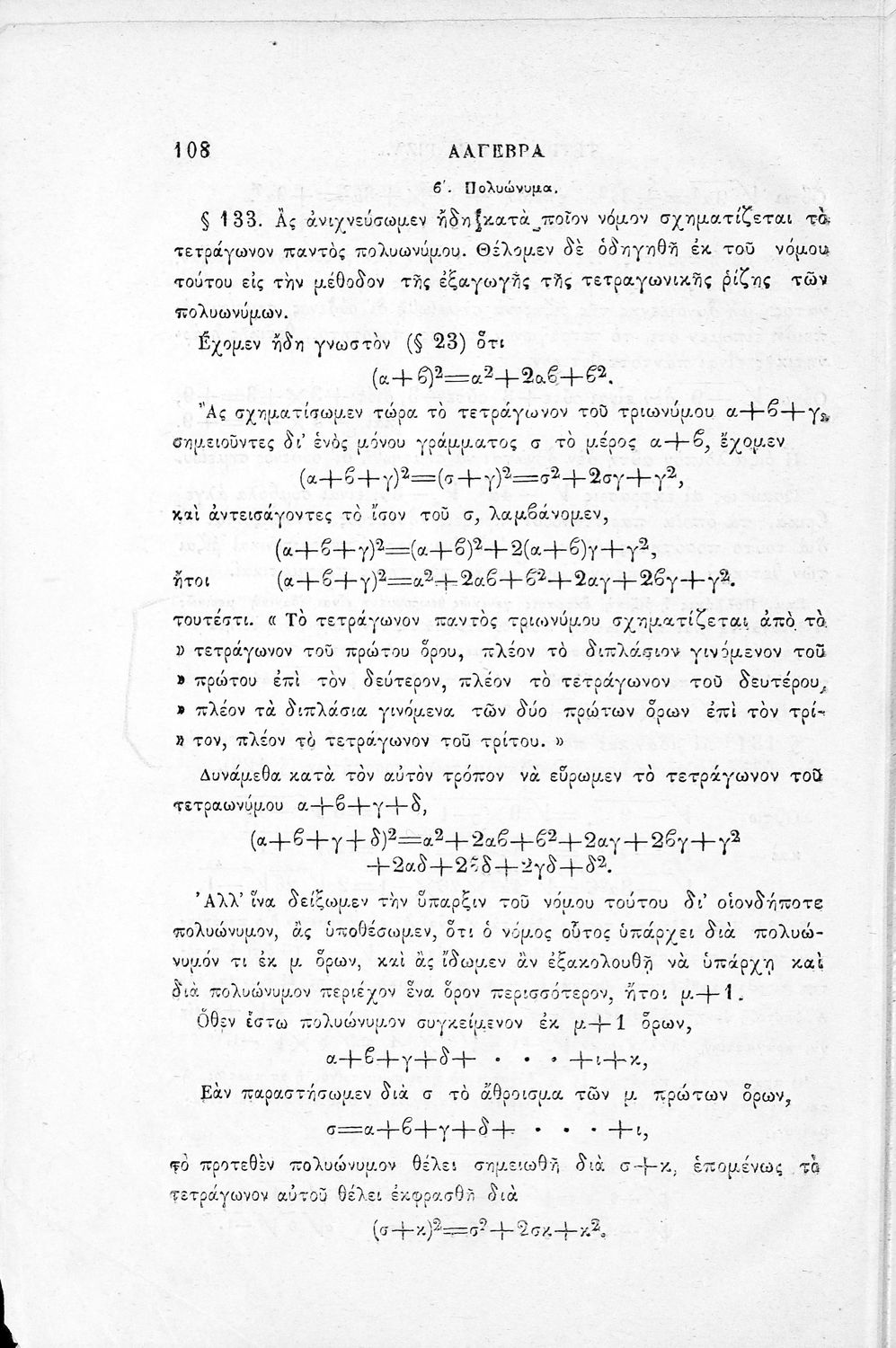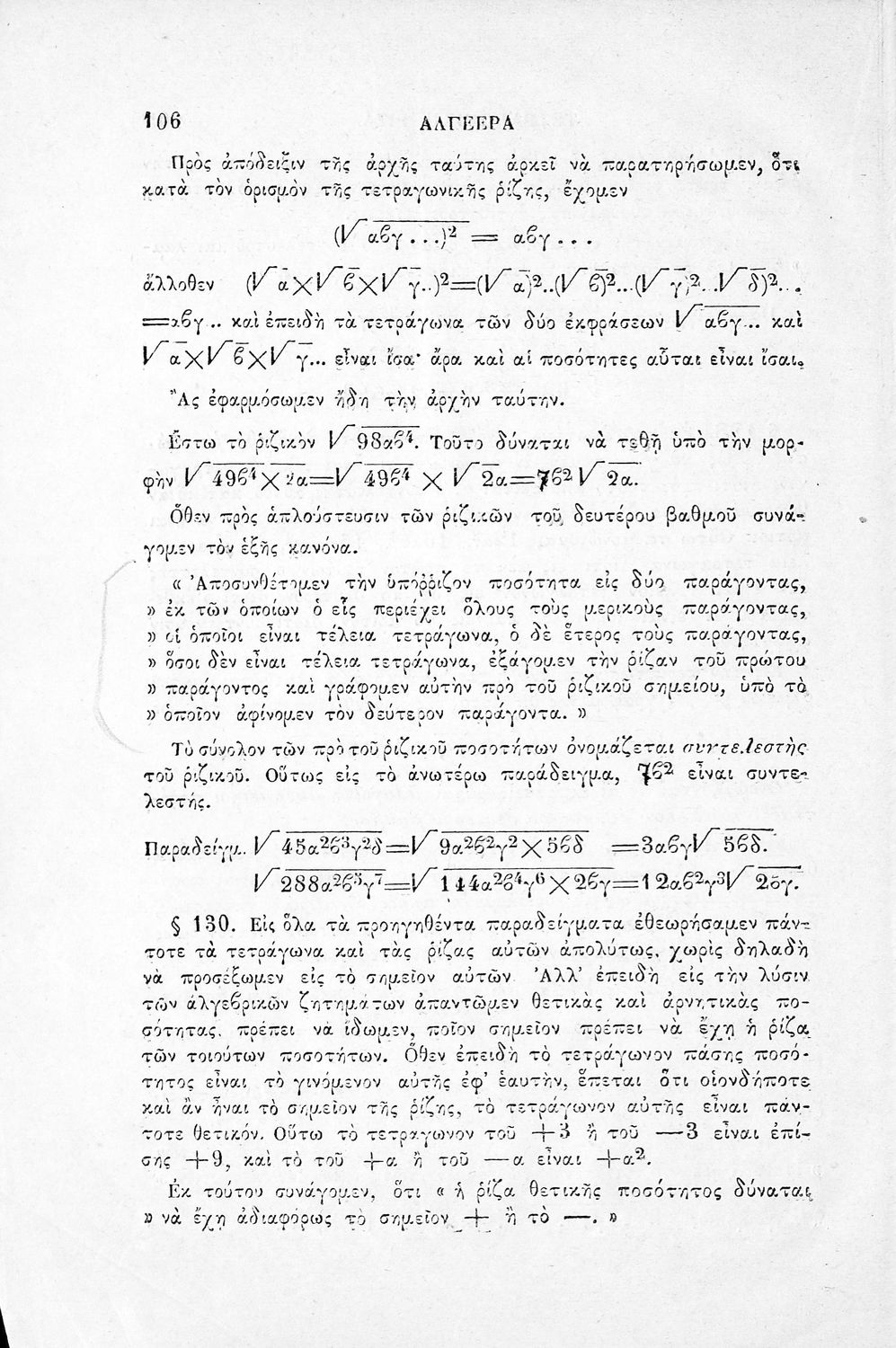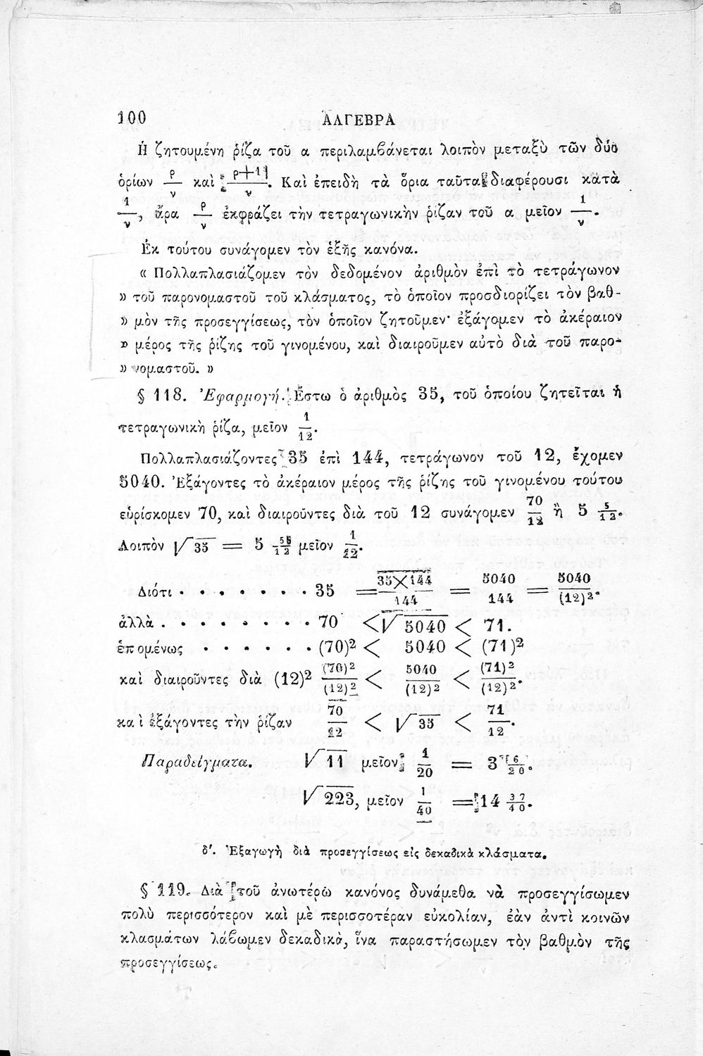 Σχολικό εγχειρίδιο Άλγεβρας Γυμνασίου που περιέχει θεωρία και ασκήσεις. Ο συγγραφέας ήταν υφηγητής στο Εθνικό Πανεπιστήμιο.