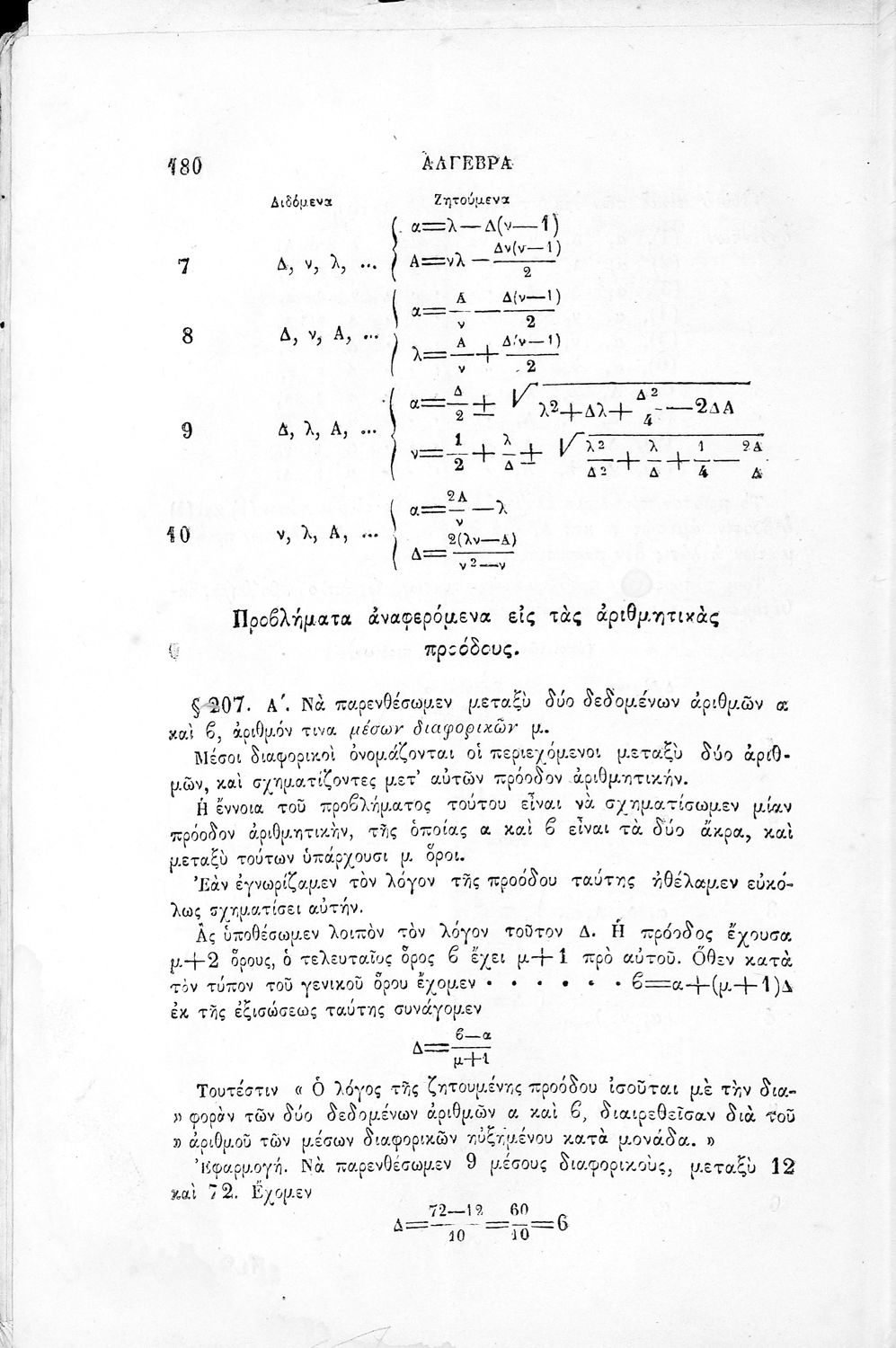 Σχολικό εγχειρίδιο Άλγεβρας που εστιάζει στις αλγεβρικές παραστάσεις, στις εξισώσεις α΄ και β΄ βαθμού, στις αριθμητικές προόδους και στους λογάριθμους.