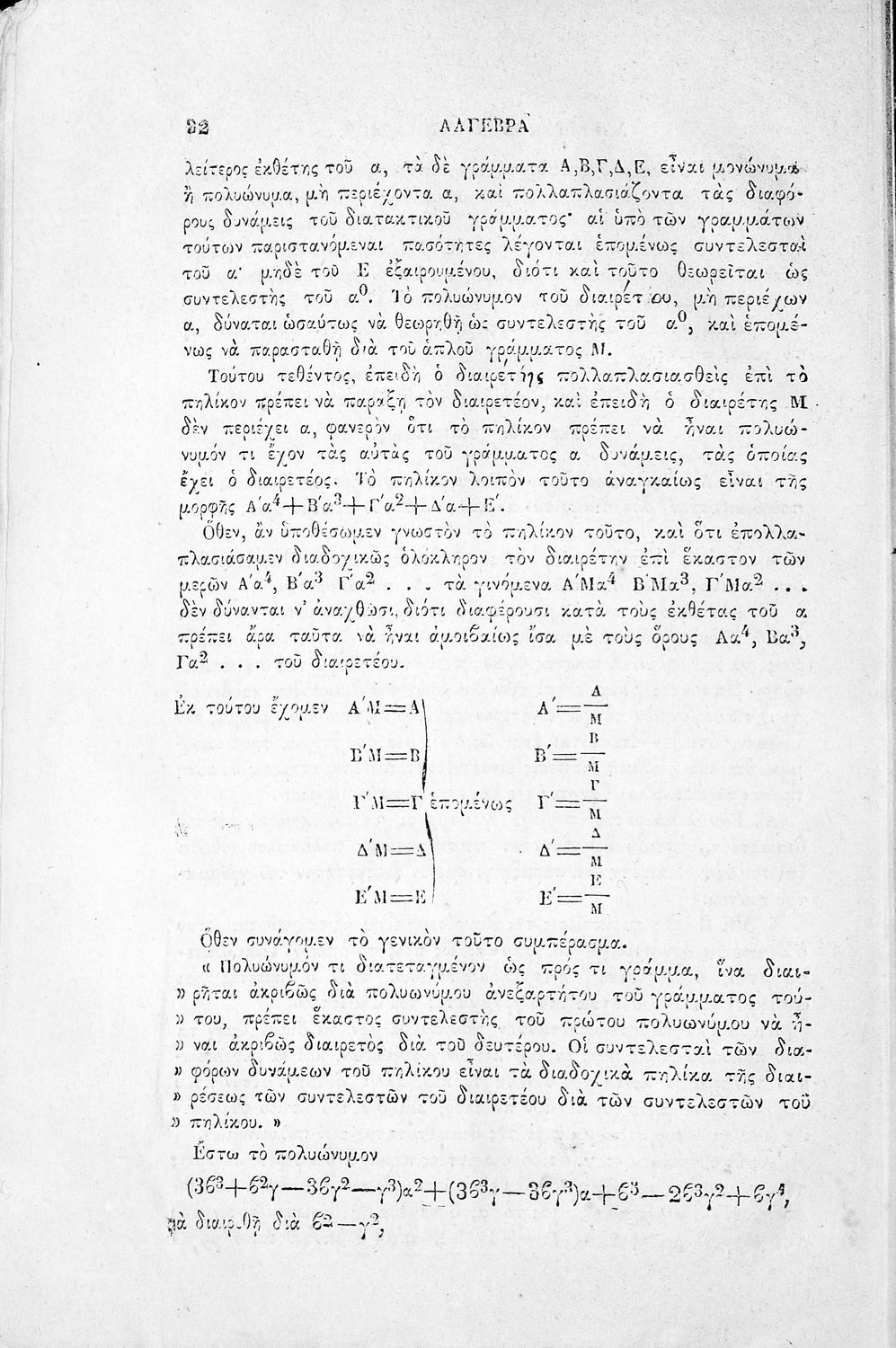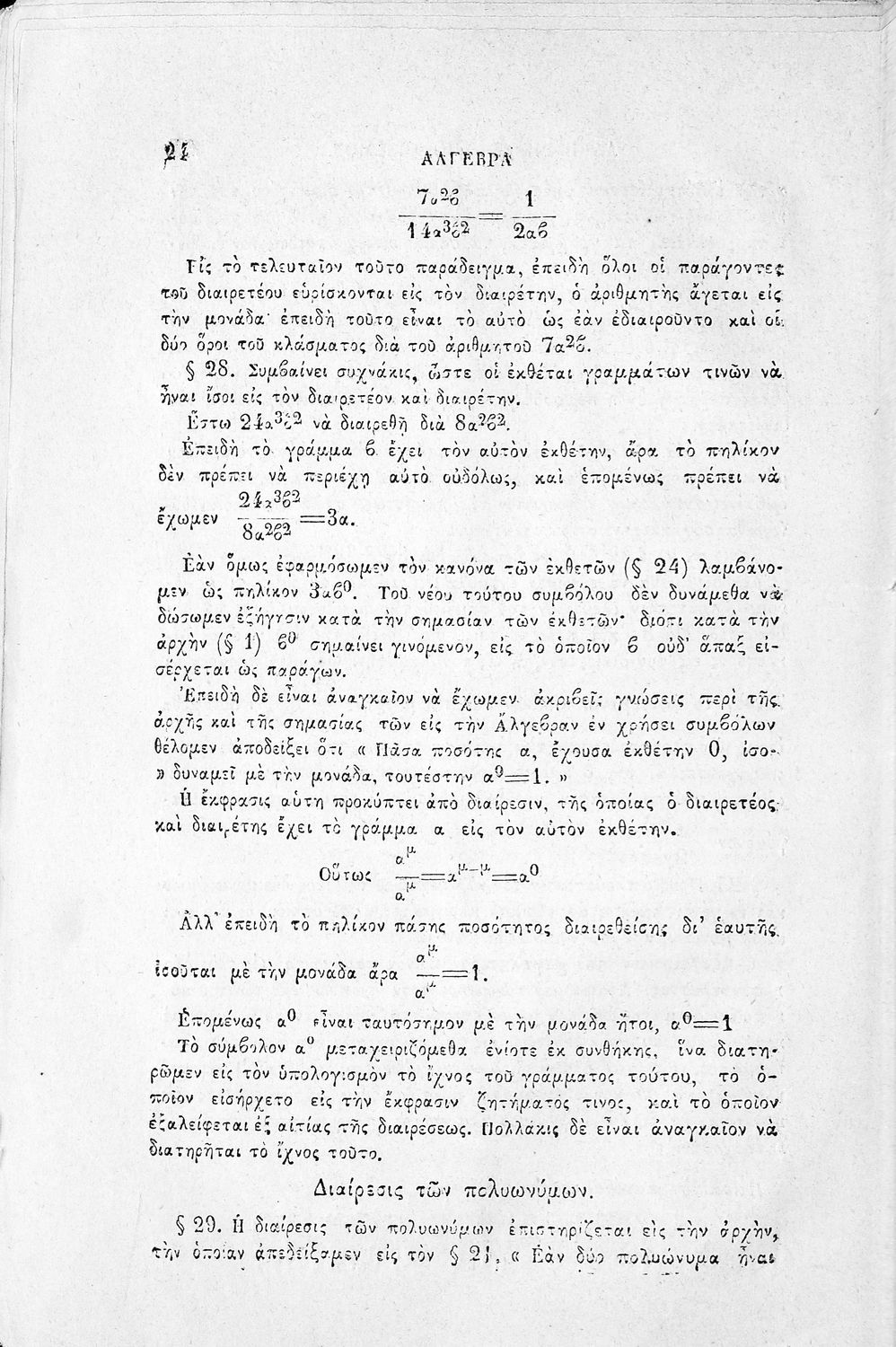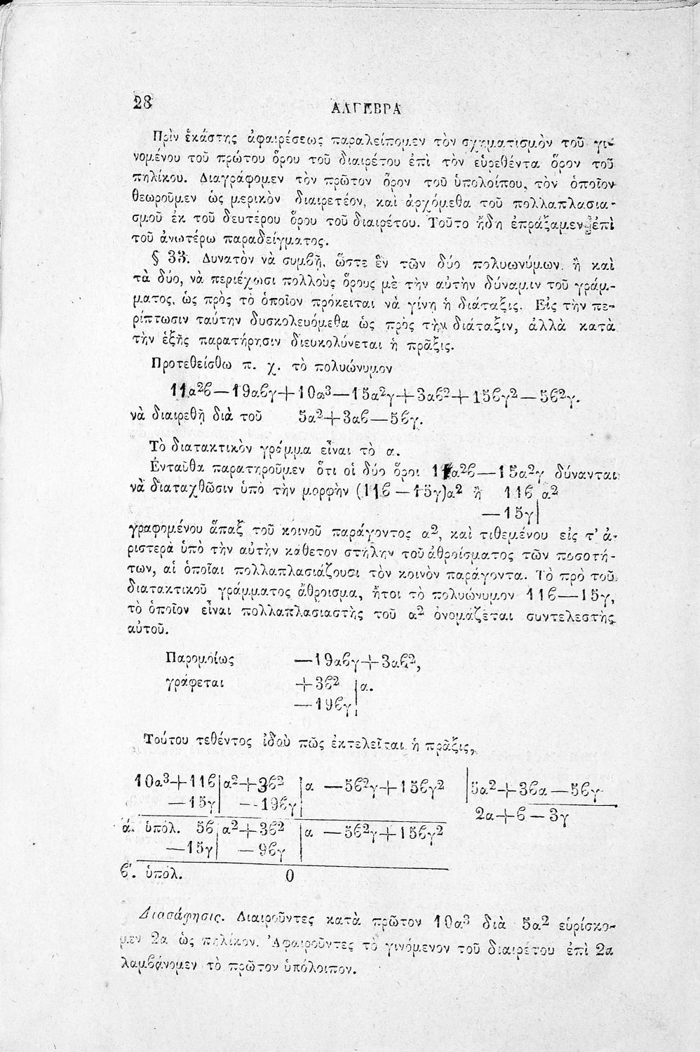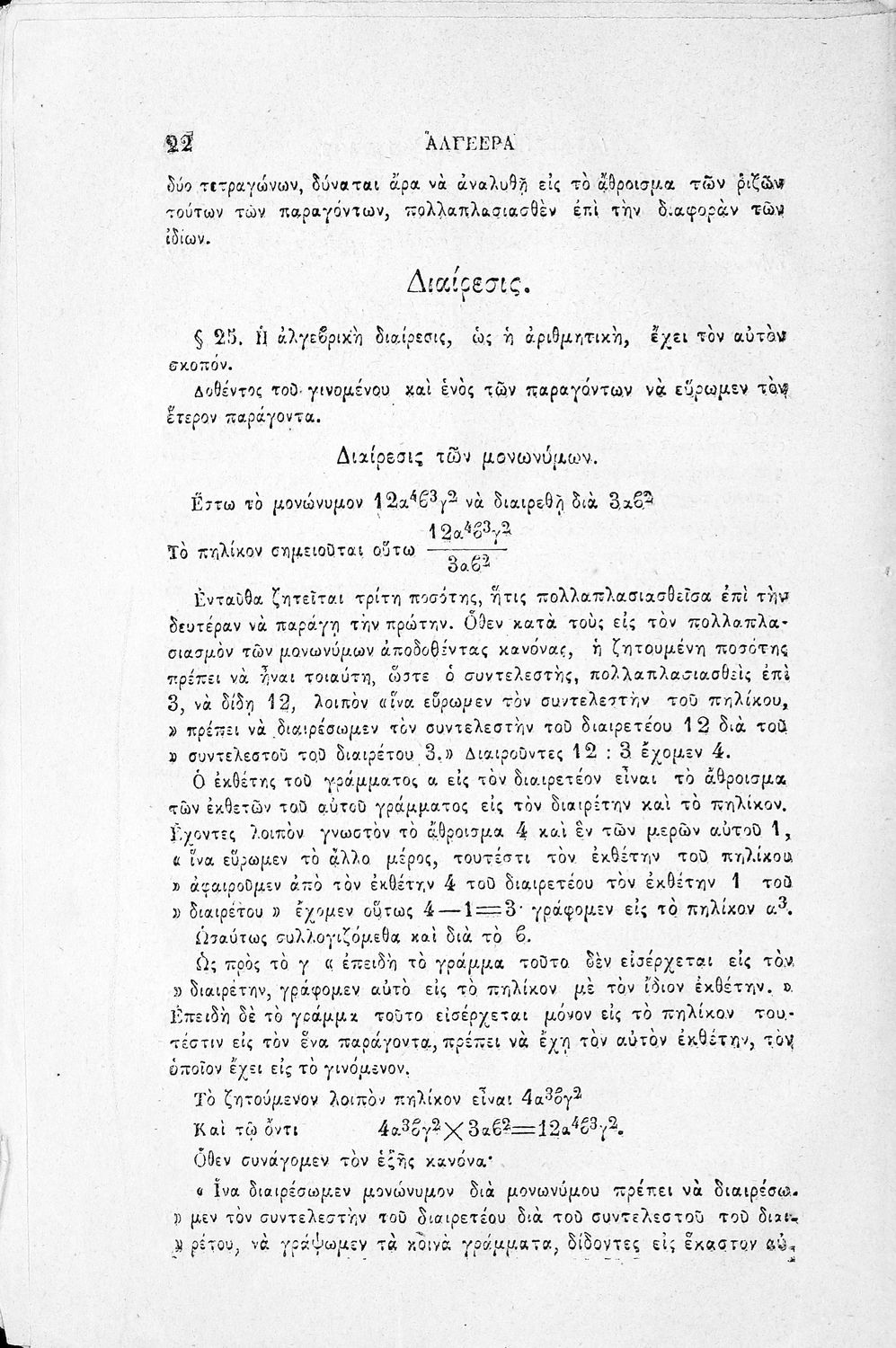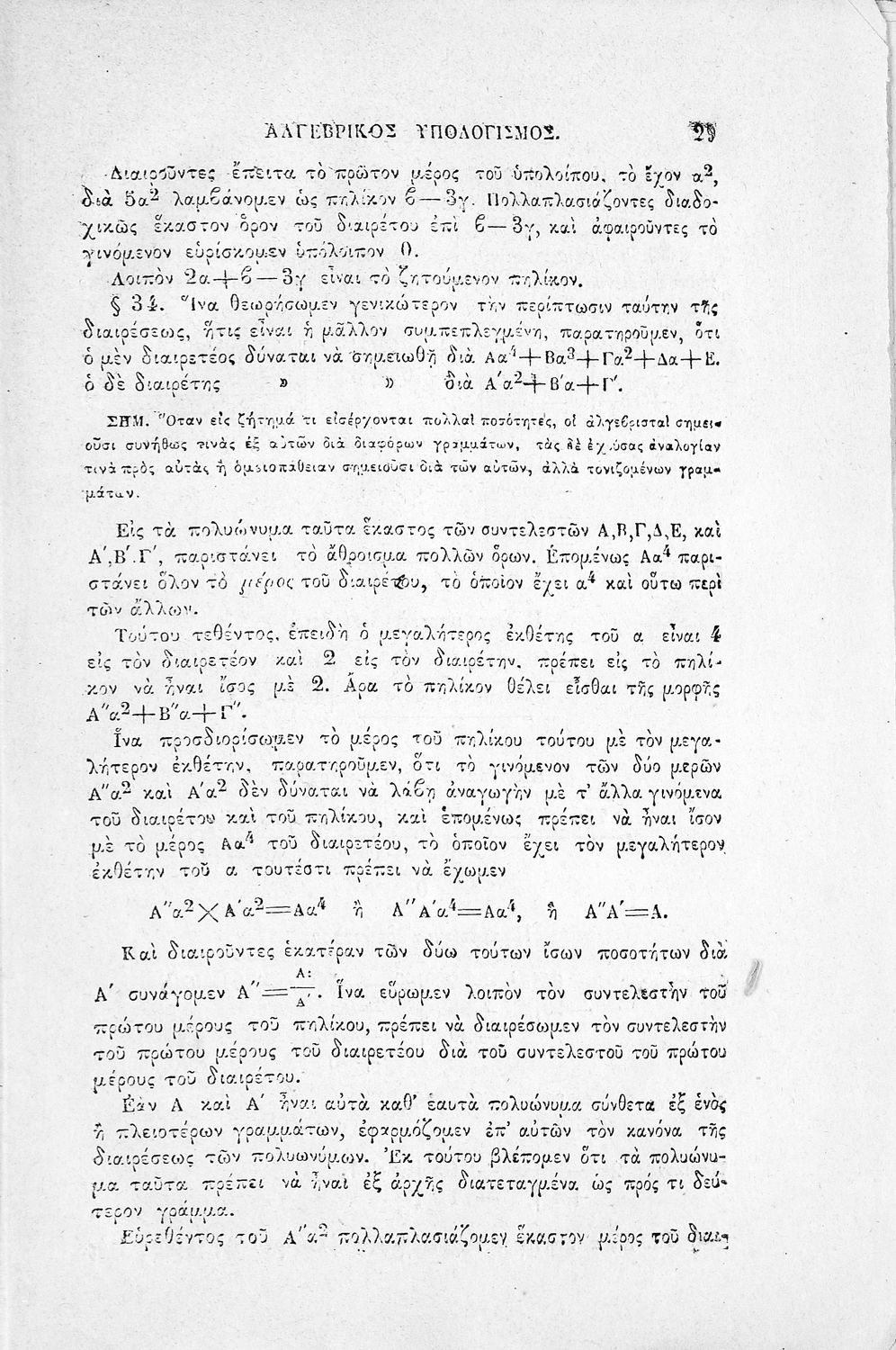 Σχολικό εγχειρίδιο Άλγεβρας Γυμνασίου που περιέχει θεωρία και ασκήσεις. Ο συγγραφέας ήταν υφηγητής στο Εθνικό Πανεπιστήμιο.