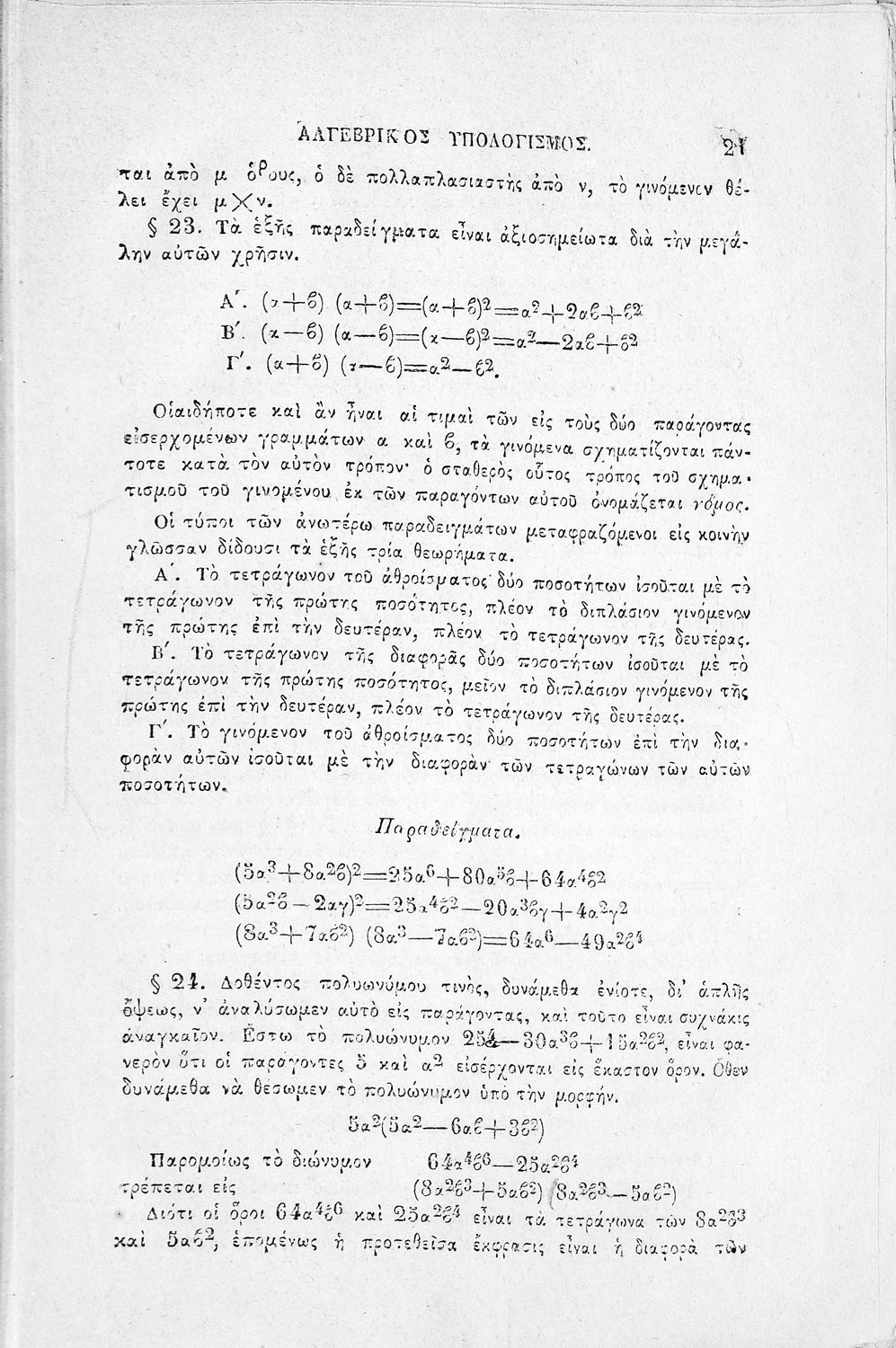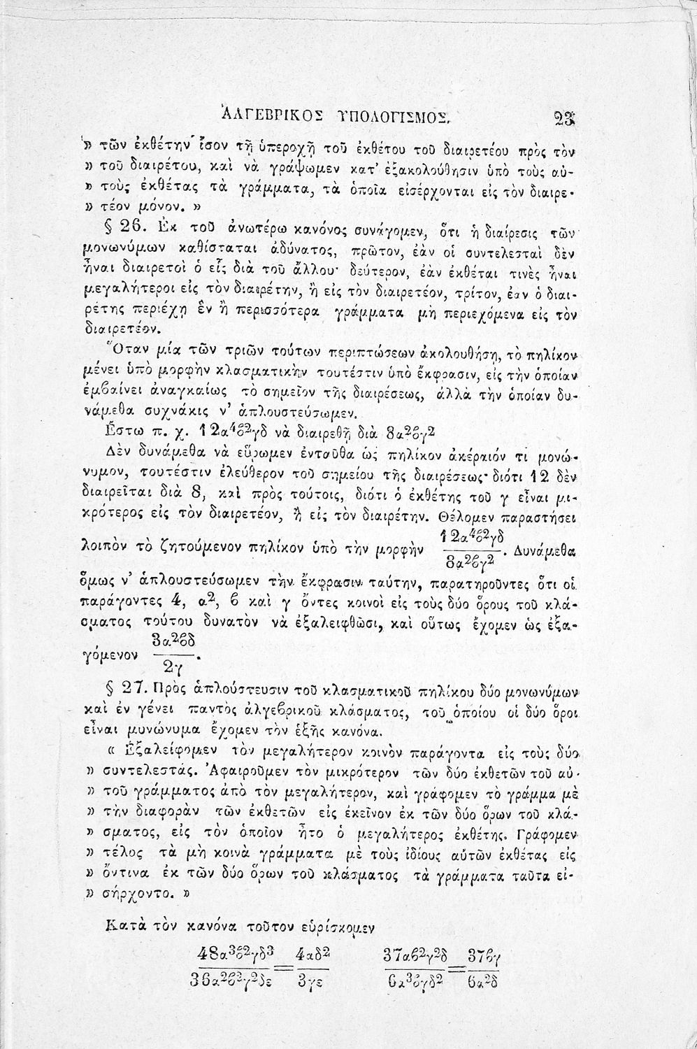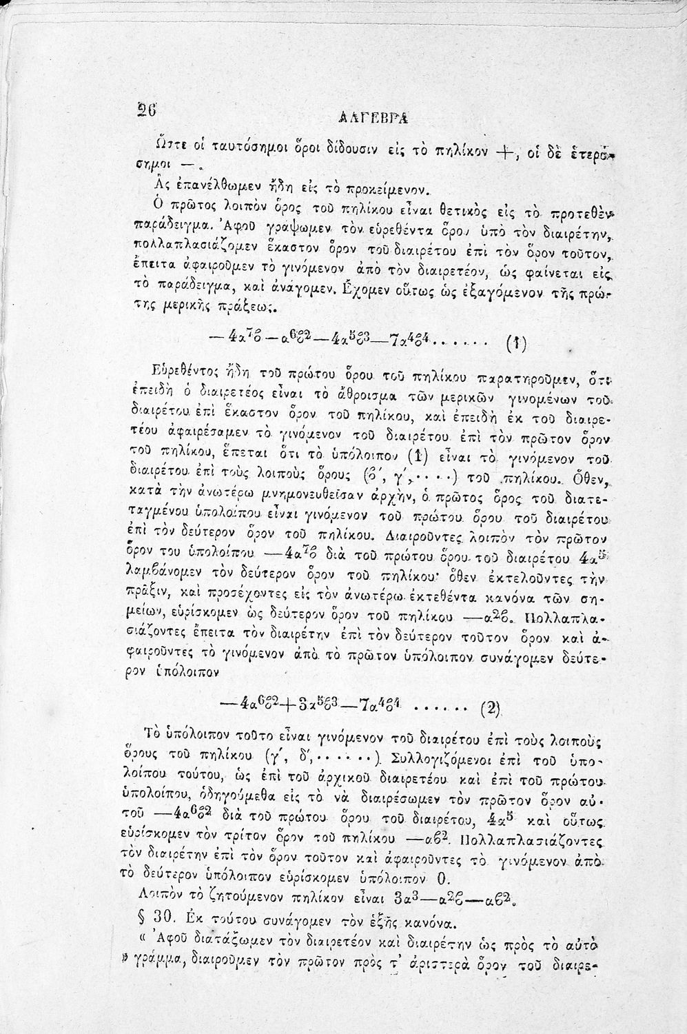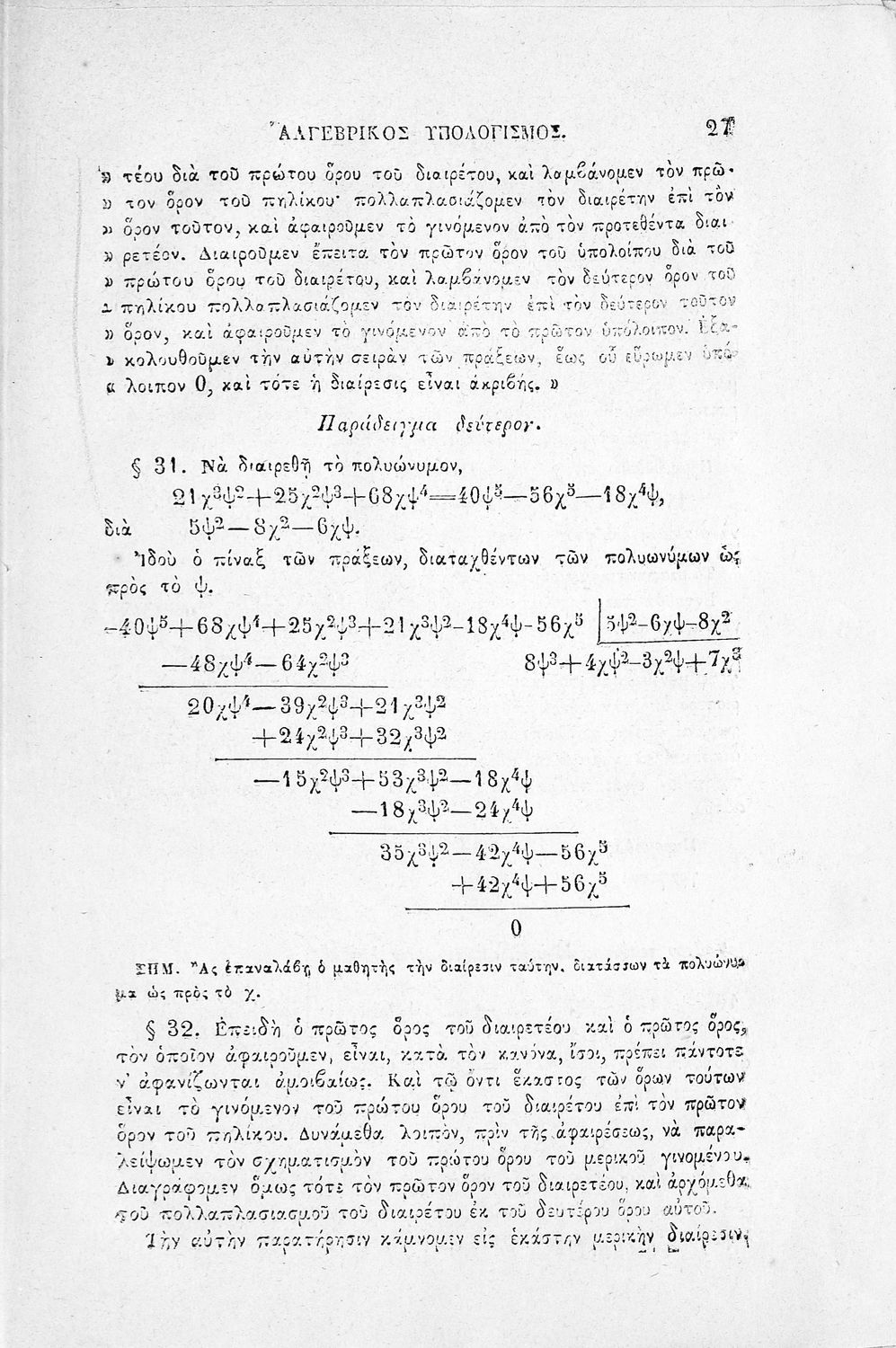 Σχολικό εγχειρίδιο Άλγεβρας Γυμνασίου που περιέχει θεωρία και ασκήσεις. Ο συγγραφέας ήταν υφηγητής στο Εθνικό Πανεπιστήμιο.