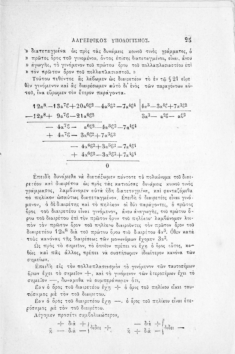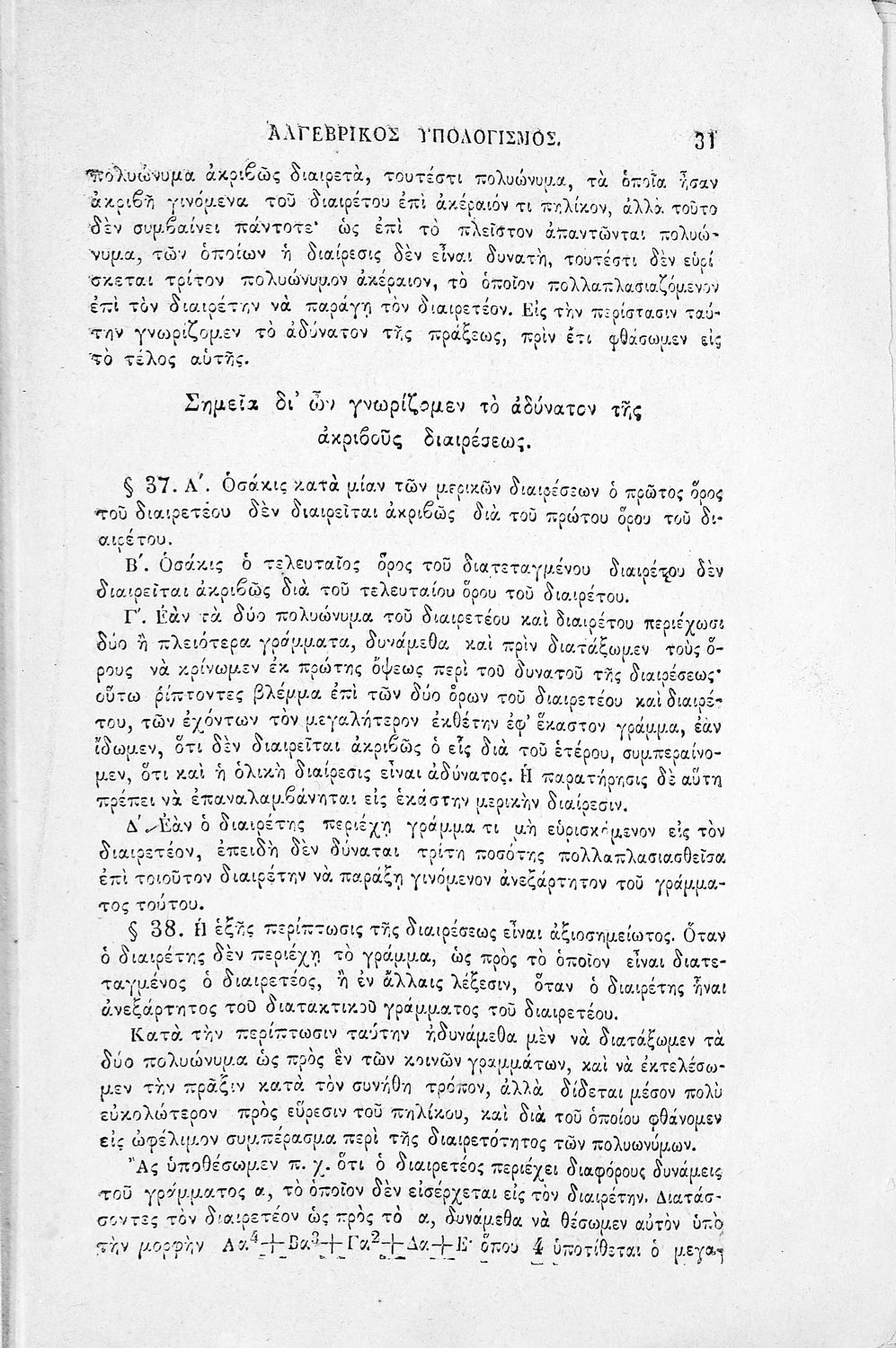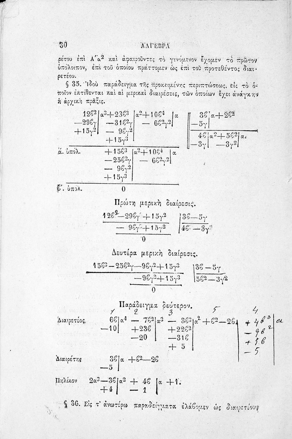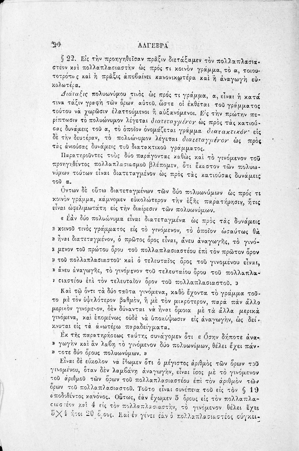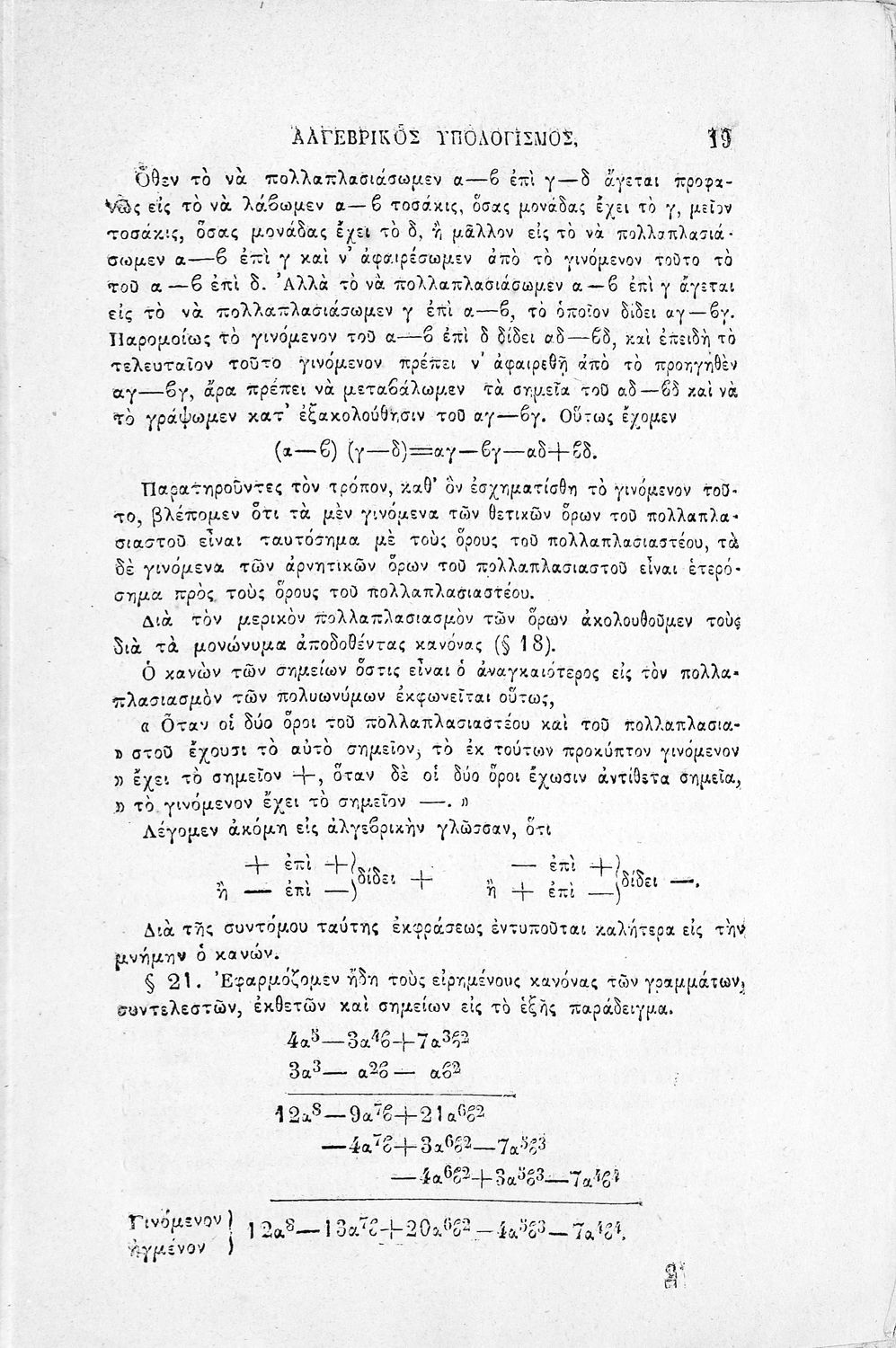 Σχολικό εγχειρίδιο Άλγεβρας Γυμνασίου που περιέχει θεωρία και ασκήσεις. Ο συγγραφέας ήταν υφηγητής στο Εθνικό Πανεπιστήμιο.