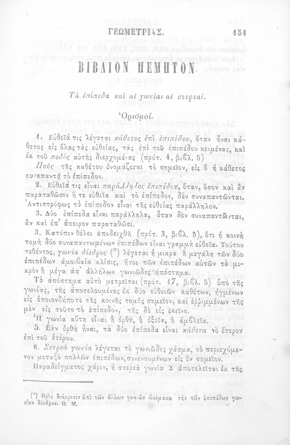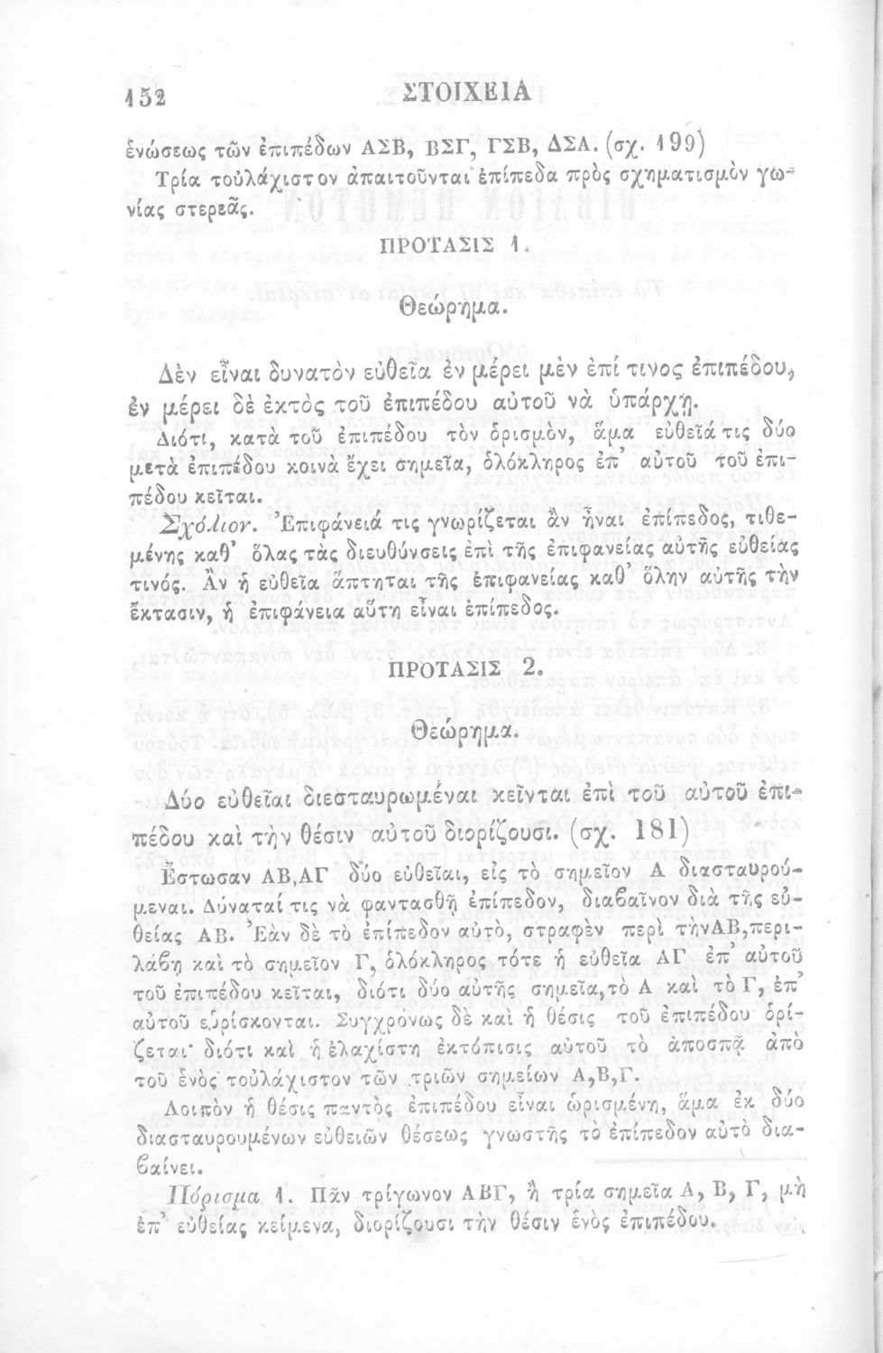 Σχολικό εγχειρίδιο Γεωμετρίας που είναι χωρισμένο σε αξιώματα, θεωρήματα και πορίσματα και εστιάζει στην Επίπεδη Γεωμετρία και τη Στερεομετρία.