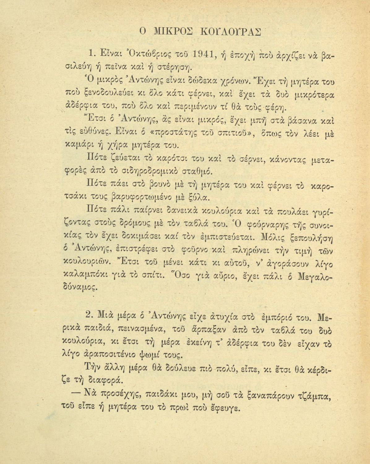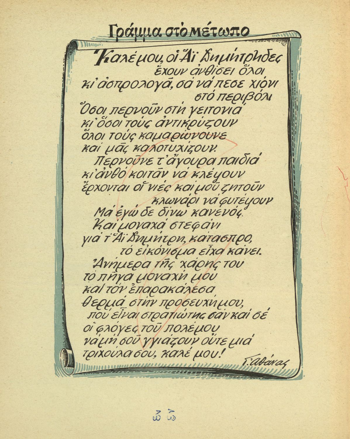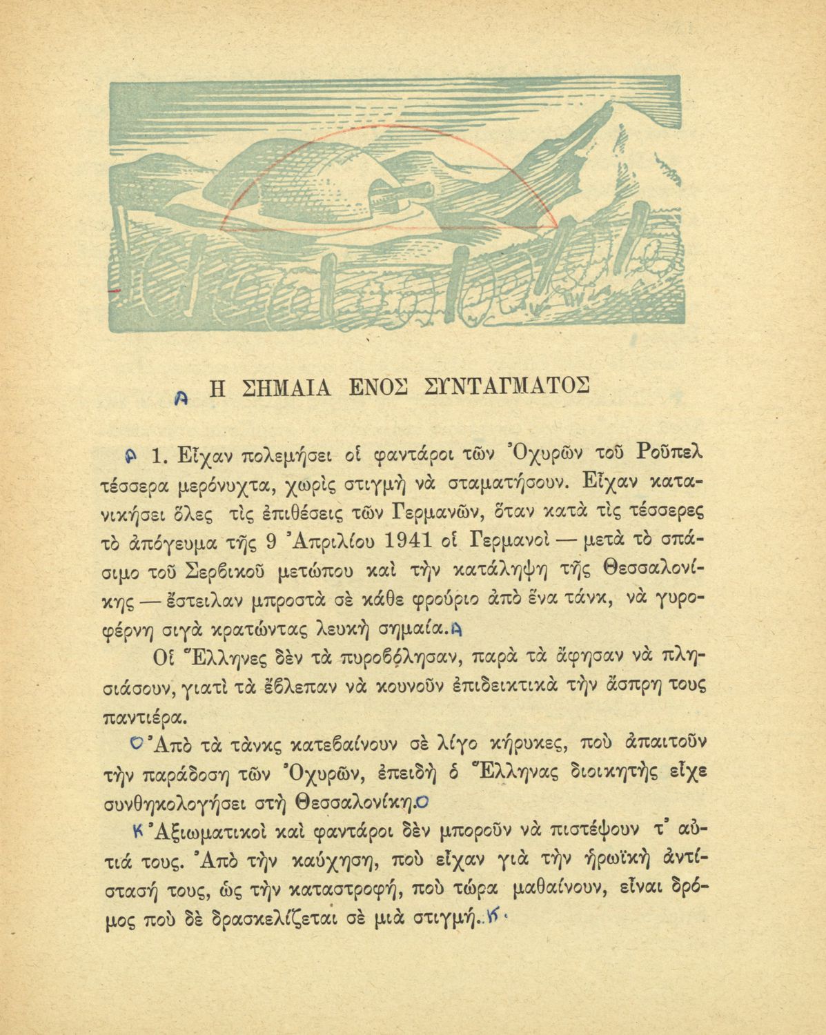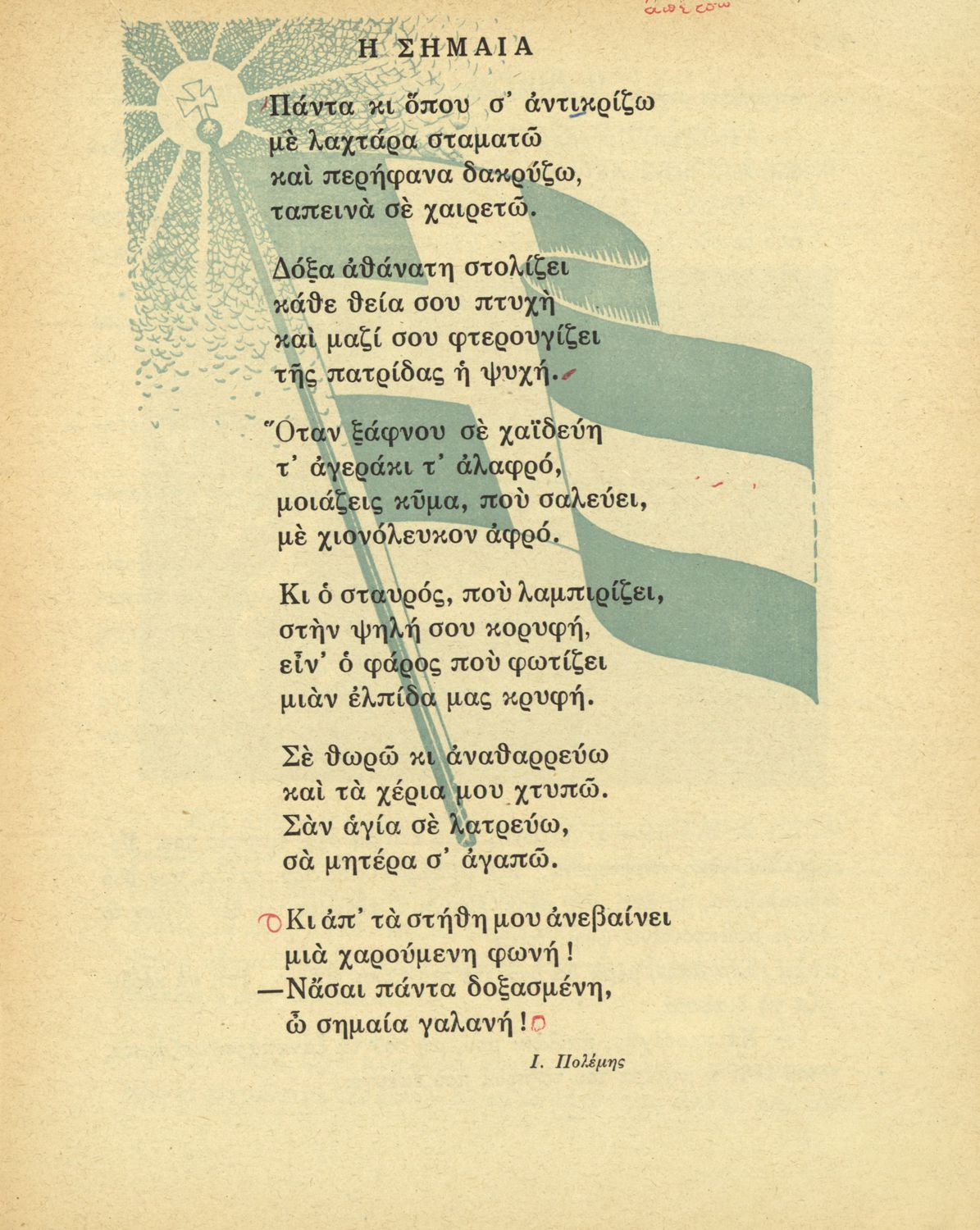 Αναγνωστικό Δ΄ Δημοτικού που περιέχει πεζά και ποιήματα εμπνευσμένα από την ελληνική ιστορία και μυθολογία, την κοινωνική ζωή και την ελληνική φύση.
