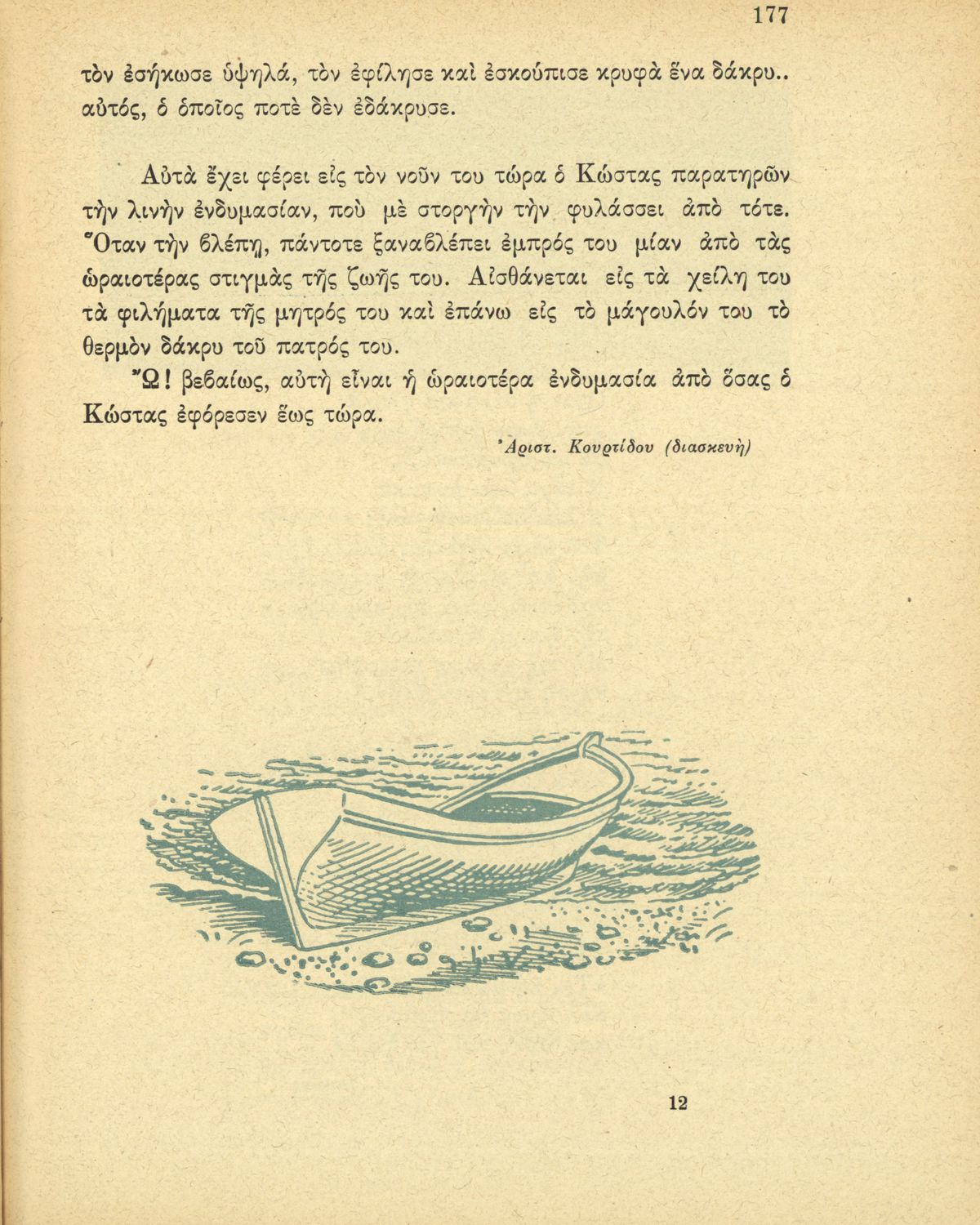 Αναγνωστικό Δ' Δημοτικού που περιέχει πεζά και ποιήματα εμπνευσμένα από τη θρησκευτική, εθνική, κοινωνική και ατομική ζωή, την ελληνική φύση ιστορία και μυθολογία και τις σχέσεις μεταξύ των λαών.