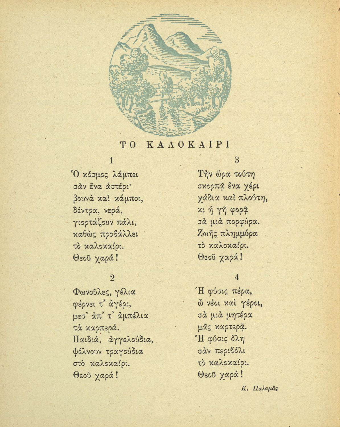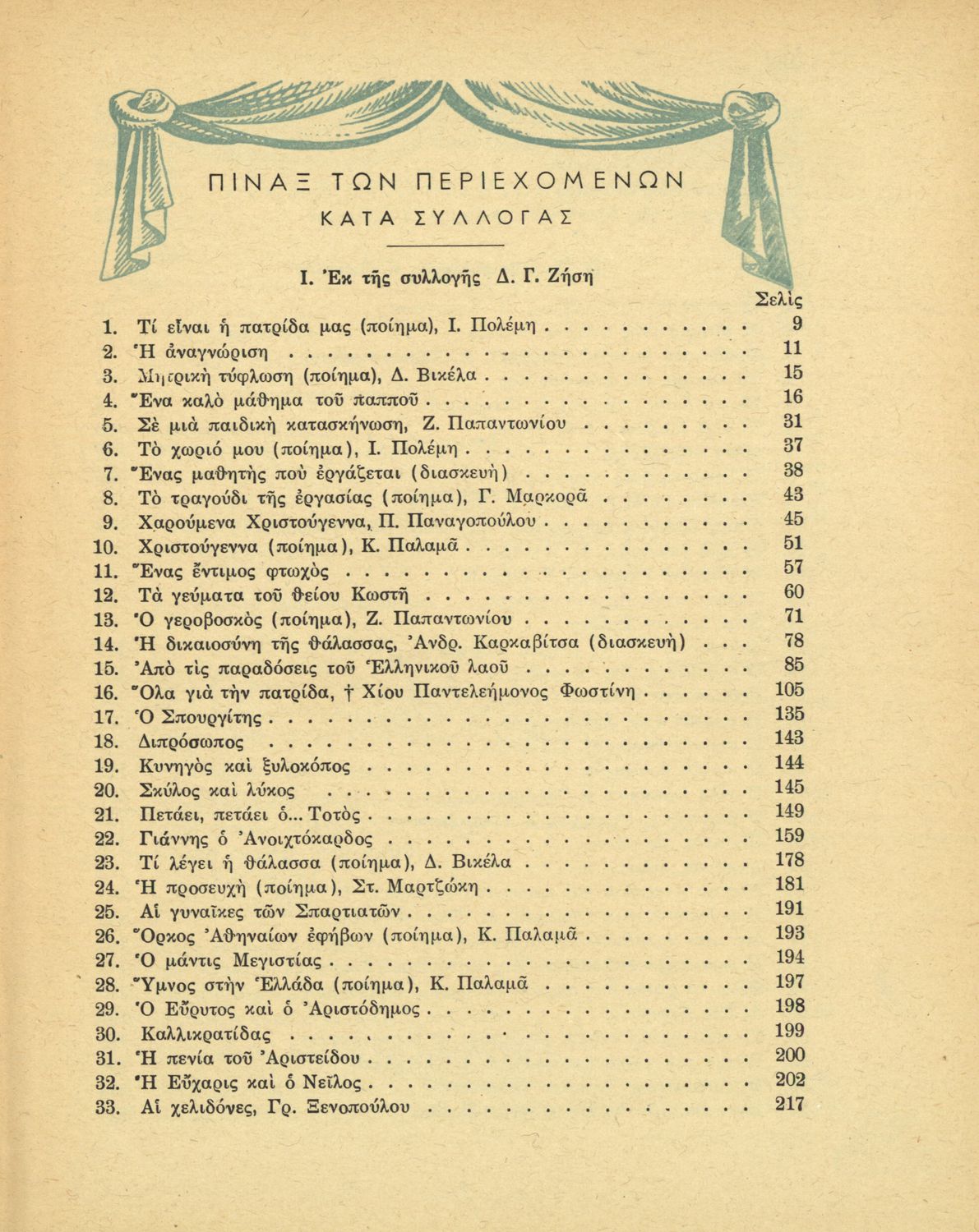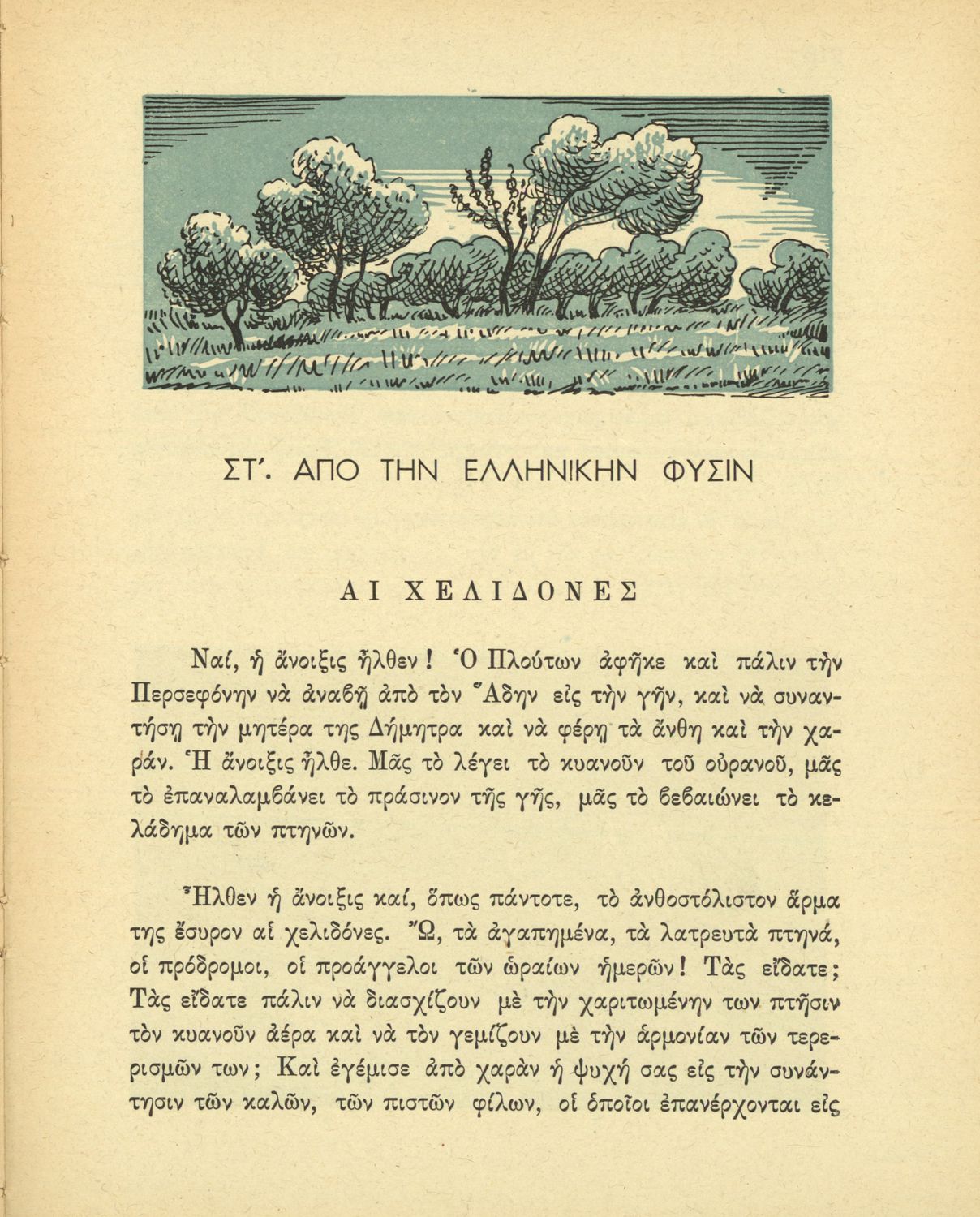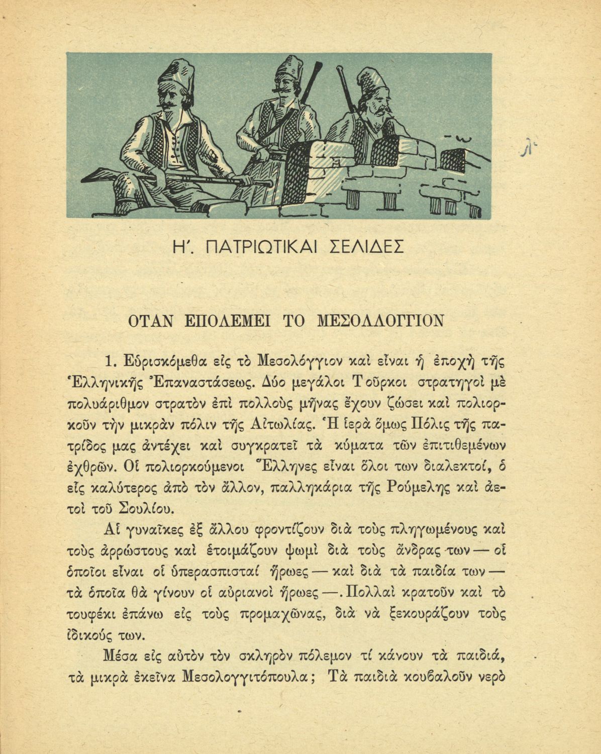 Αναγνωστικό Δ΄ Δημοτικού που περιέχει πεζά και ποιήματα εμπνευσμένα από την ελληνική ιστορία και μυθολογία, την κοινωνική ζωή και την ελληνική φύση.