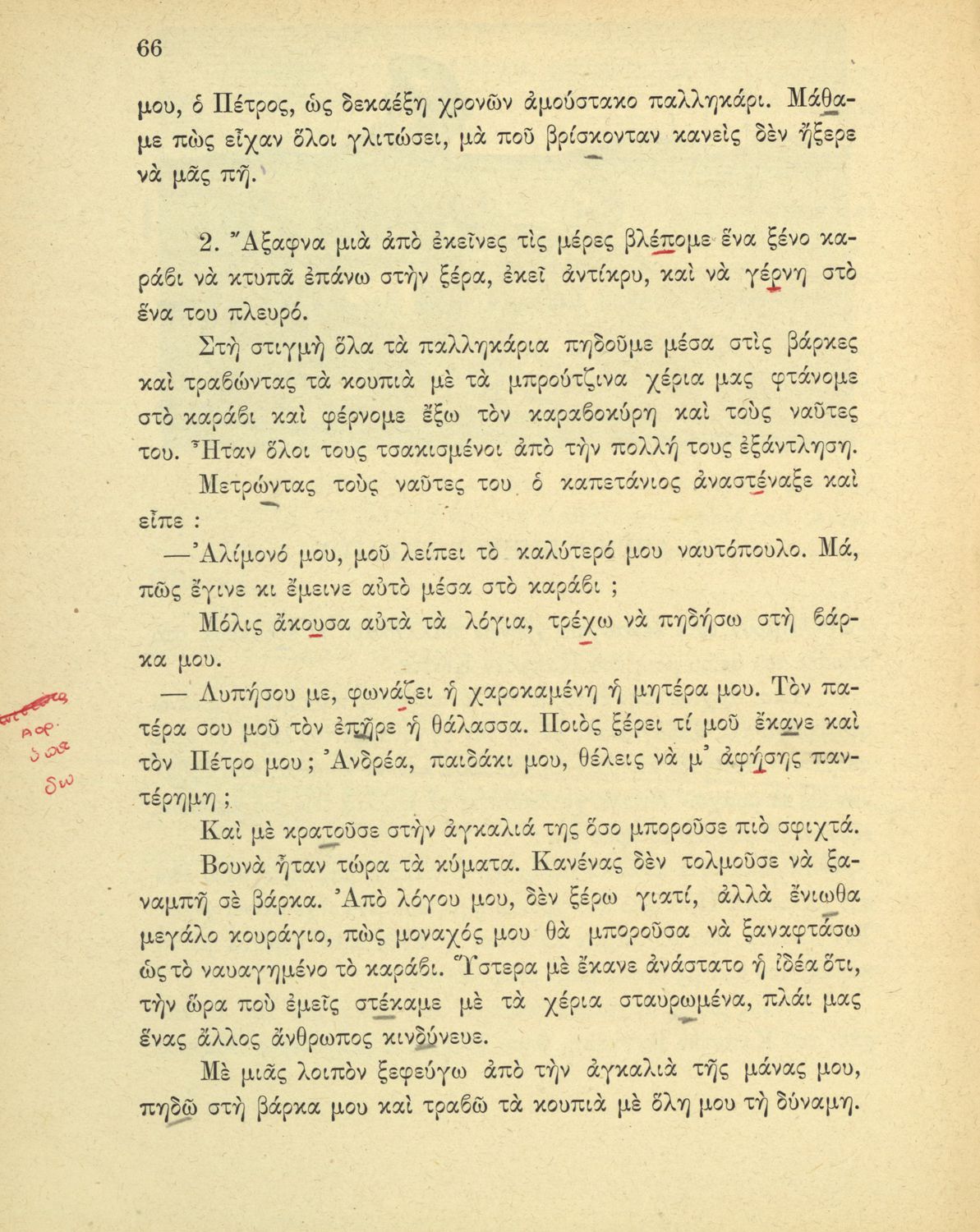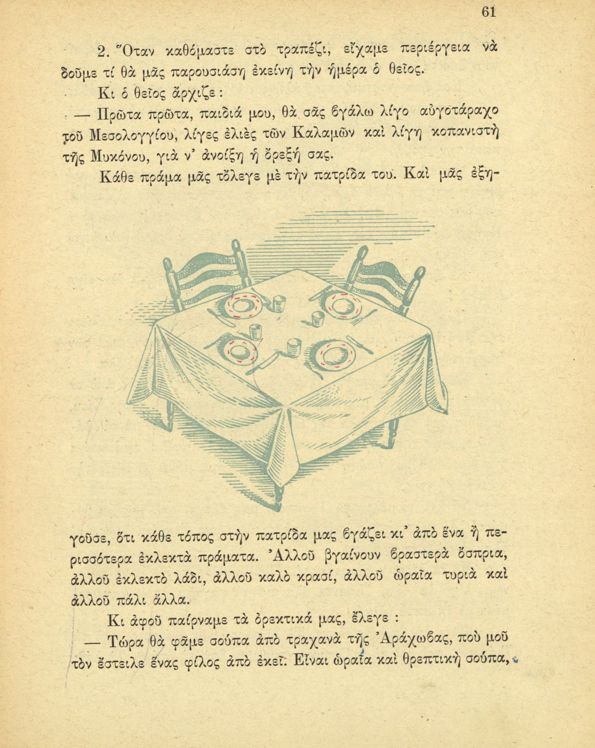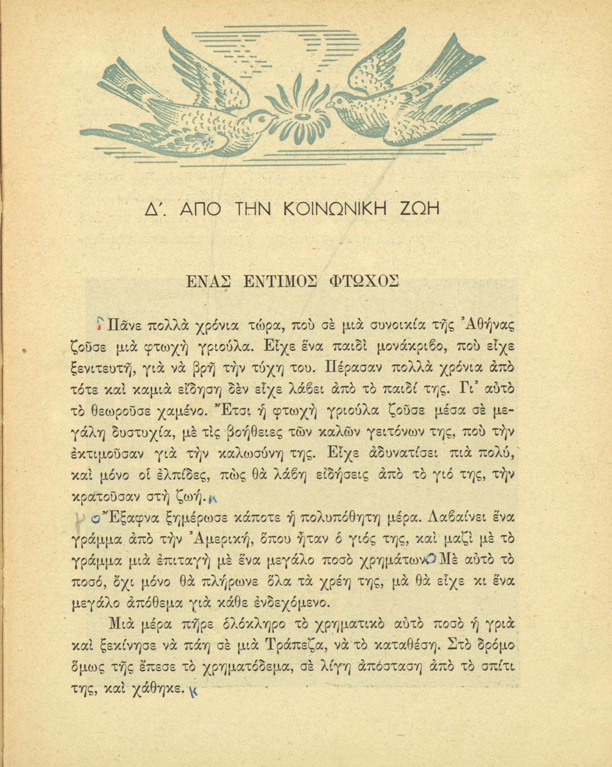 Αναγνωστικό Δ' Δημοτικού που περιέχει πεζά και ποιήματα εμπνευσμένα από τη θρησκευτική, εθνική, κοινωνική και ατομική ζωή, την ελληνική φύση ιστορία και μυθολογία και τις σχέσεις μεταξύ των λαών.